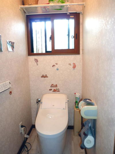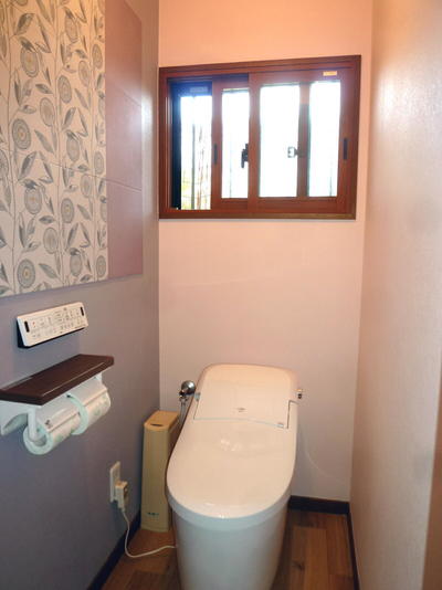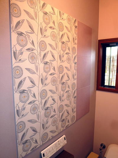 トイレの便器はそのままに、床のクッションフロアシート、壁のクロスを貼り替えました。 また、壁には脱臭・調湿などの効果のあるタイル「エコカラット」を貼り、まるで絵画を飾ったような素敵な空間になりました。