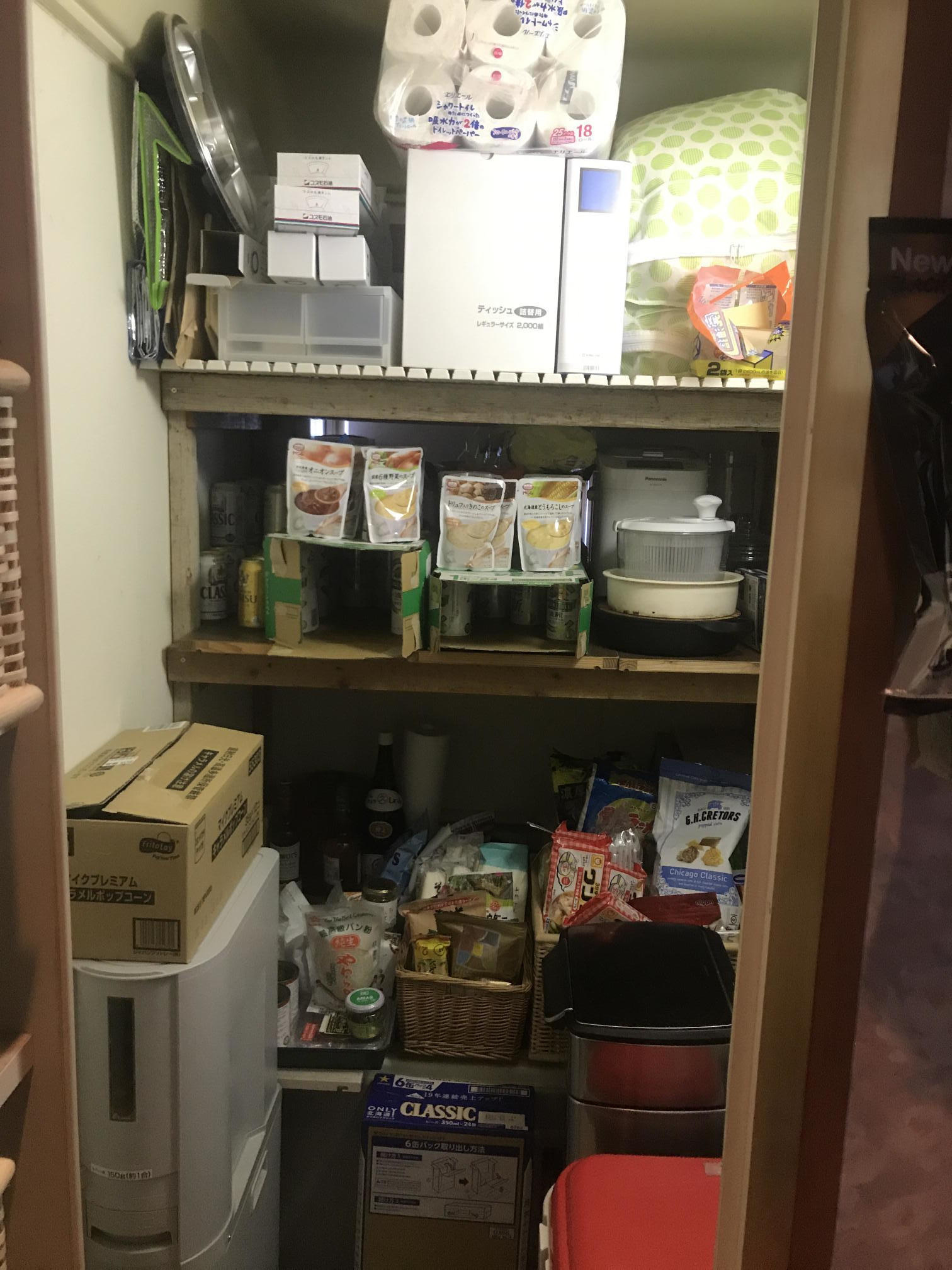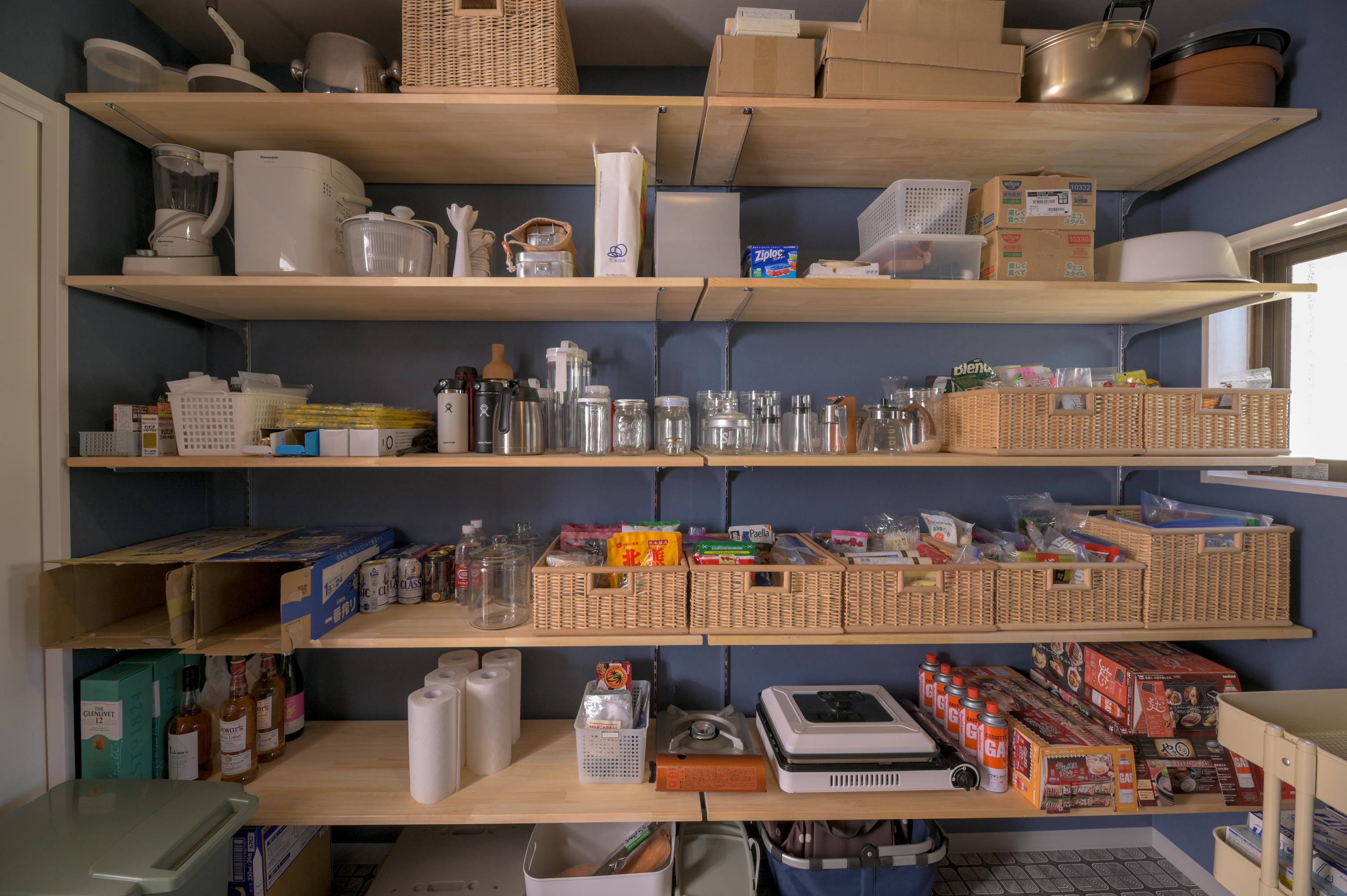 約6帖の広さのパントリーは稼働の棚を両側に配置することで、食品・食器・防災グッズなどすべてを一目で見渡すことができ、何がどこにあるか、何が足りなくなりそうかとても管理しやすい収納になりました。