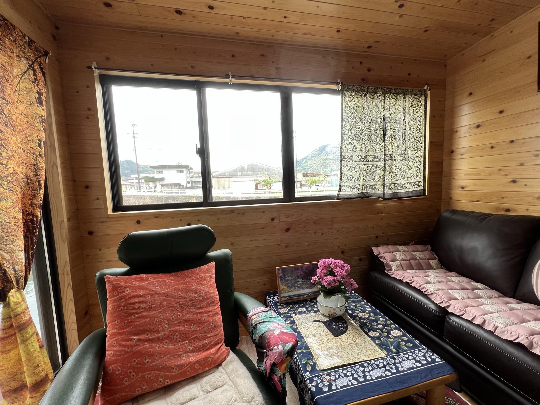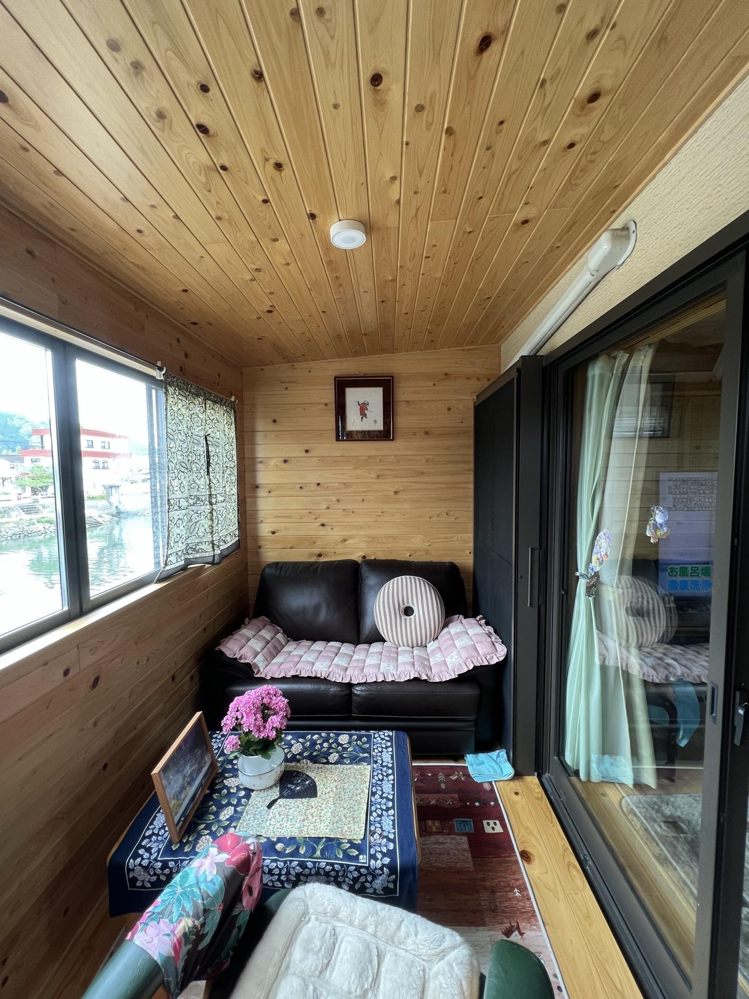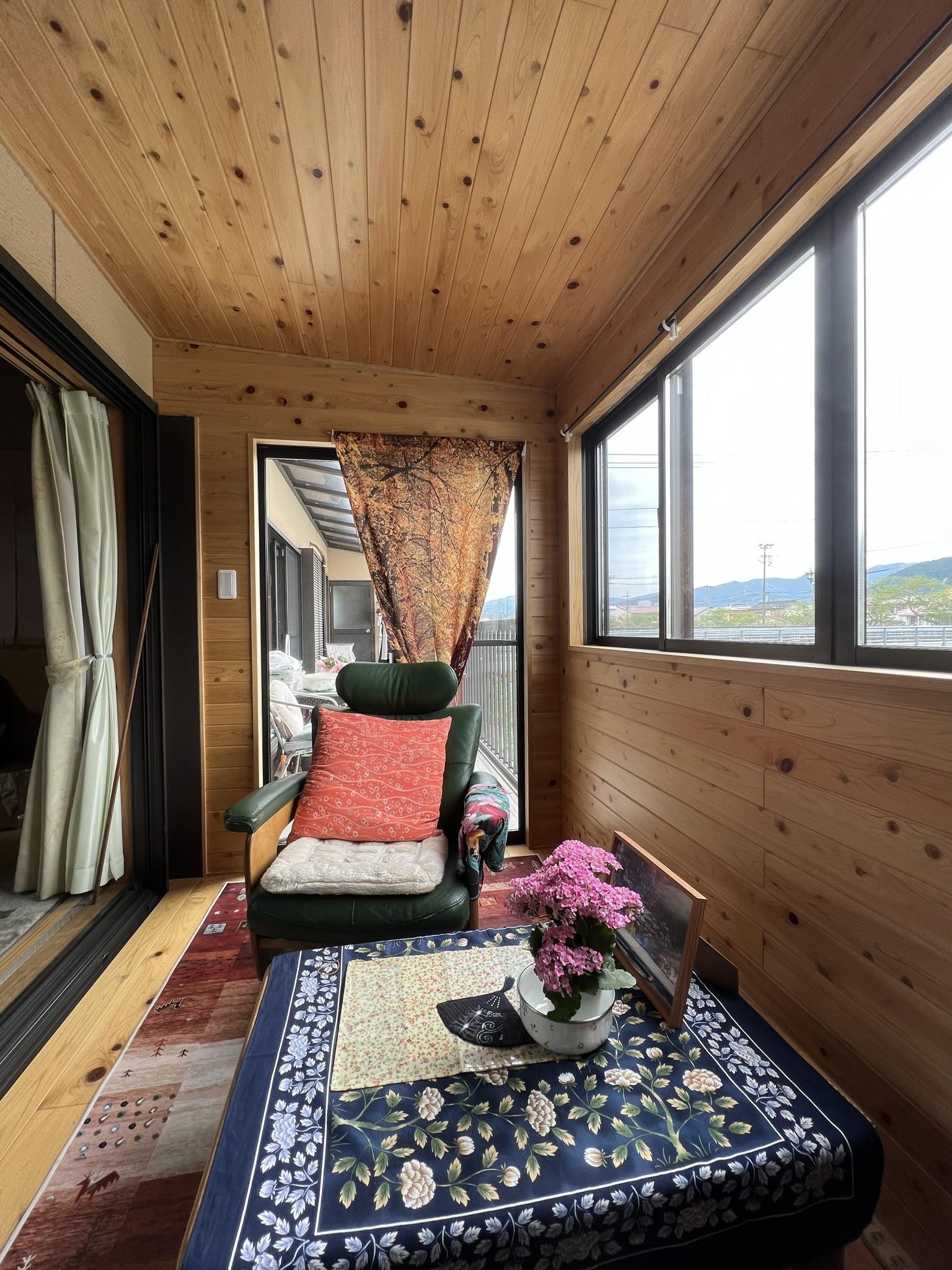 サッシを取り付け、床、壁、天井には桧の板を張り、リビングから続く狭いながらもゆっくりとくつろげる部屋になりました。