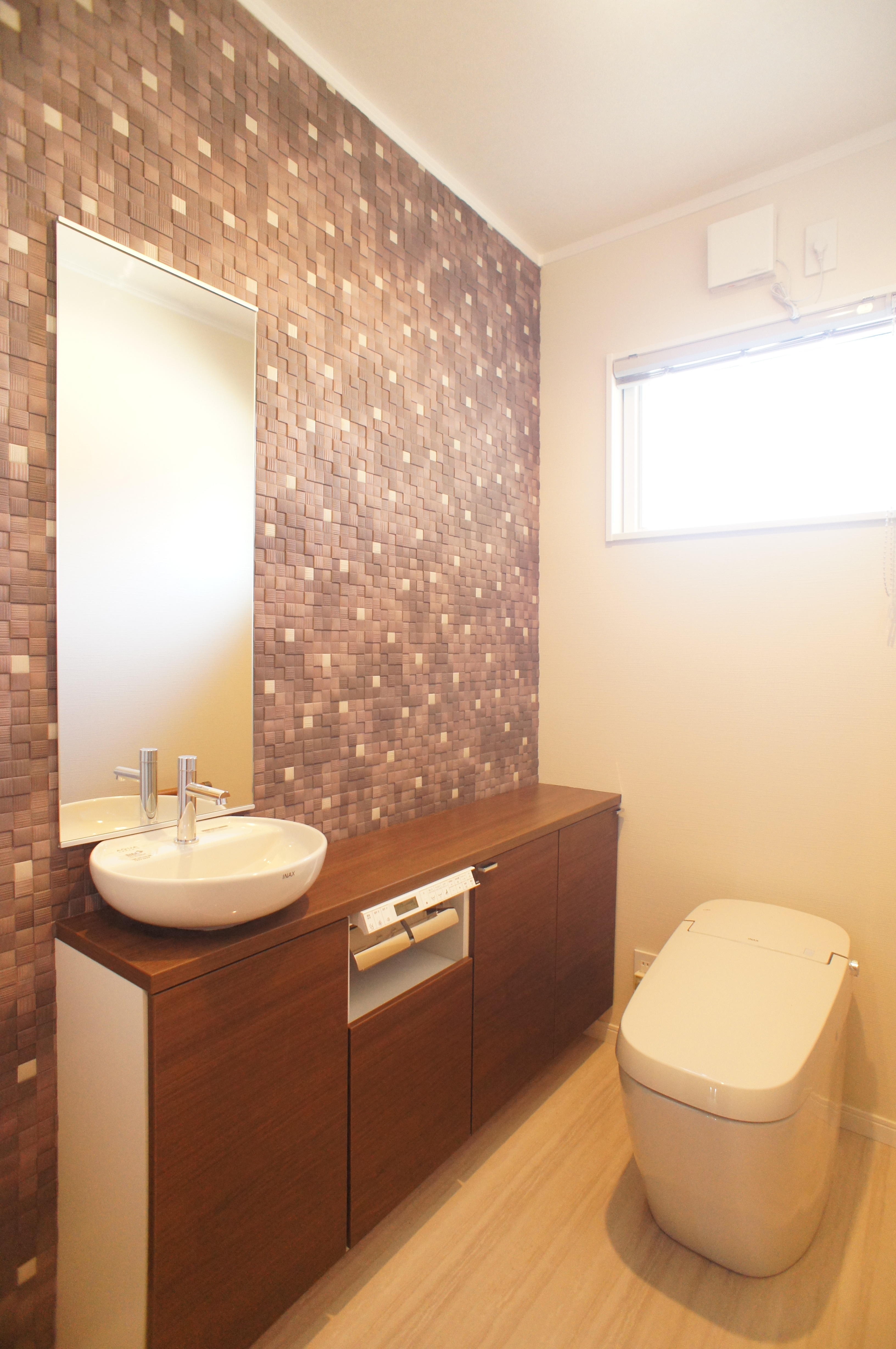 トイレリフォームのご紹介です。 LIXILの最高峰トイレ『サティスG』に手洗いキャビネット『キャパシア』の組み合わせです。 壁には消臭や調湿の機能がある『エコカラット』仕上げとし、レストルームとして落ち着く空間に仕上げました。