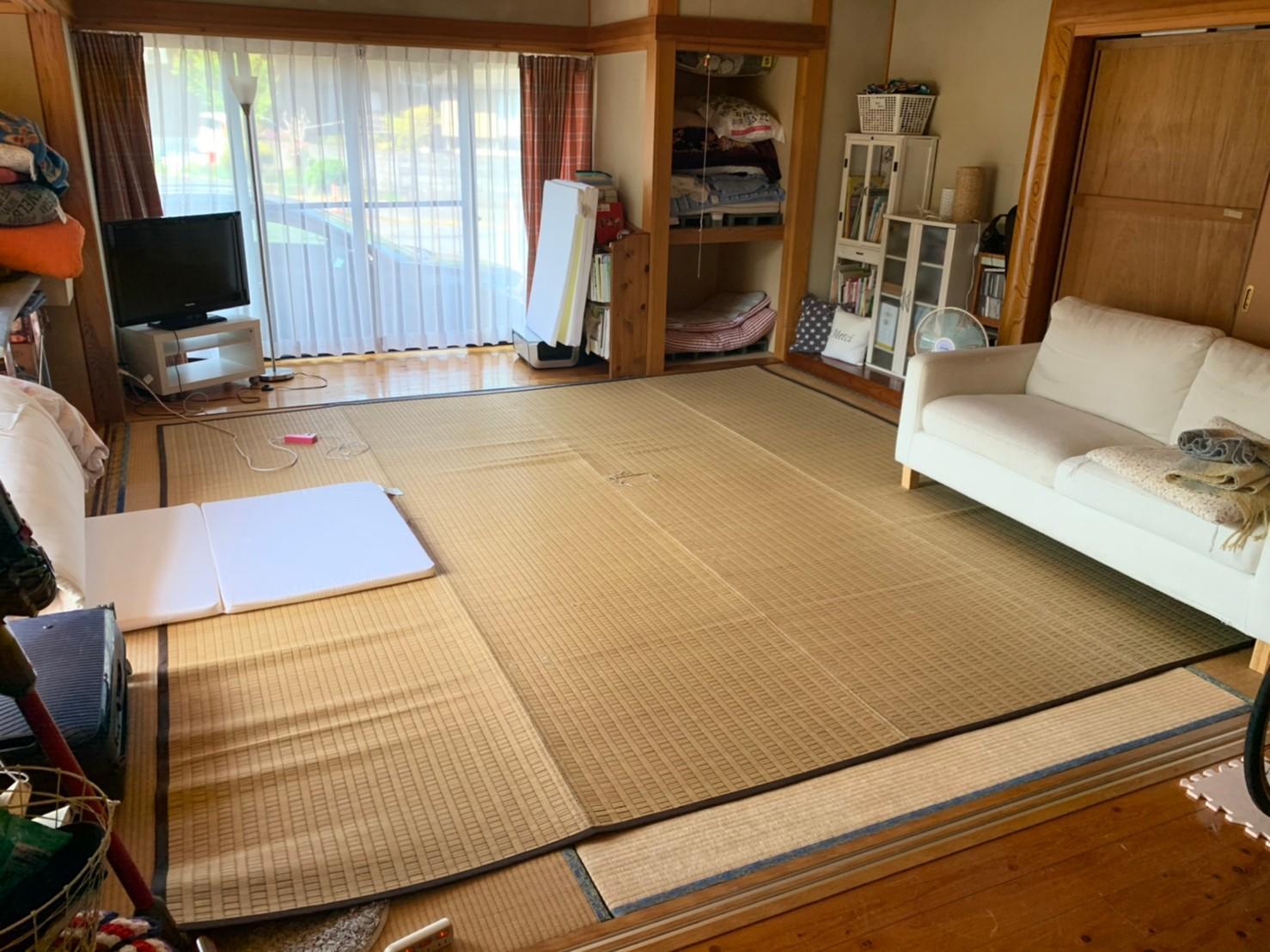 家族のくつろぎ空間として使っていた和室。 愛犬も一緒に過ごすので、どうしても痛んでしまう畳を敷物でカバーしていました。