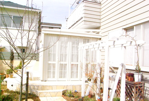ガーデンニングがご趣味のお施主様ご夫妻。ご主人手作りのパーゴラがあった部分を、ちょっとお洒落なサンルームにリフォームしたいとのご要望でした。