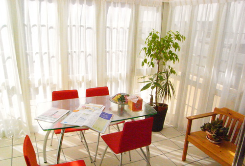 リビングルームの一角になるおしゃれなサンルームを増築です。 庭より約30cm高く12畳ほどのポーチを作り、その上にエクシオールを建てました。現在の玄関前と同じジュラストーンを門からのアプローチとポーチに張り、サンルーム内は150角の明るいタイルを貼りました。 エクシオールは密閉性も高く、BOSE社のオーディオから流れるジャズがとても良い音で、お洒落な空間をさらに素敵に演出しています。