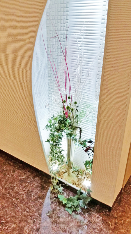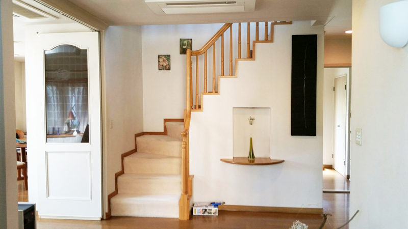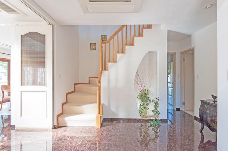 玄関ニッチが既存の空間に合っていなかったので、曲線型のニッチに造り替えました。背面の壁には湿気と臭いを分解してくれるエコカラットを貼り、上下に間接照明を埋め込み、エレガントな雰囲気を演出しています。