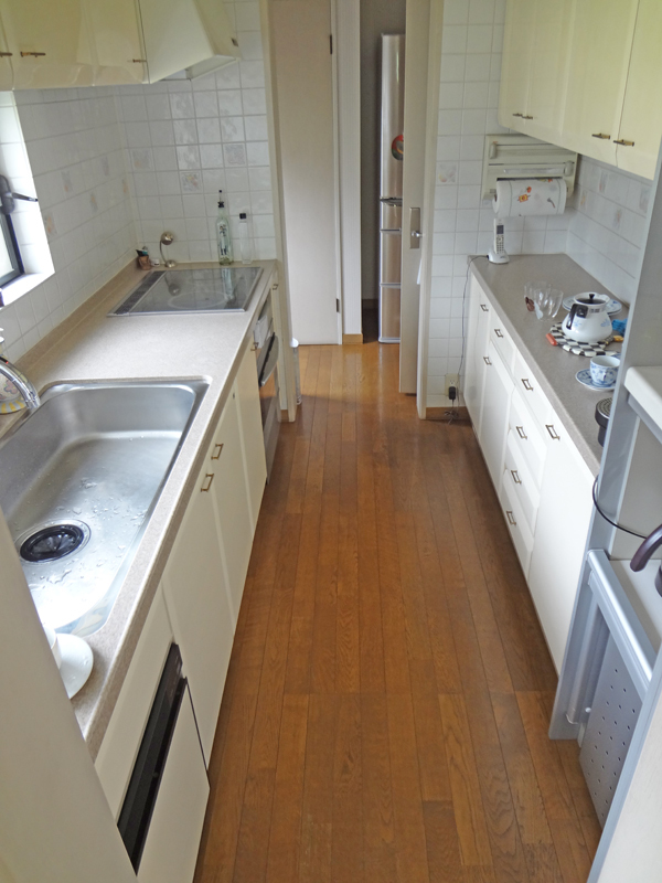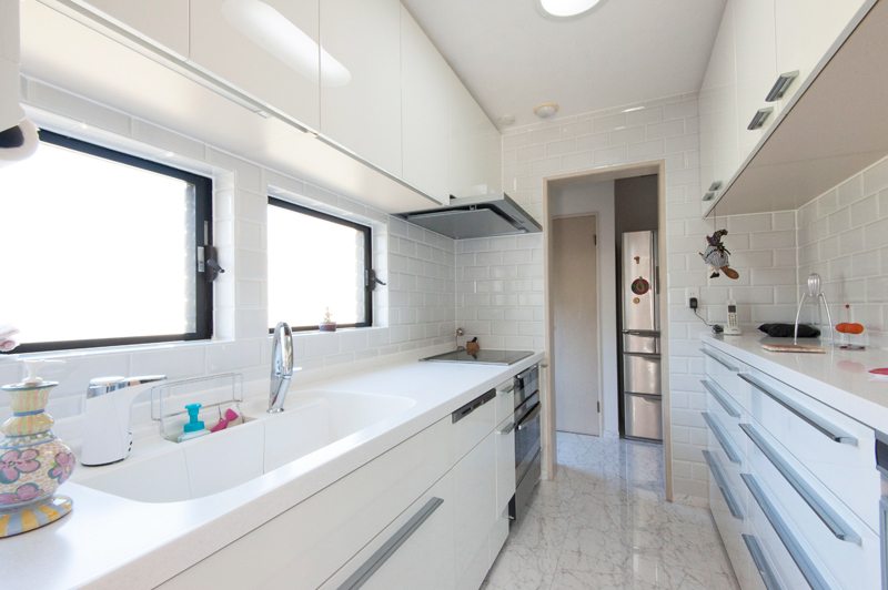 白くスタイリッシュなシステムキッチン リシェルSiに交換しました。キッチンに合わせて収納や床も白く統一されたことで、洗練された空間に生まれ変わりました。