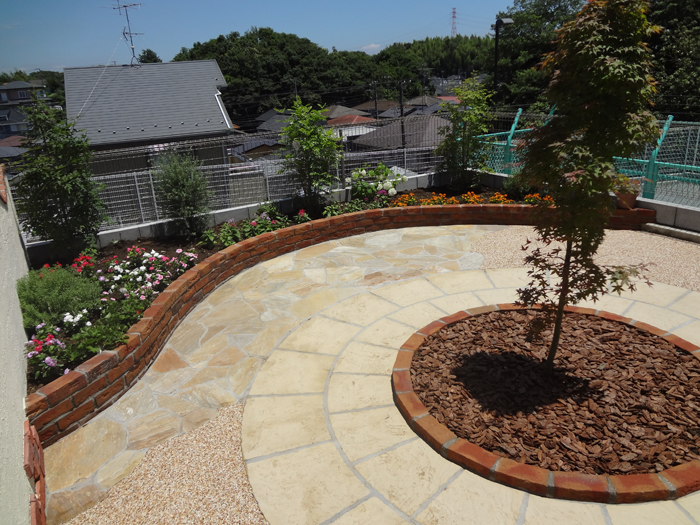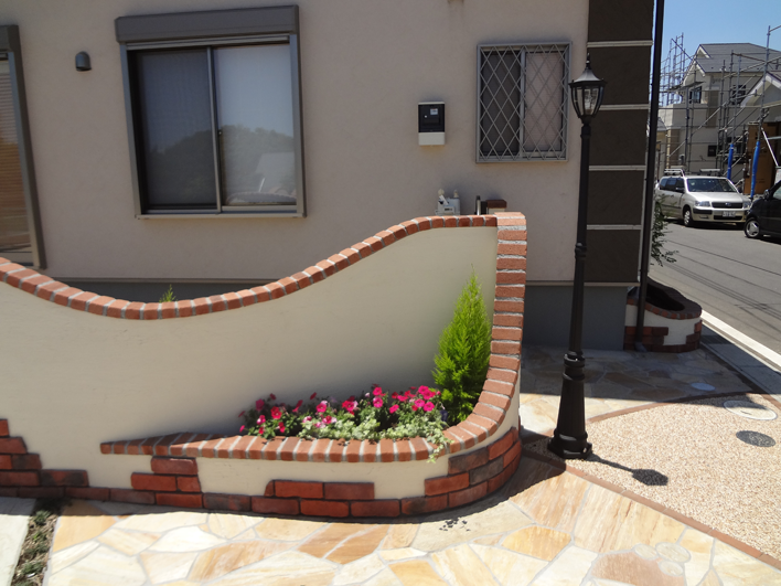 壁の上面にレンガを利用し、壁を縁取り、デザイン的に美しい仕上がりになりました。