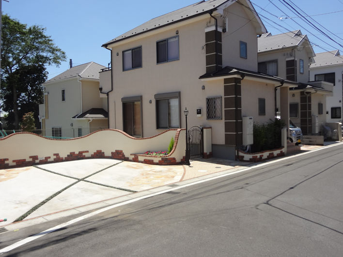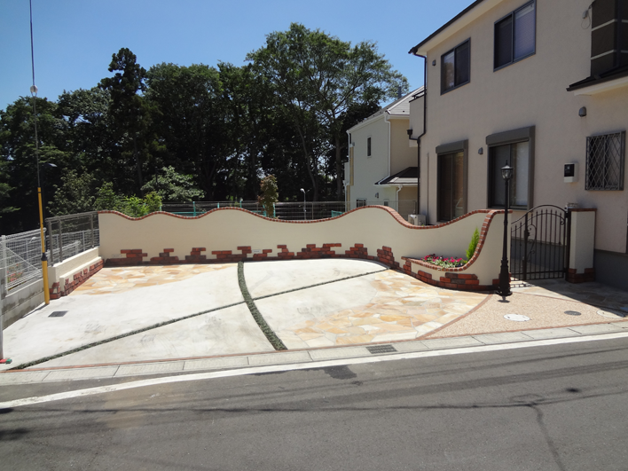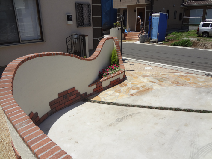 波状の白い壁に明るいレンガの色が映え、明るいエクステリアになりました。駐車スペースをしっかり確保したので、見た目だけでなく機能面でもすぐれています。