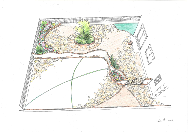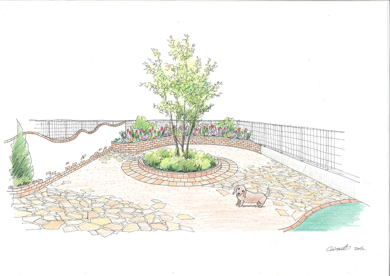 お庭部分のパースです。奥様から「おしゃれで柔らかい感じのお庭にしたい!」とのご希望をうけ、作成致しました。