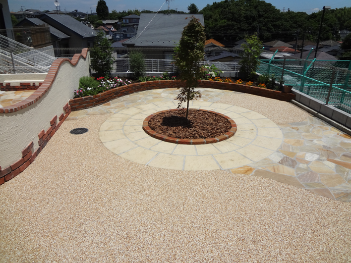 お庭の中央にはサークル状の花壇を設けました。植えたのは紅葉です。奥にも広いスペースの花壇を設けたので、ガーデニングがもっと楽しめます。