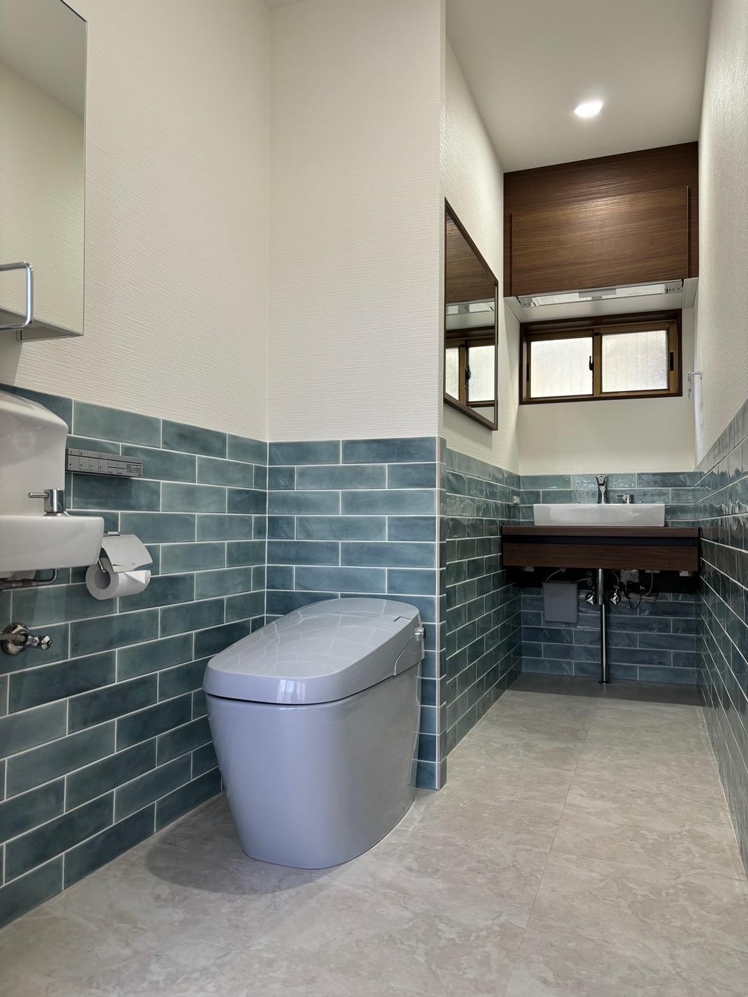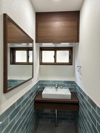 車いすでは入口が狭く段差があり利用が困難でした。少しでも使い勝手がよくなるようにと細かな所まで配慮して下さり、とても感謝しています。ブルーのタイルを使った清潔感のあるサニタリールームにしてほしいとお願いしたところ、とてもきれいなタイルを見つけてきてくださりました。明るく落ち着けるサニタリールームになり大変満足しています。サイドの壁にお気に入りの写真を飾ろうと思います。