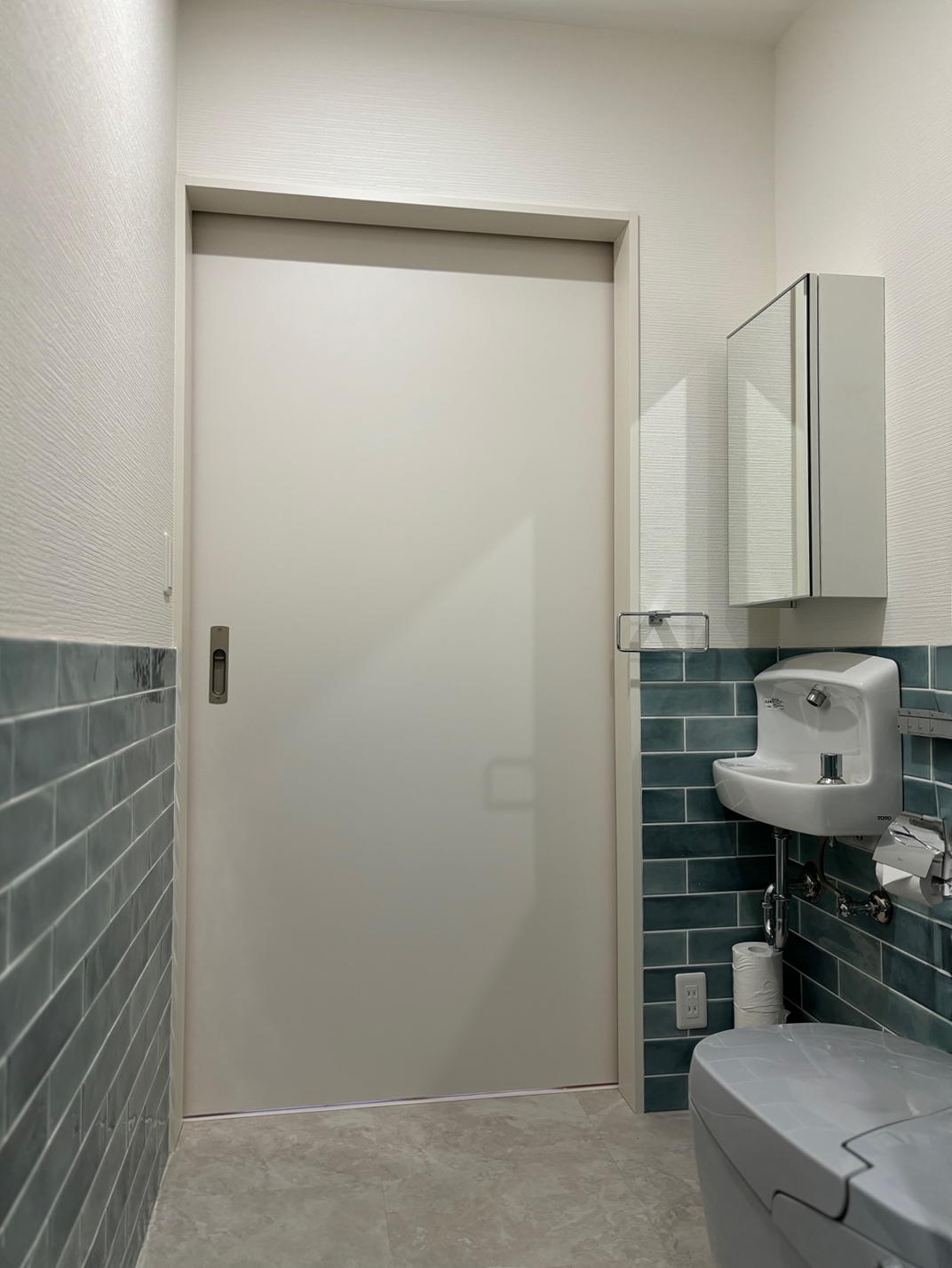 グロッシーなタイルが美しい明るく落ち着けるサニタリールームになりました。 右側の長く続く壁面には、これから写真やイラストを並べて飾られるそうです。どんな素敵な空間になるか楽しみですね!