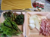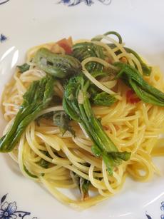 山菜・ニンニク・鷹の爪・玉ねぎ(なくてもOK)ベーコン(なければハムでもウインナーでもOK)
