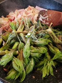 ④途中でゆで汁を山菜類を炒めたところへ入れる(適量)![]()