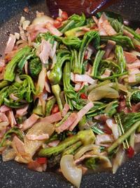 ②ベーコン→玉ねぎ→山菜を投入し炒める![]()