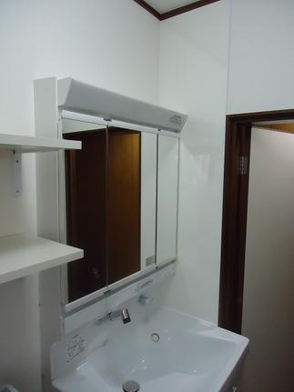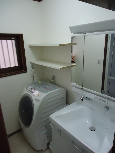 洗面所も全面改修させていただきました!洗面台はTOTO「サクア」を採用!流しが台形になっておりとっても広くて使いやすくなっております!壁には下地を入れて、2段の棚を設置いたしました!ちょっとした洗剤やタオル等が置ける便利なスペースとなっております!
