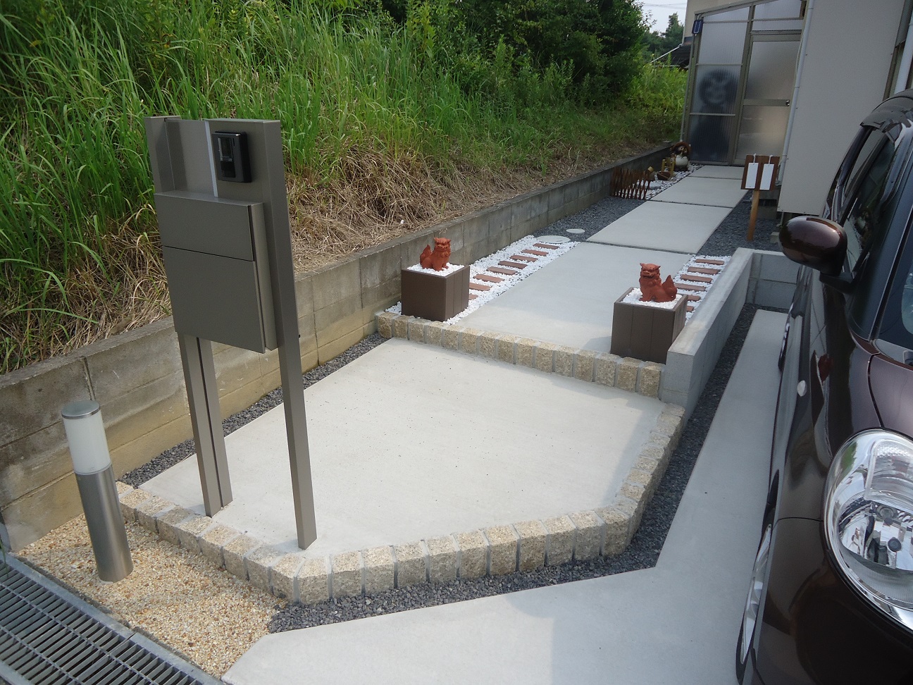 アプローチ部分にはお施主様のご要望でシーサーが置けるように台を二つ設置しております!
