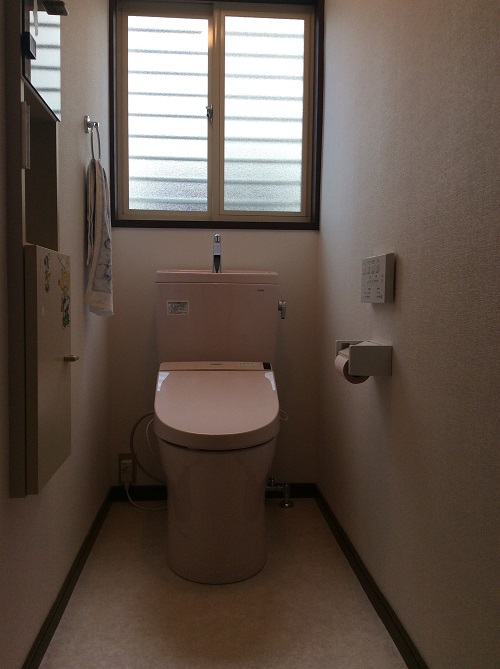 公共下水道切替工事です!既存の排水方法が汲取り式だったので、トイレを水洗式に取替しております。その際に床・壁の改修を行っております。