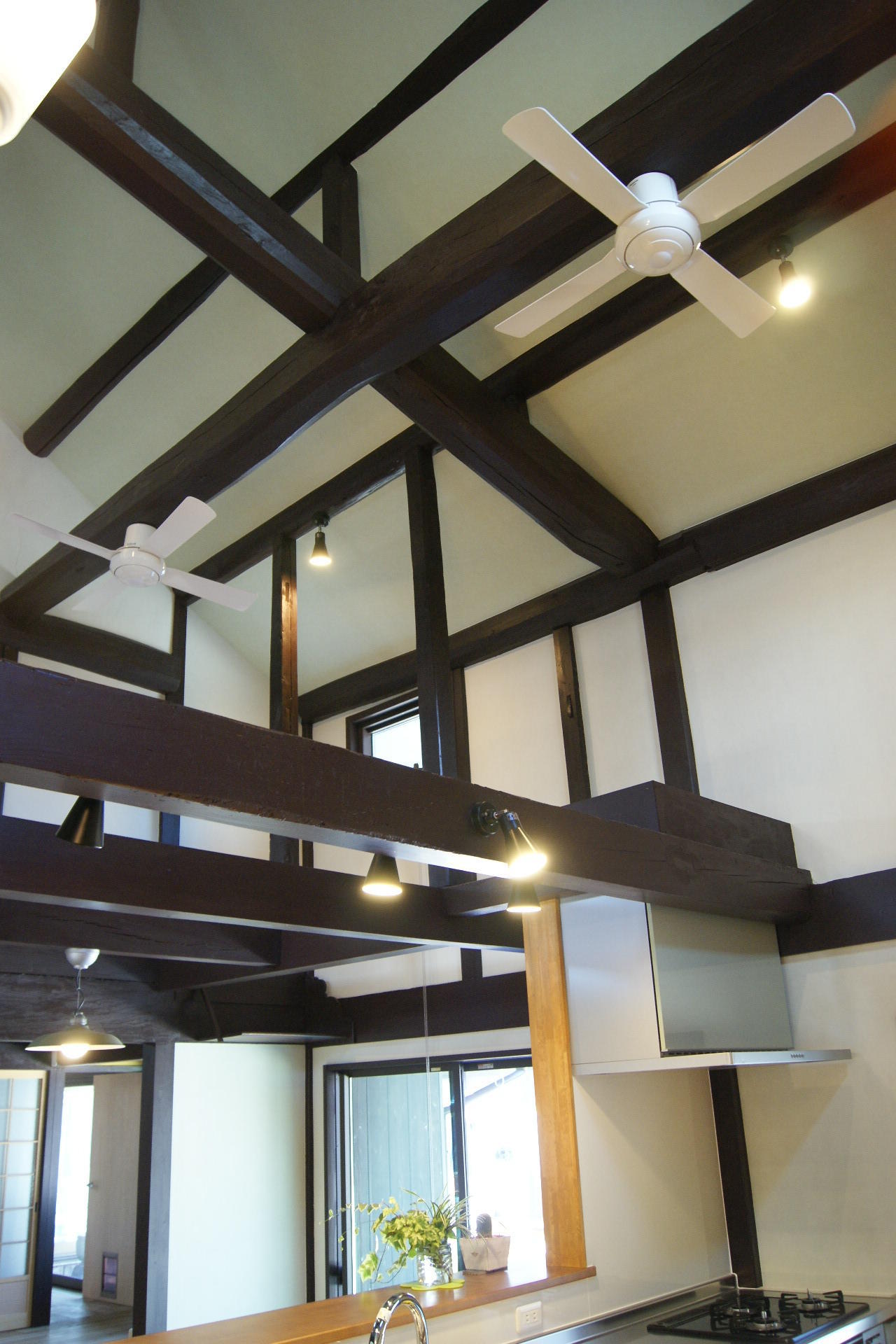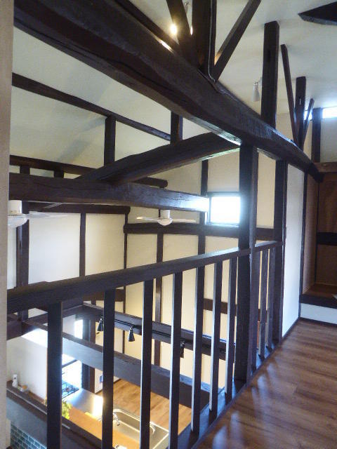 お客様の当初からのご希望で、再利用できる建具は再利用し、梁や鴨居も既存のまま使用しました。また、キッチンは段差がかなりあり、土間スペースを通らないといけなかった空間が床を組むことで生活動線も改善。キッチンから見ると吹抜けとリビング、そして2階のフリースペースまでも見渡せる大空間が広がります。梁や鴨居、2階の造作手摺を塗装し、建具も出来るだけ既存のものを使用し、和の雰囲気は損なわない空間になりました。また、奥様のこだわりでステンドガラスと写真には写っていませんが、キッチン前の腰壁にはモザイクタイルが貼ってあり、大正ロマン風を実現できました。