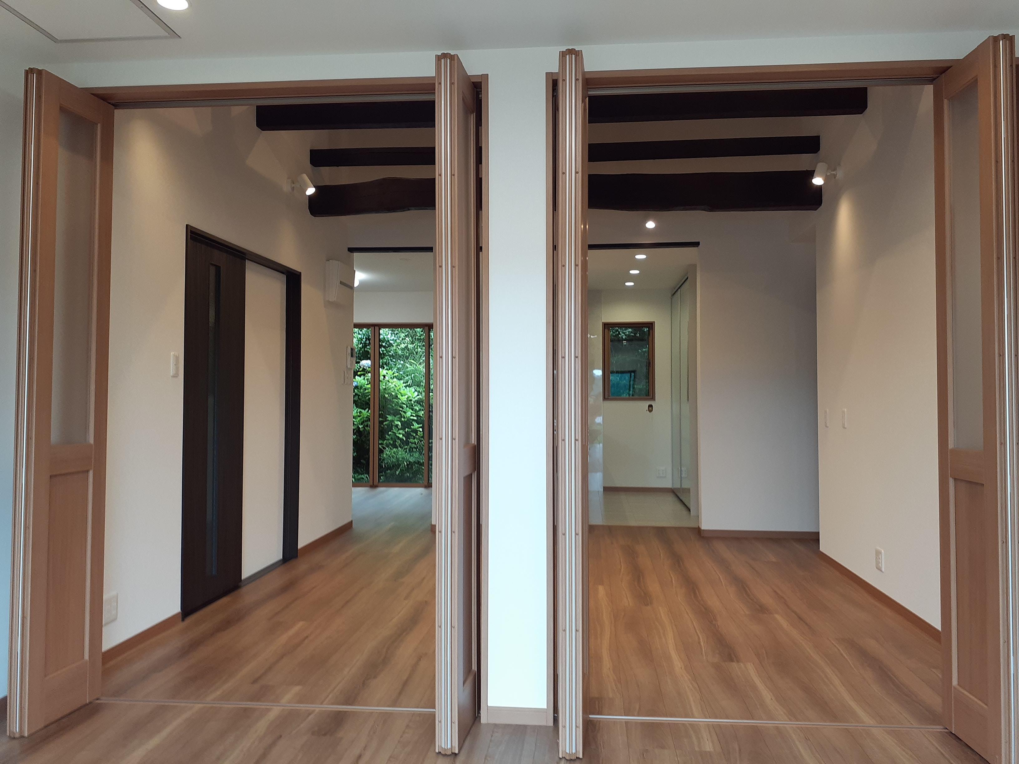 中二階の納戸を吹抜けにすることで、開放的なリビングに生まれ変わりました。廊下・納戸・洋室・キッチン・ダイニングを改修して、カウンターキッチンを中心にダイニングルームとリビングルームをⅬ字型に配置。家族の気配を感じながらも、それぞれの時間を楽しめるような空間になりました。