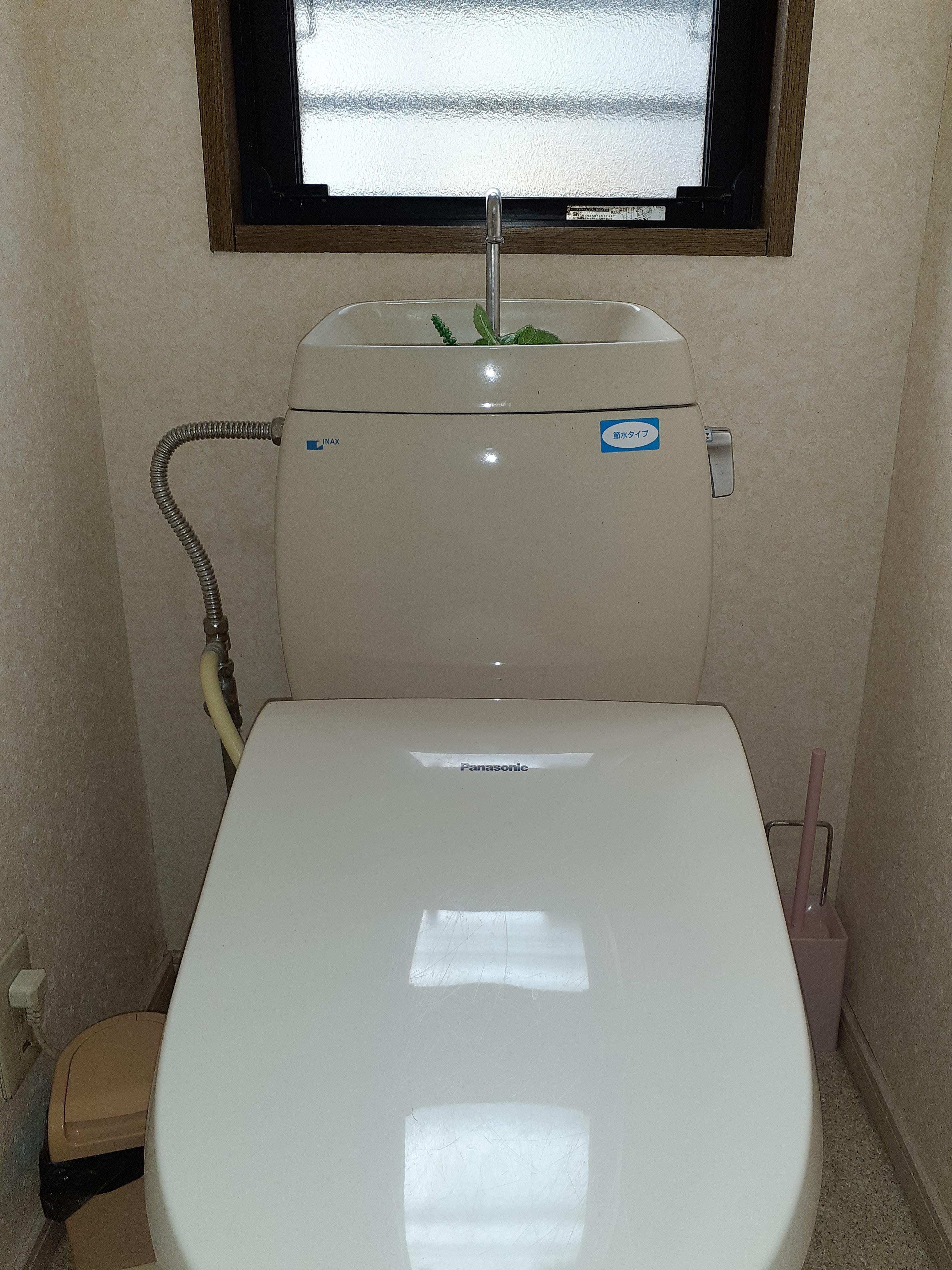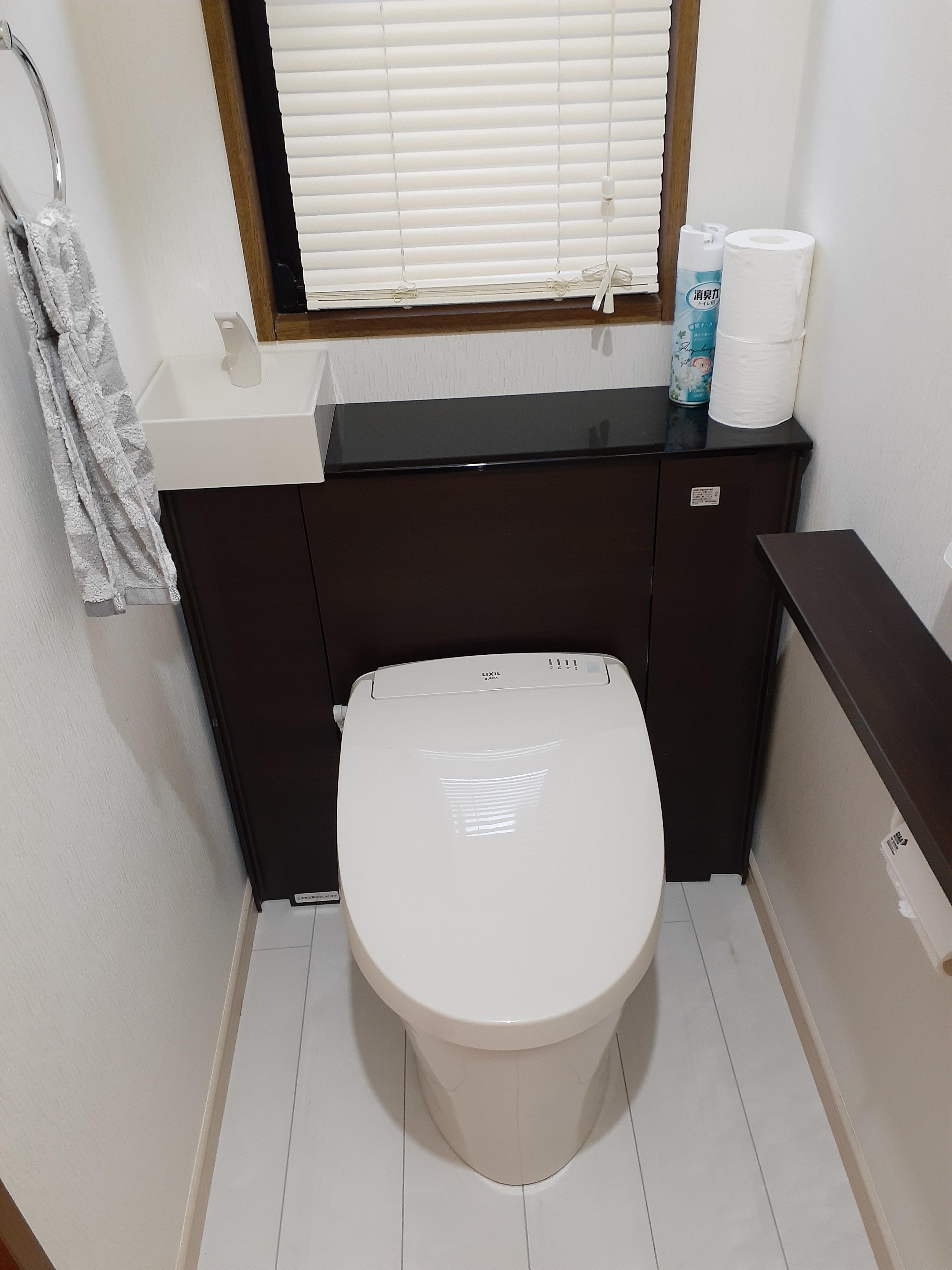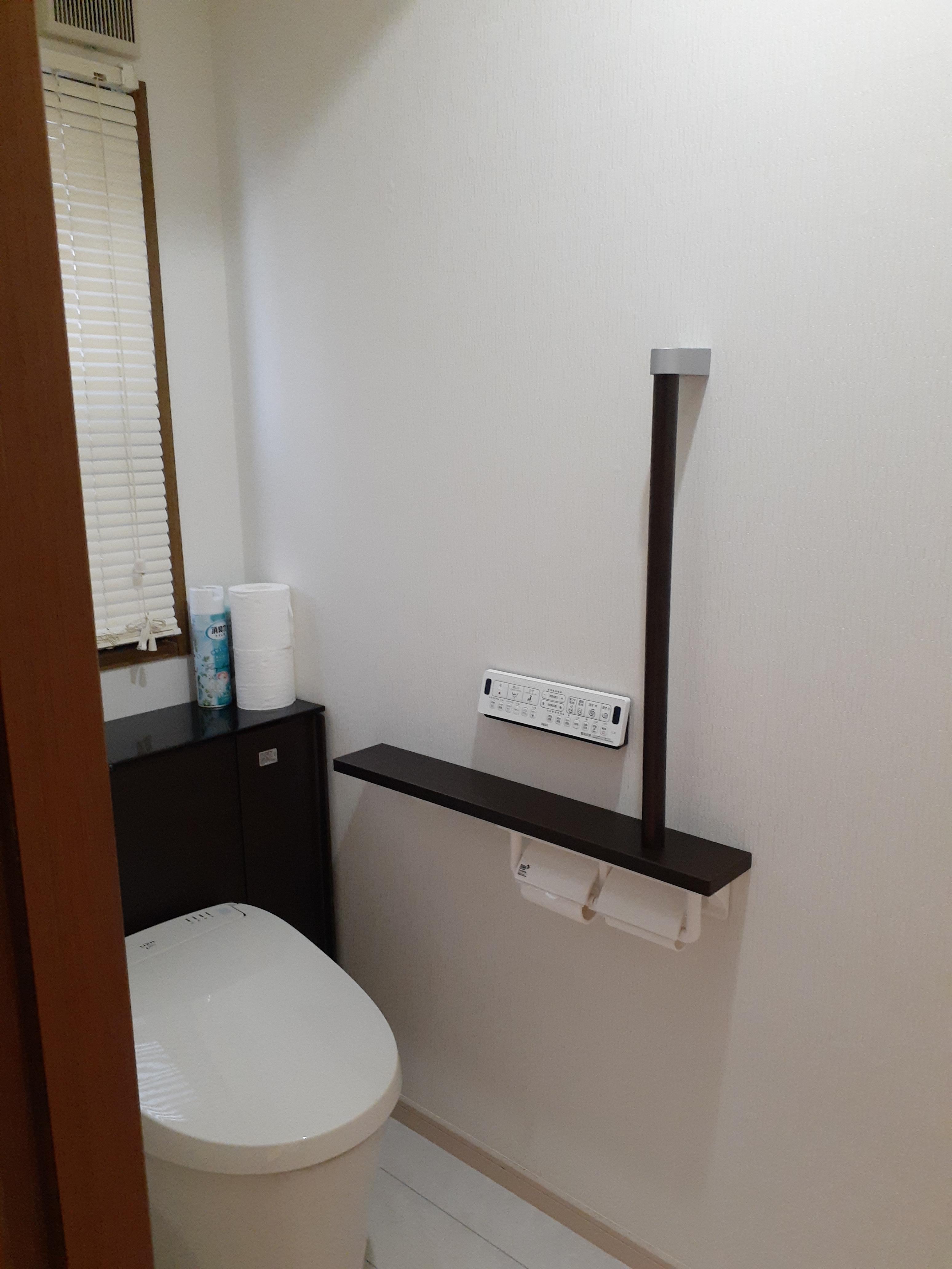 トイレに手すりを設置しました。便器はタンクレスに取り換えることで背面に収納と手洗い器を取り付けることが出来ました。