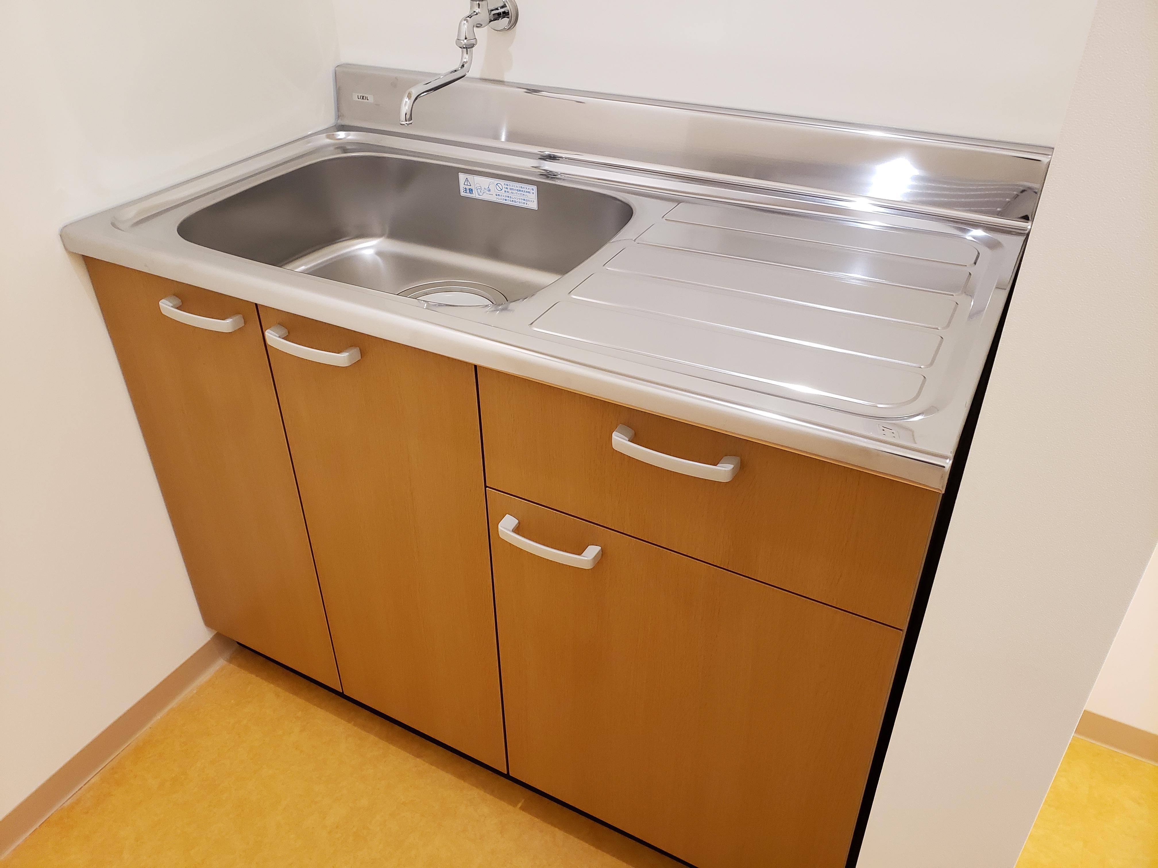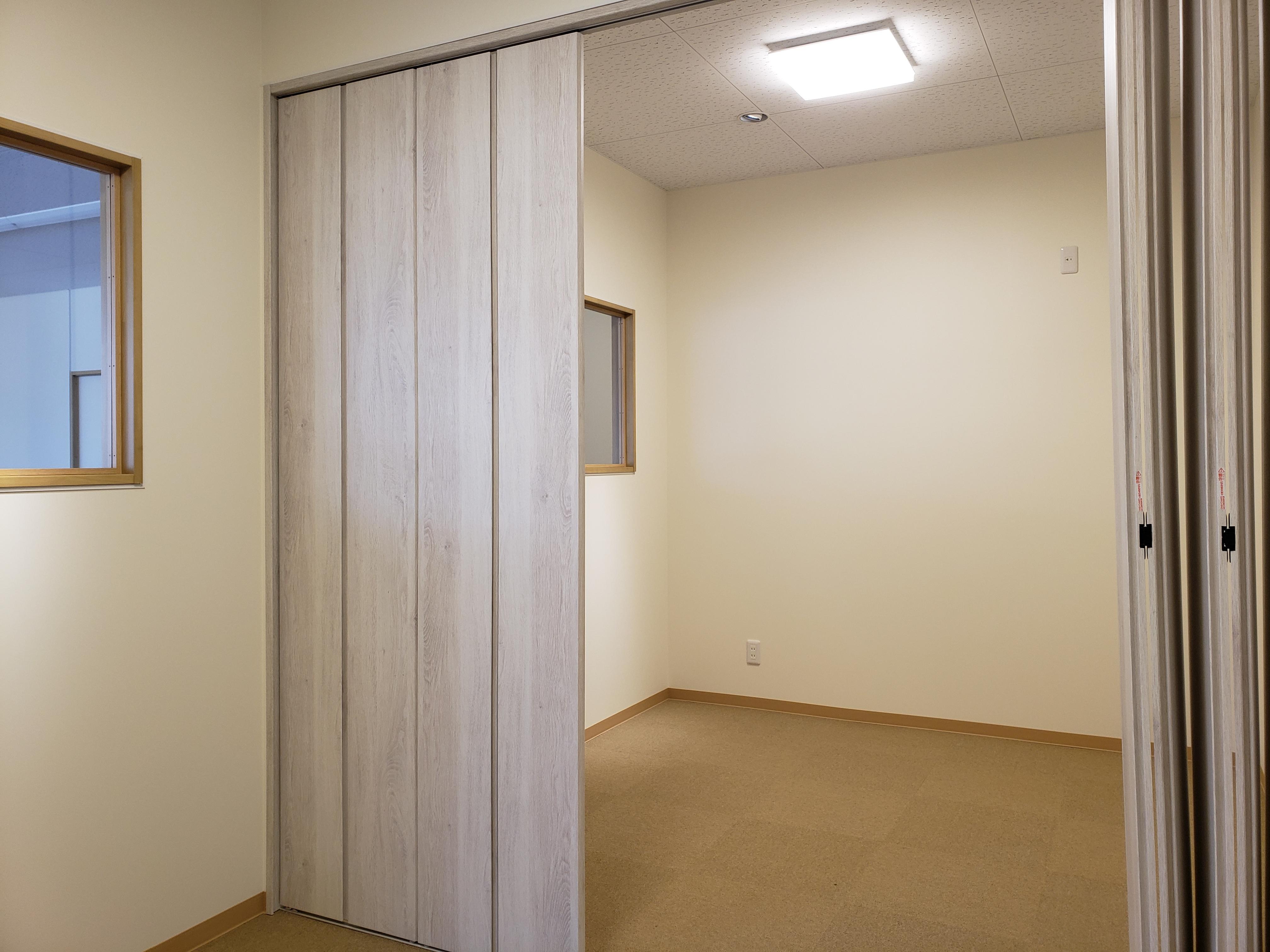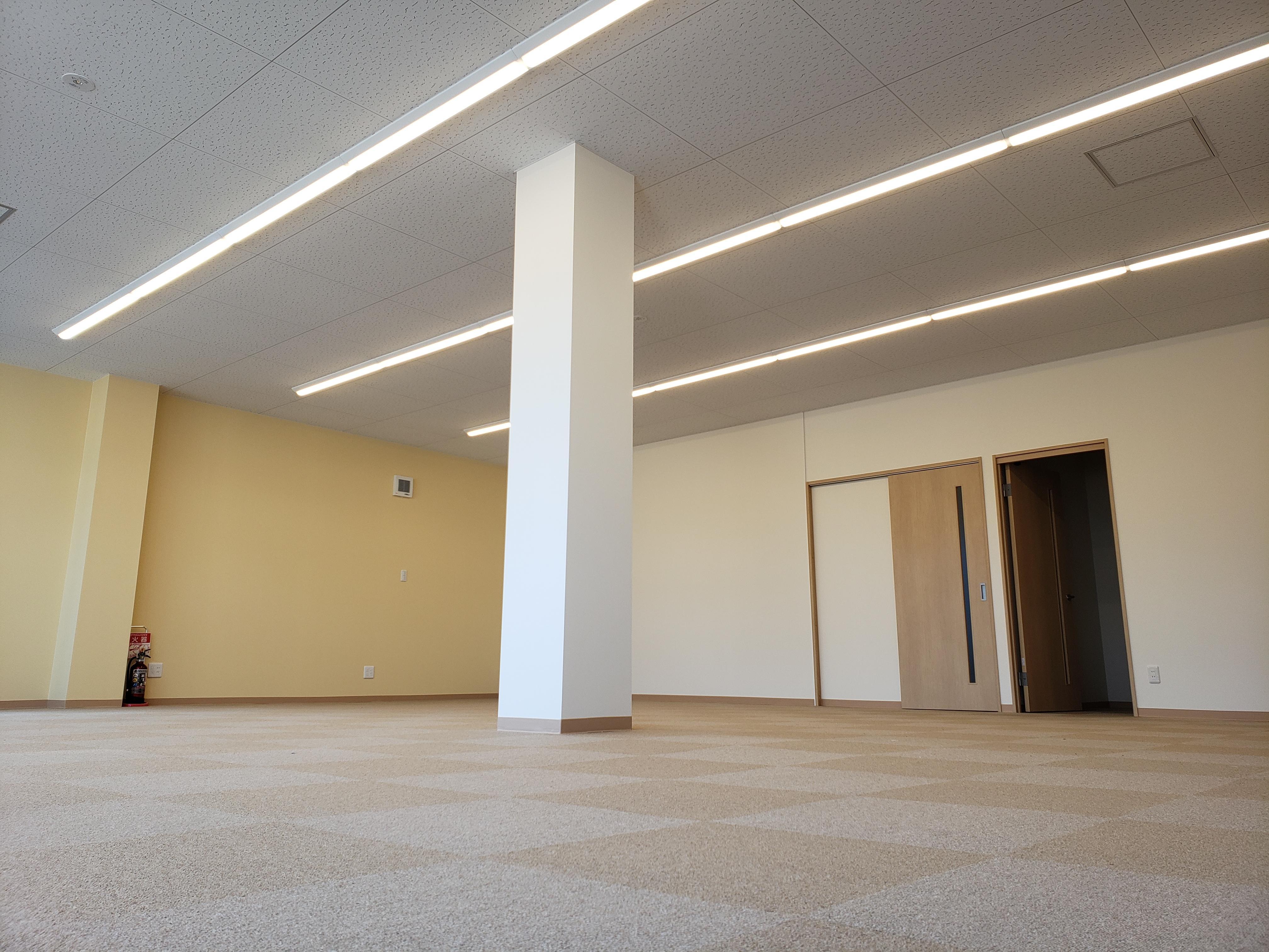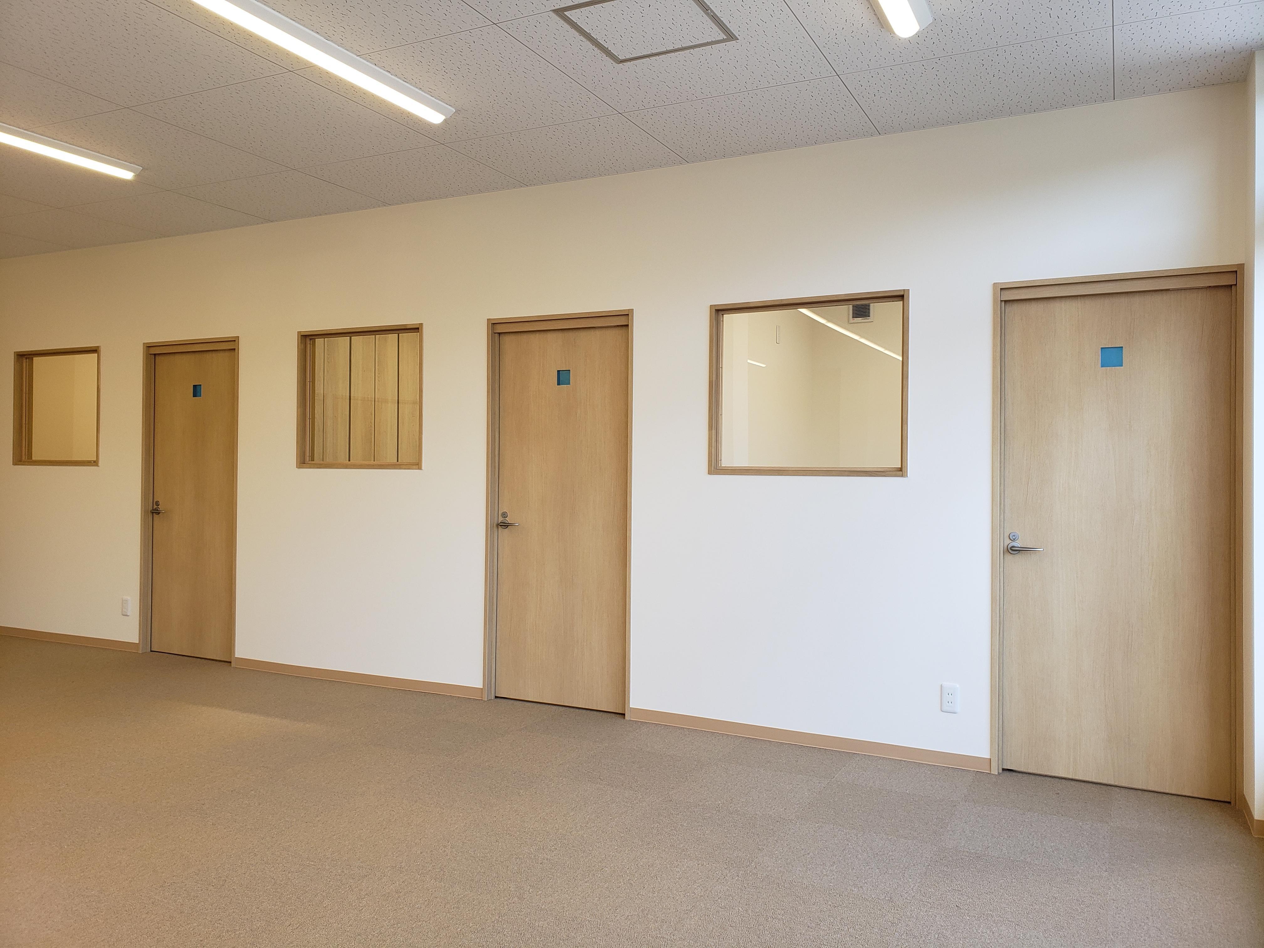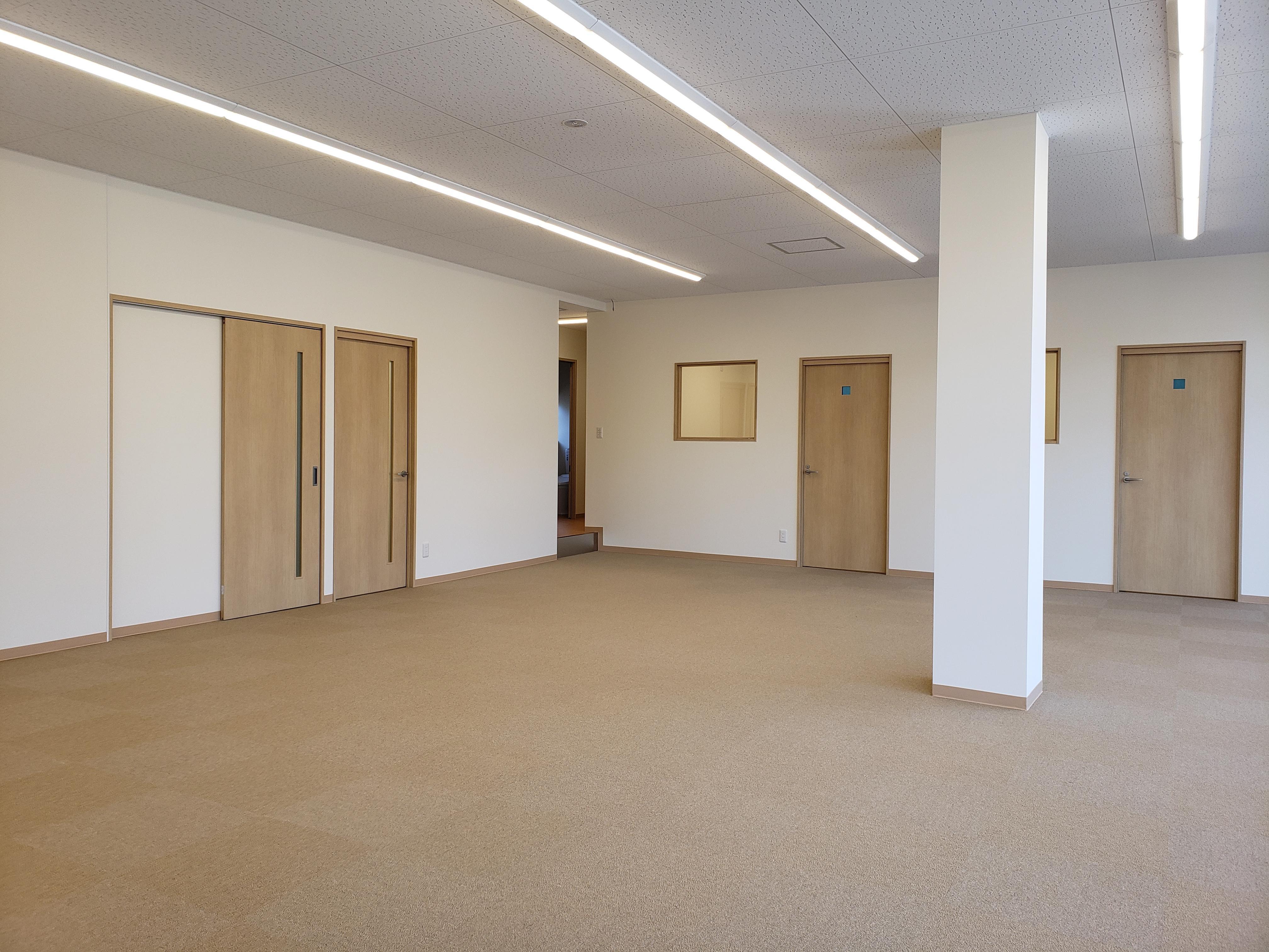 空きテナントを塾に改修工事しました。躯体(柱や壁など)はそのままにし、床や天井、クロスなどは張り替えました。照明はすべてLEDに取り替えました。 壁紙は白にし、建具などは明るい木目調を採用。温かみがあって落ち着きのある勉強に集中できる空間になりました。 一部を壁で仕切って、個別教室も設けました。