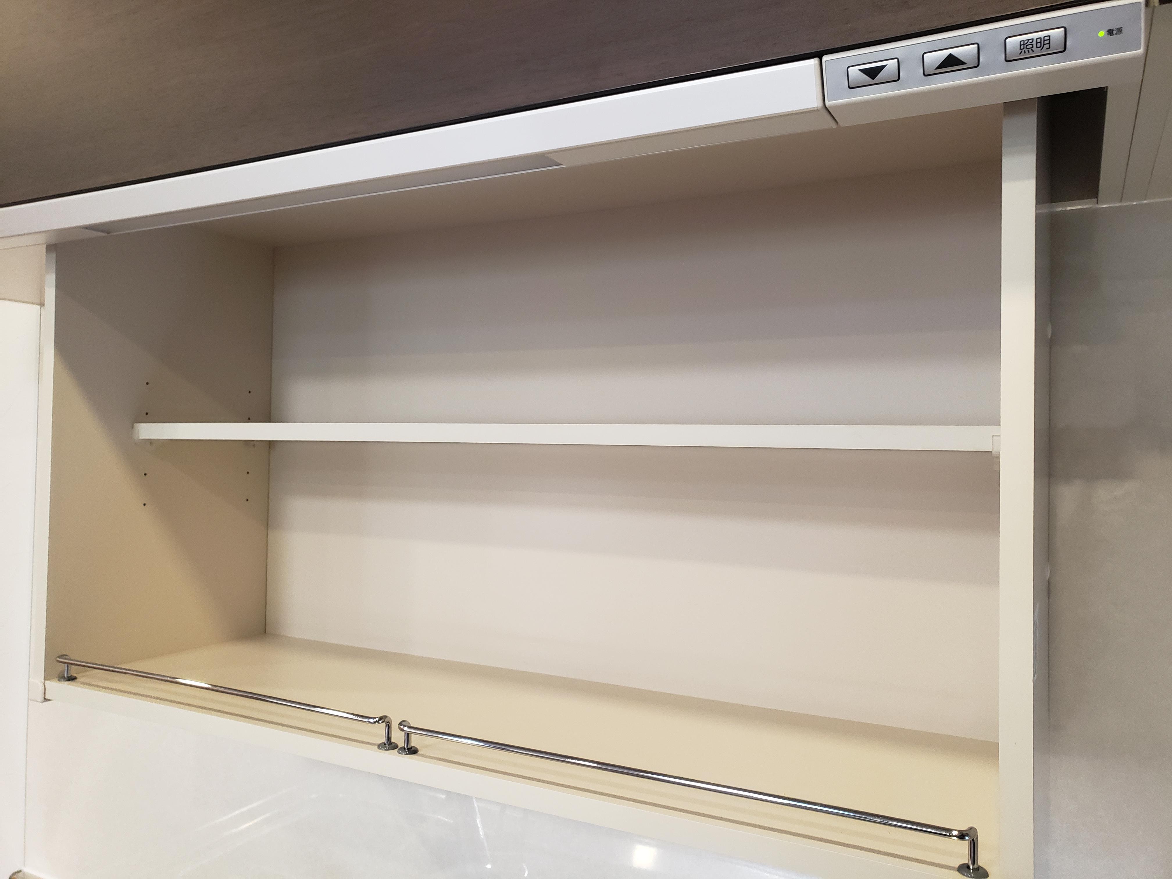 スイッチひとつで棚が自動で垂直に昇降するオートダウンウォールを採用。調味料などが目の高さで出し入れでき、調理中はおろしたまま使えて便利です。吊り下げ戸棚でも普段遣いの収納に収納に使えます。