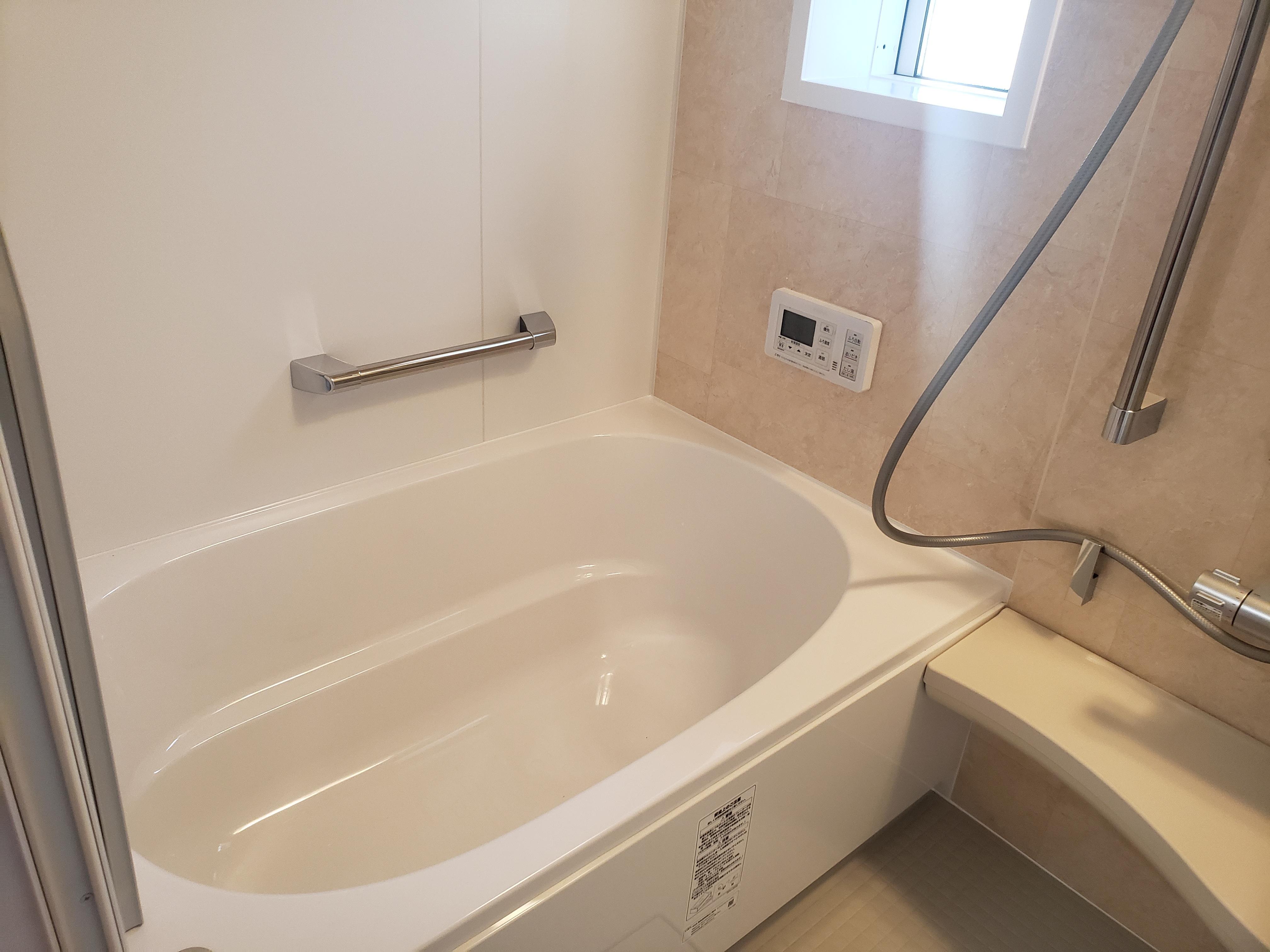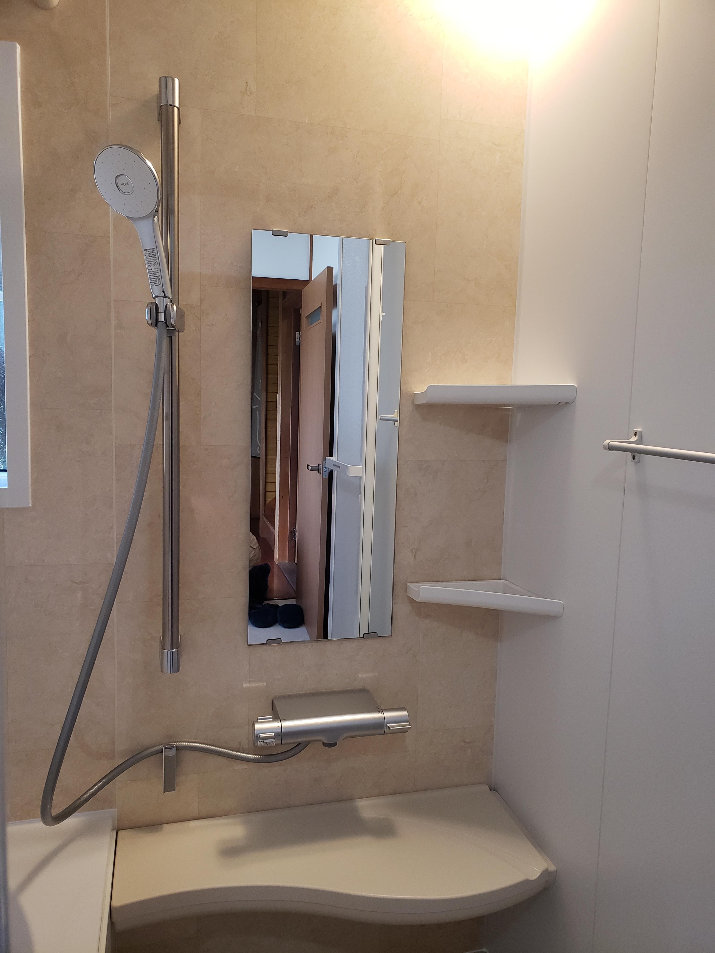シャワーヘッドにエコアクアシャワーを採用しました。大判のシャワーヘッドで広範囲に浴びることができ、空気を含んだ大粒の水滴がでるのでとても浴び心地が良いです。さらに節水もできる優れものです。