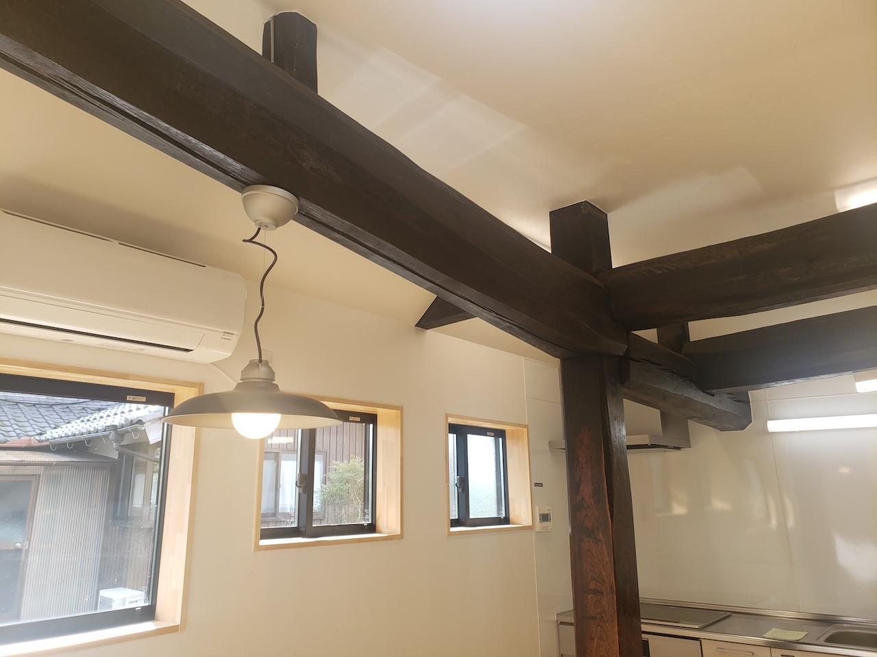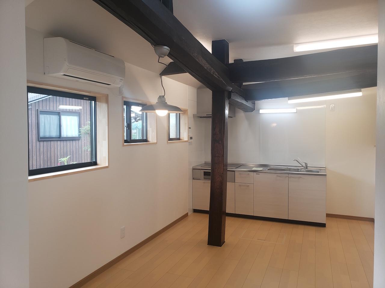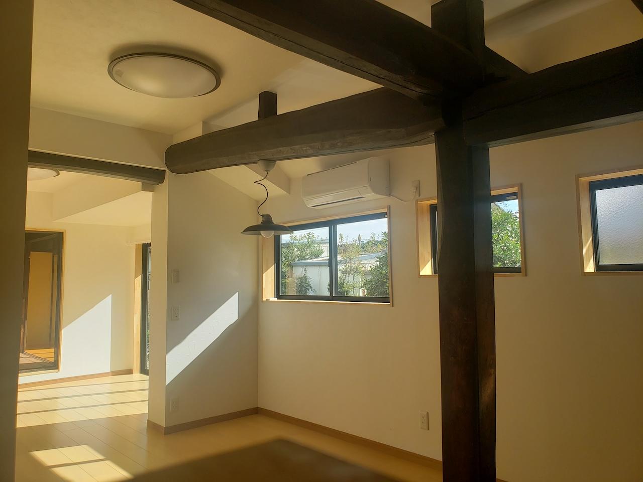 もともと土間と和室だった日当たりの良い南側にLDKをもってきました。既存の梁に、塗装をして見せる梁に。 洗面浴室トイレは、将来の動線などを考慮して。LDKからすぐに横に配置しました。 家族が長く安心して過ごせるお家になりました。
