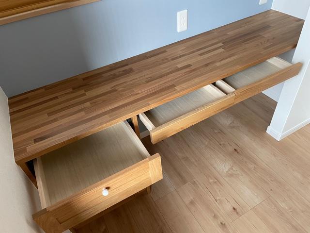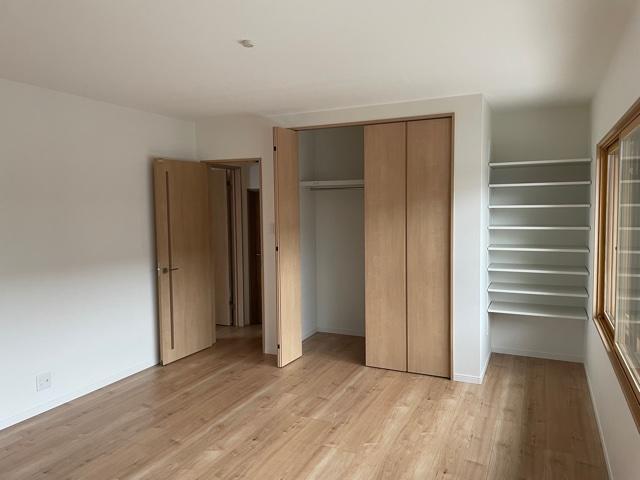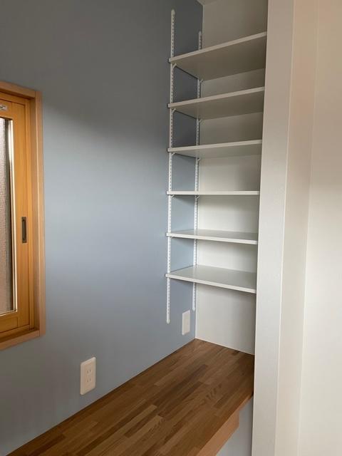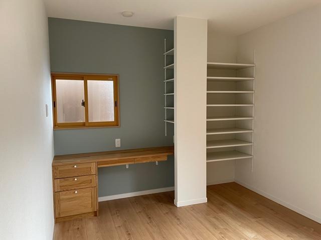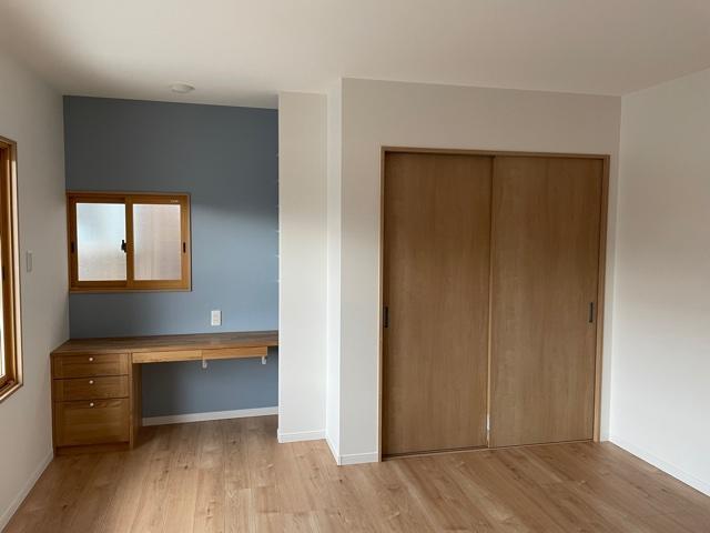 物入れになっていた洋室と和室を大きな間取りの変更をせずに、子供部屋にリノベーションしました。床、壁、天井を下地からやり替えて内装を仕上げました。断熱の充填、窓は内窓を設置しました。 建て付けのカウンターテーブルには、将来勉強机としてもつかえるように引き出しや収納を設置しました。 くすみブルーの壁紙で北欧風のオシャレな空間に。