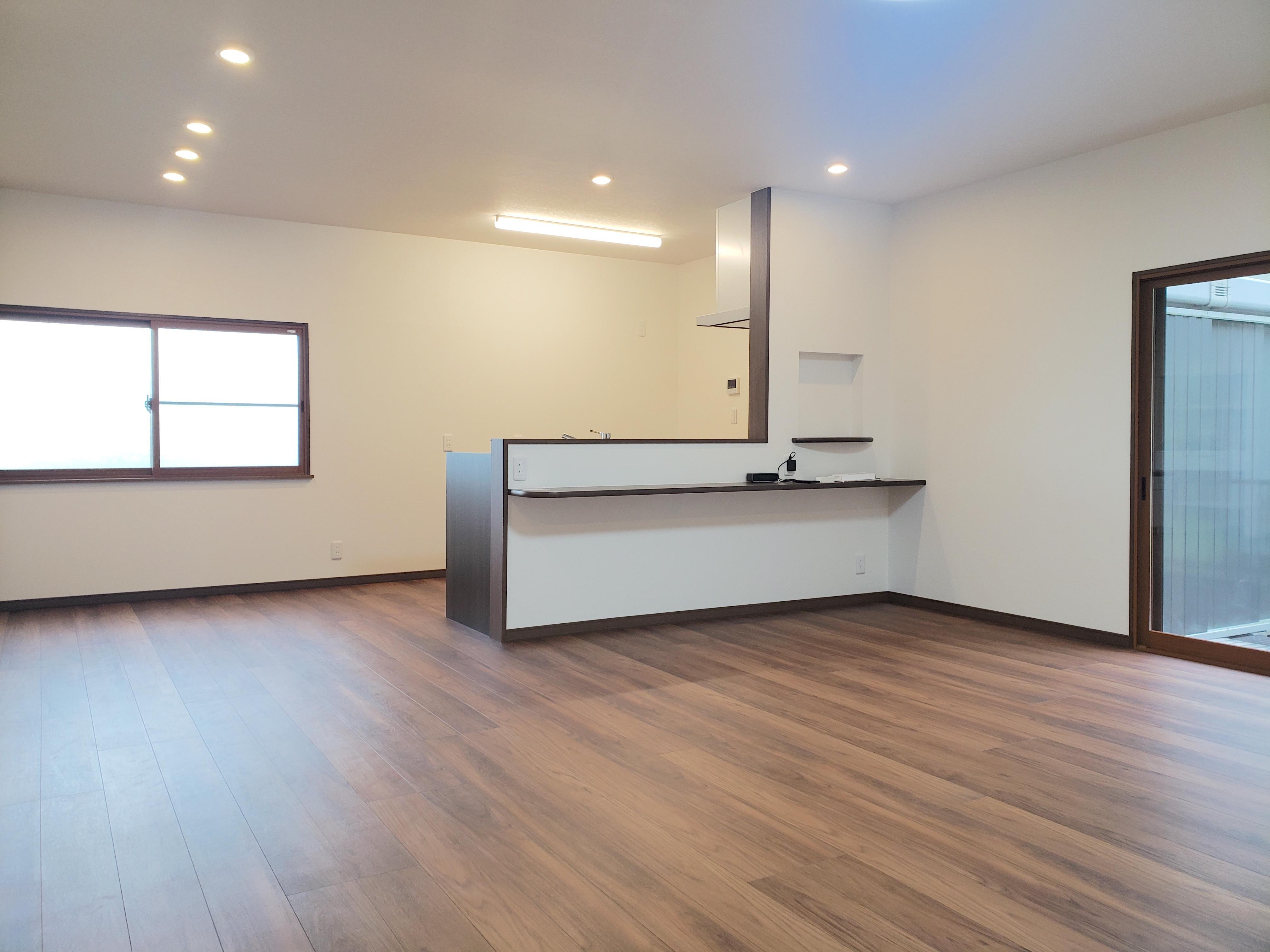 LDKの照明器具、床と壁のクロスをやりかえ、システムキッチンは新しいものを設置しました。カウンターキッチンは、コの字型の壁だったのを吊戸棚を無くし L字型にやりかえることで開放感のあるLDKに生まれ変わりました。 既存の窓はそのままに内窓を設置しました。今年の冬が楽しみだとお喜びいただきました。