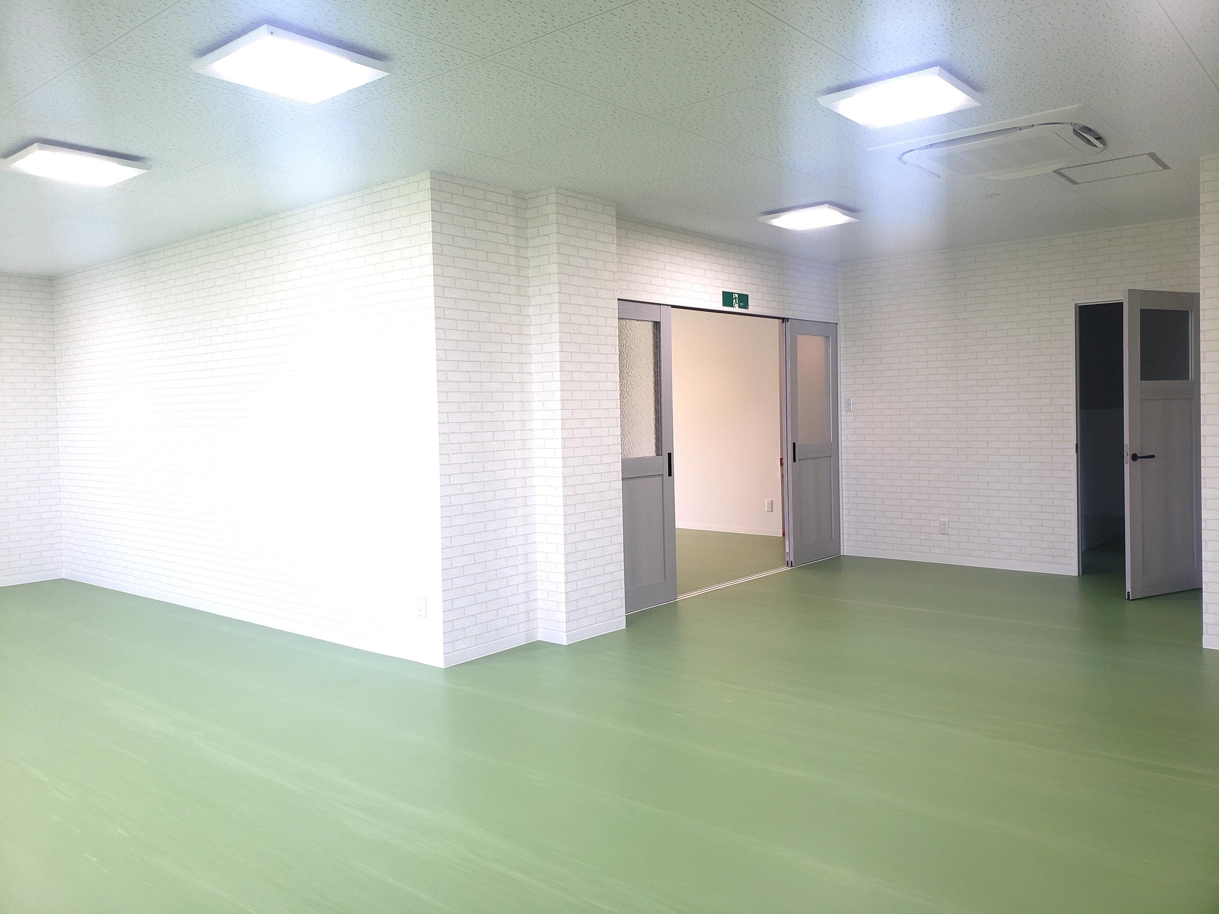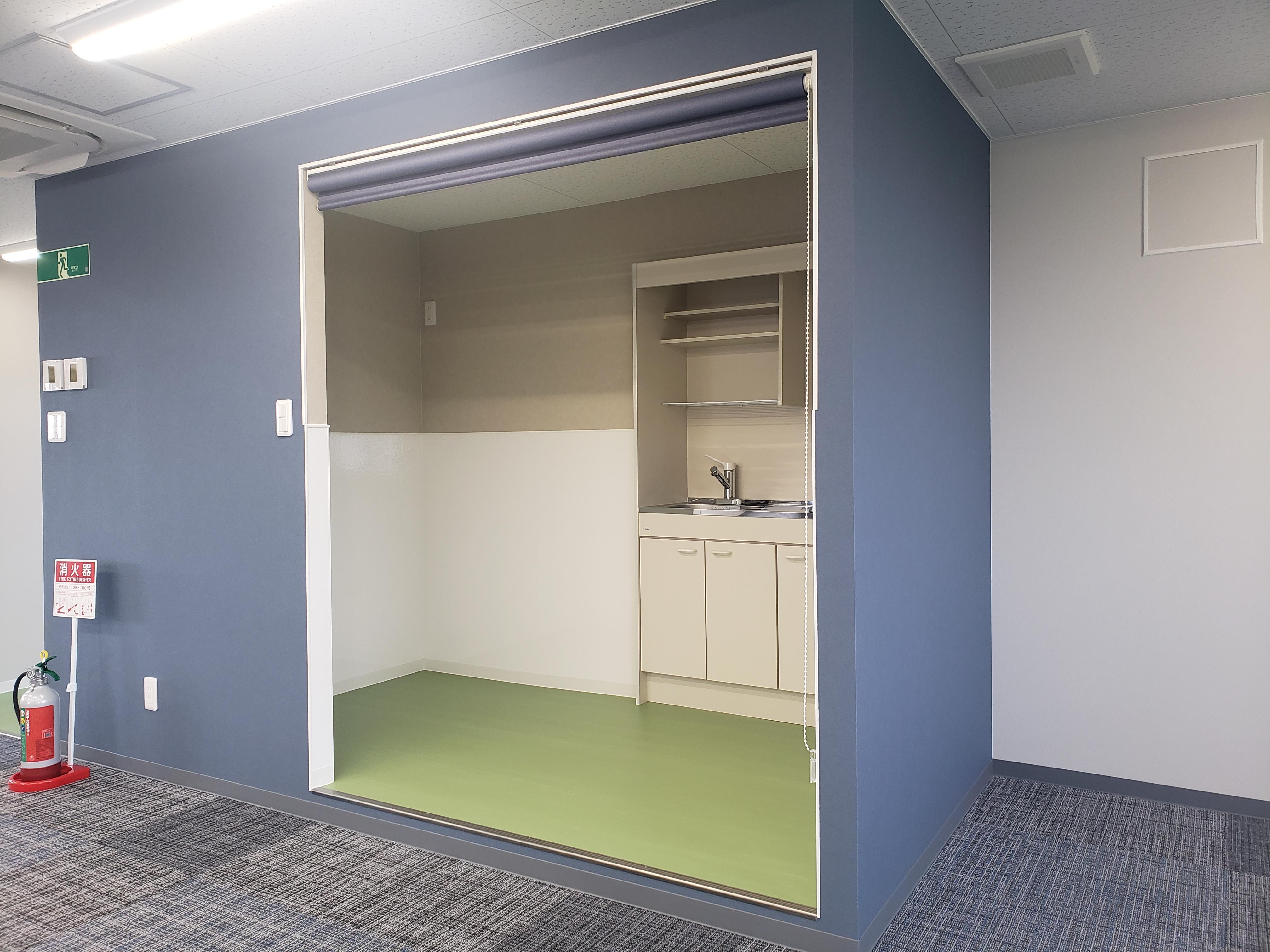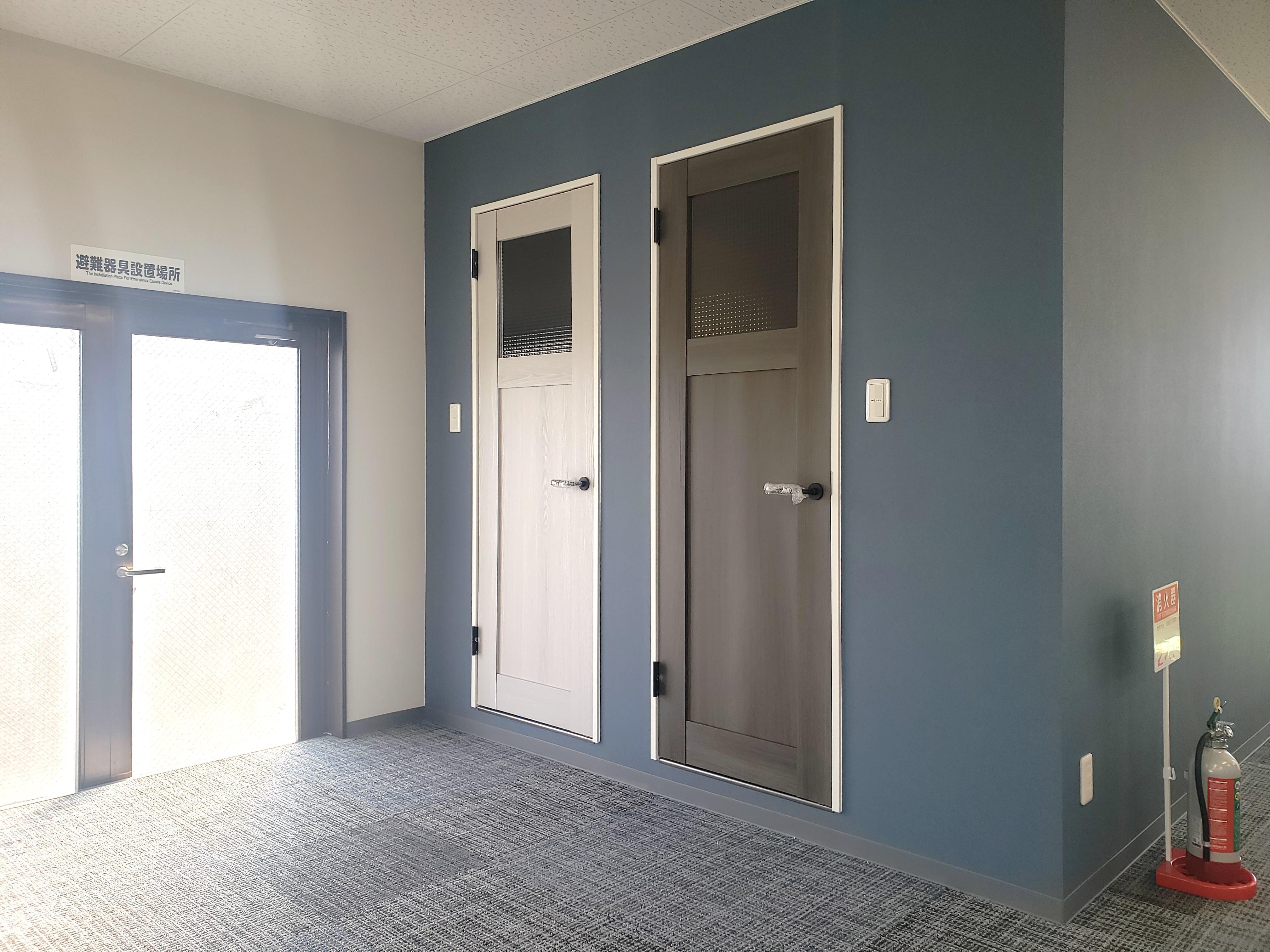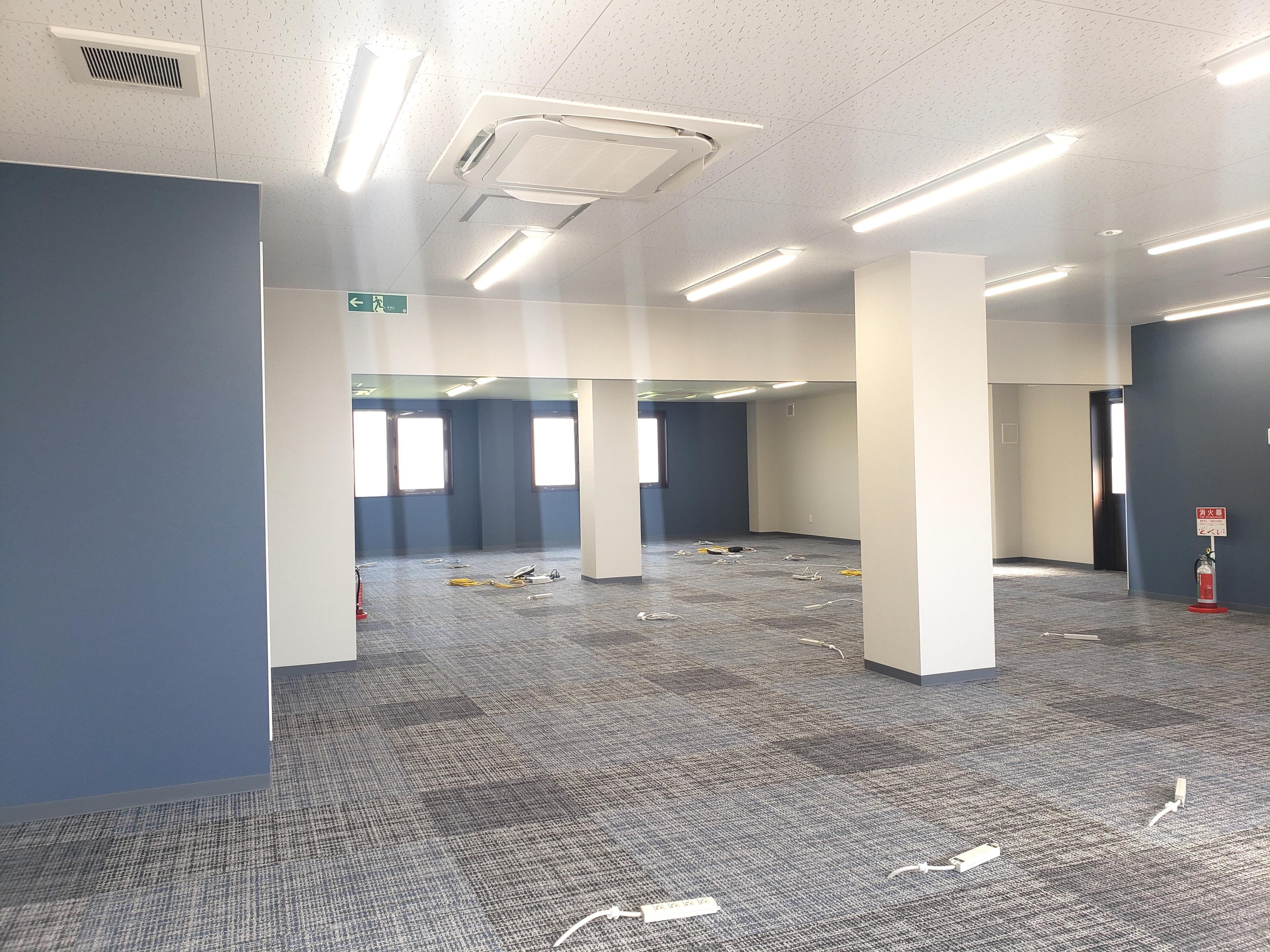 元カラオケ店のビルをオフィスビルに改修しました。個室になっていた壁をぶち抜いてワンフロアにしました。1階は食堂・倉庫に、2・3階はオフィスになりました。 オフィスは、グレーのカーペットにネイビーのアクセントクロスで集中して仕事ができるような落ち着いた雰囲気になりました。 2階受付の壁もネイビーで統一しました。