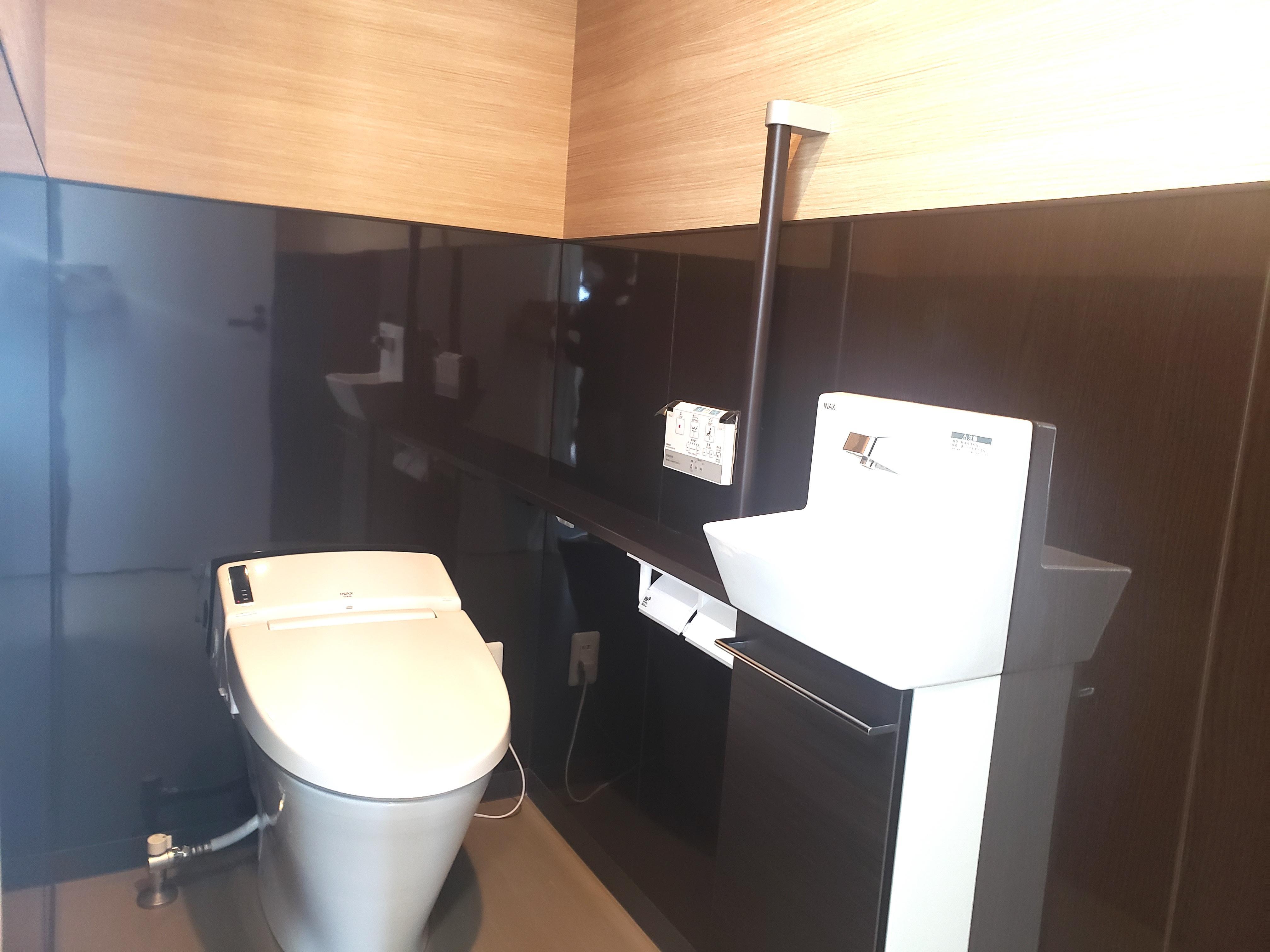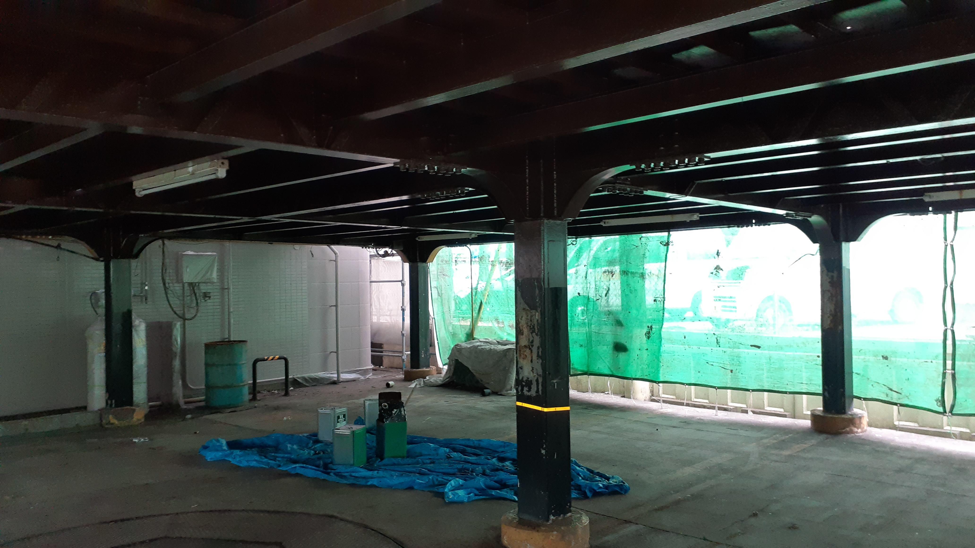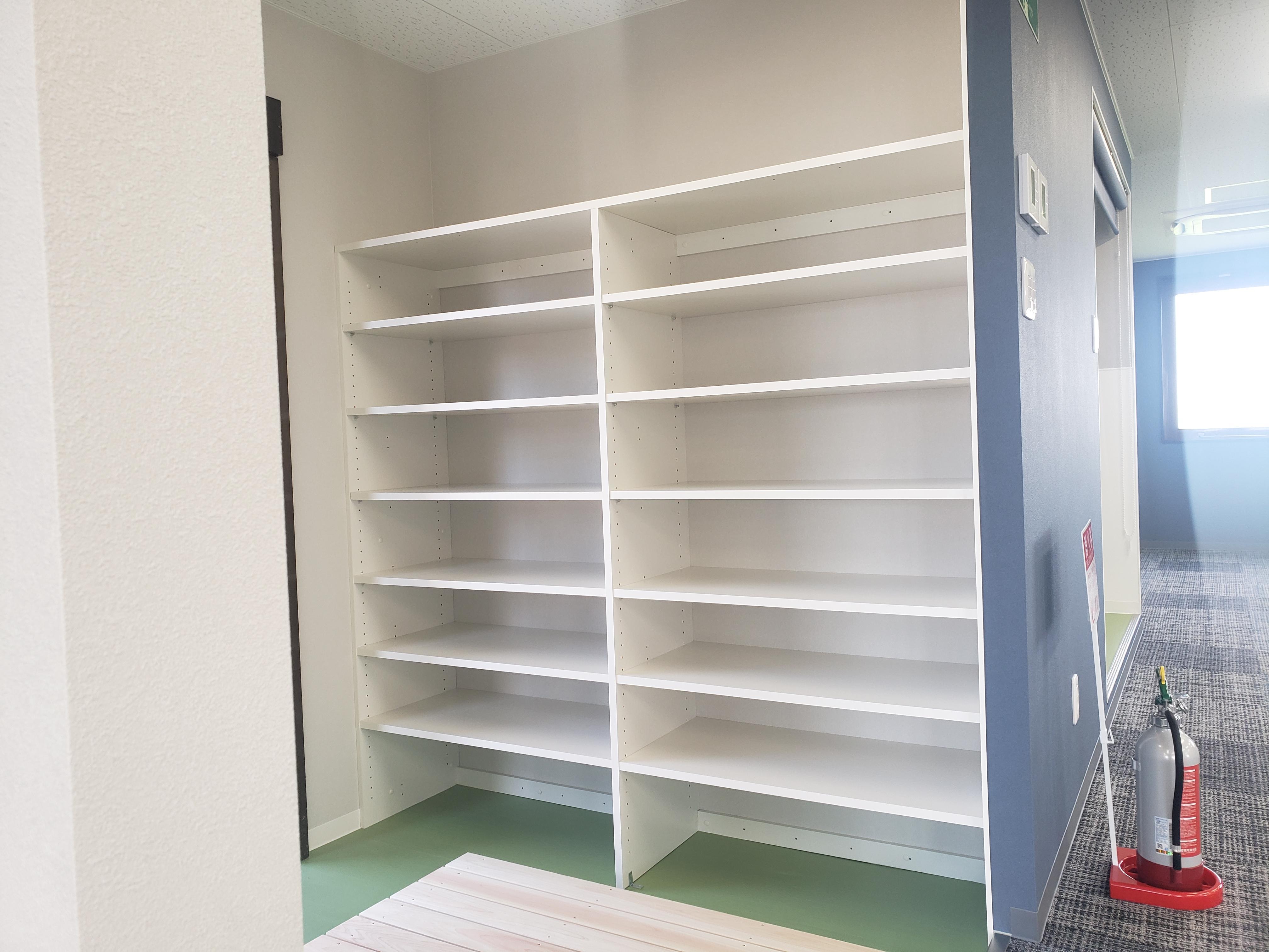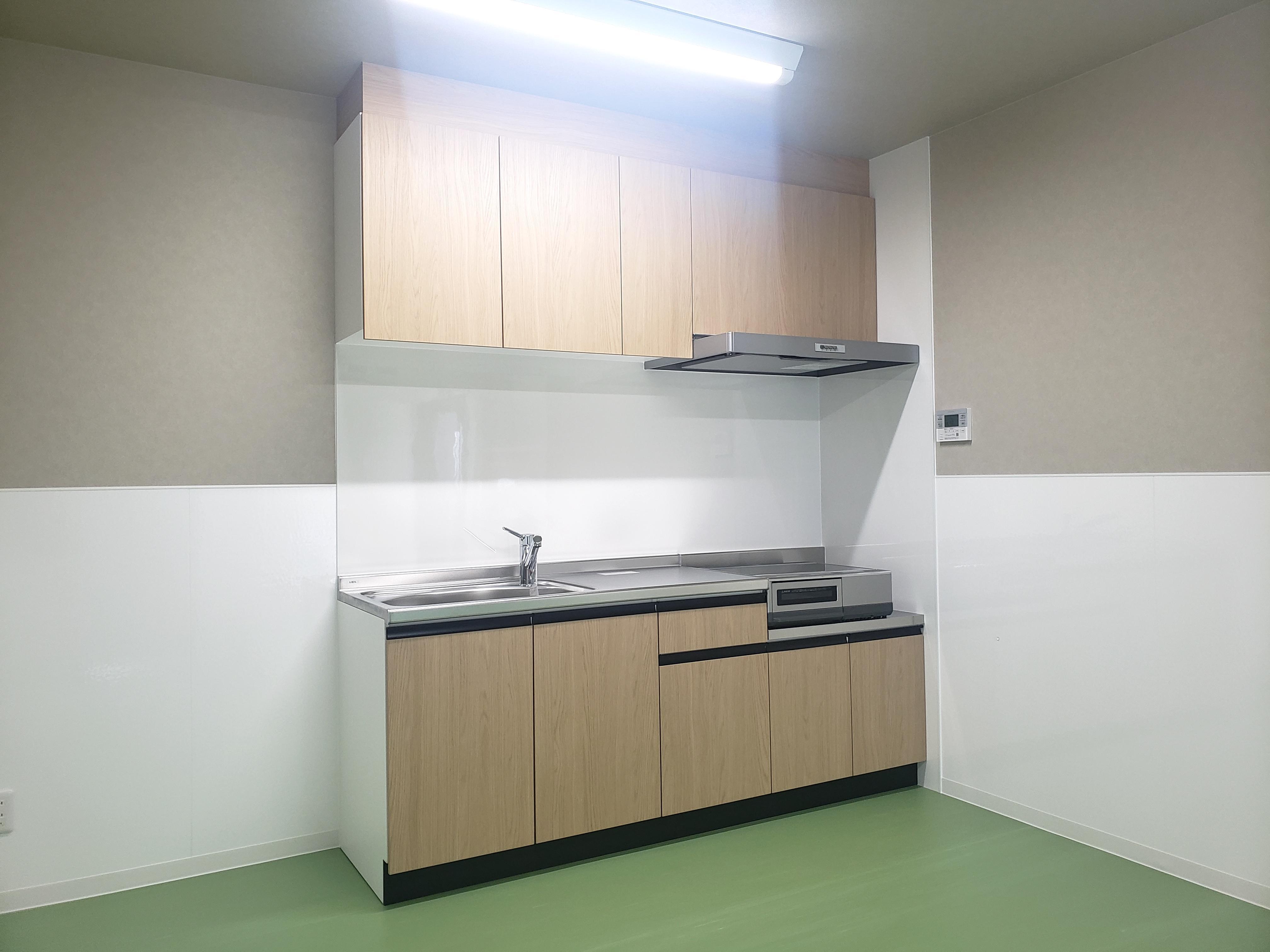 元カラオケ店のビルをオフィスビルに改修しました。個室になっていた壁をぶち抜いてワンフロアにしました。1階は食堂・倉庫に、2・3階はオフィスになりました。 オフィスは、グレーのカーペットにネイビーのアクセントクロスで集中して仕事ができるような落ち着いた雰囲気になりました。 2階受付の壁もネイビーで統一しました。