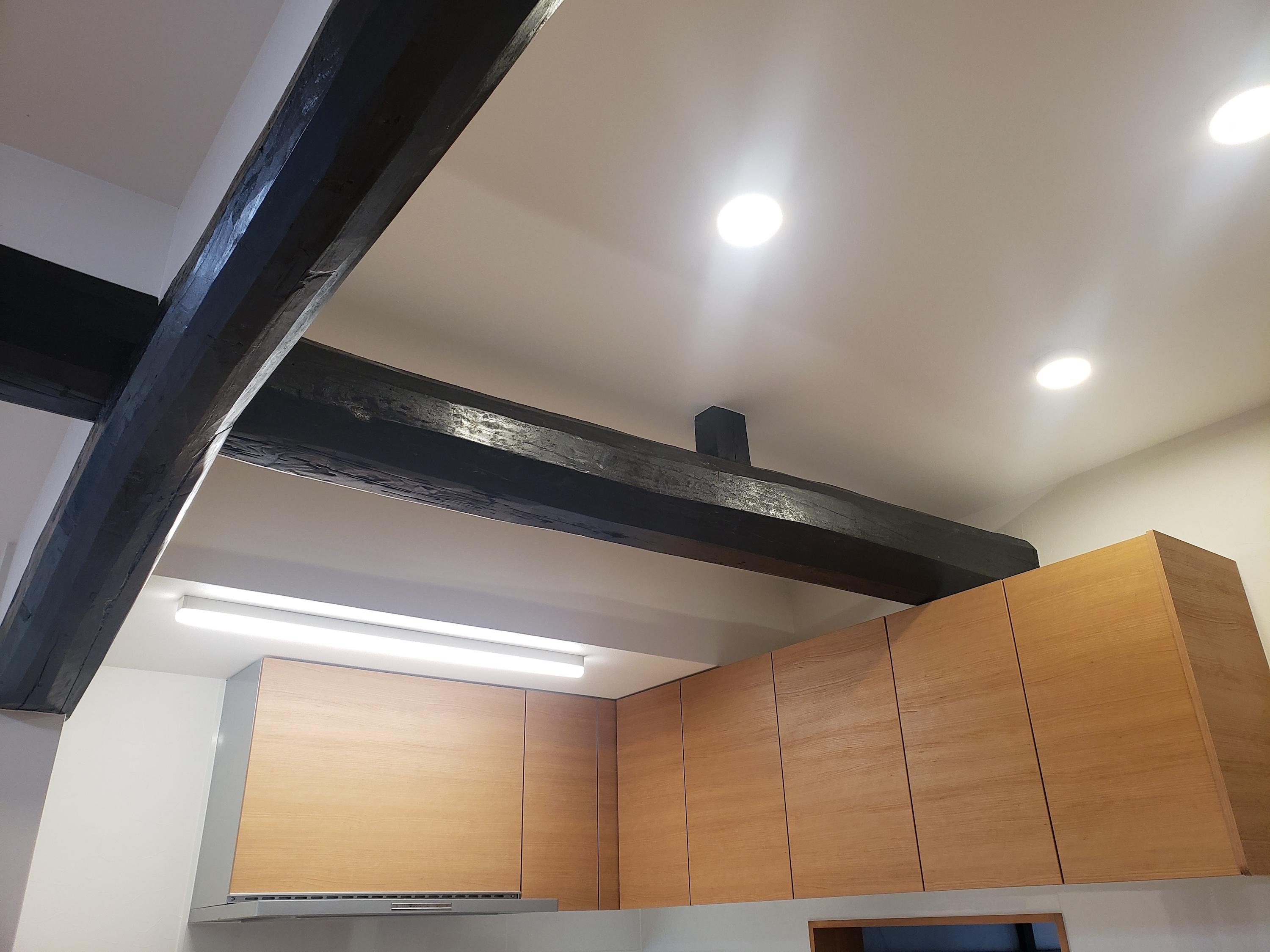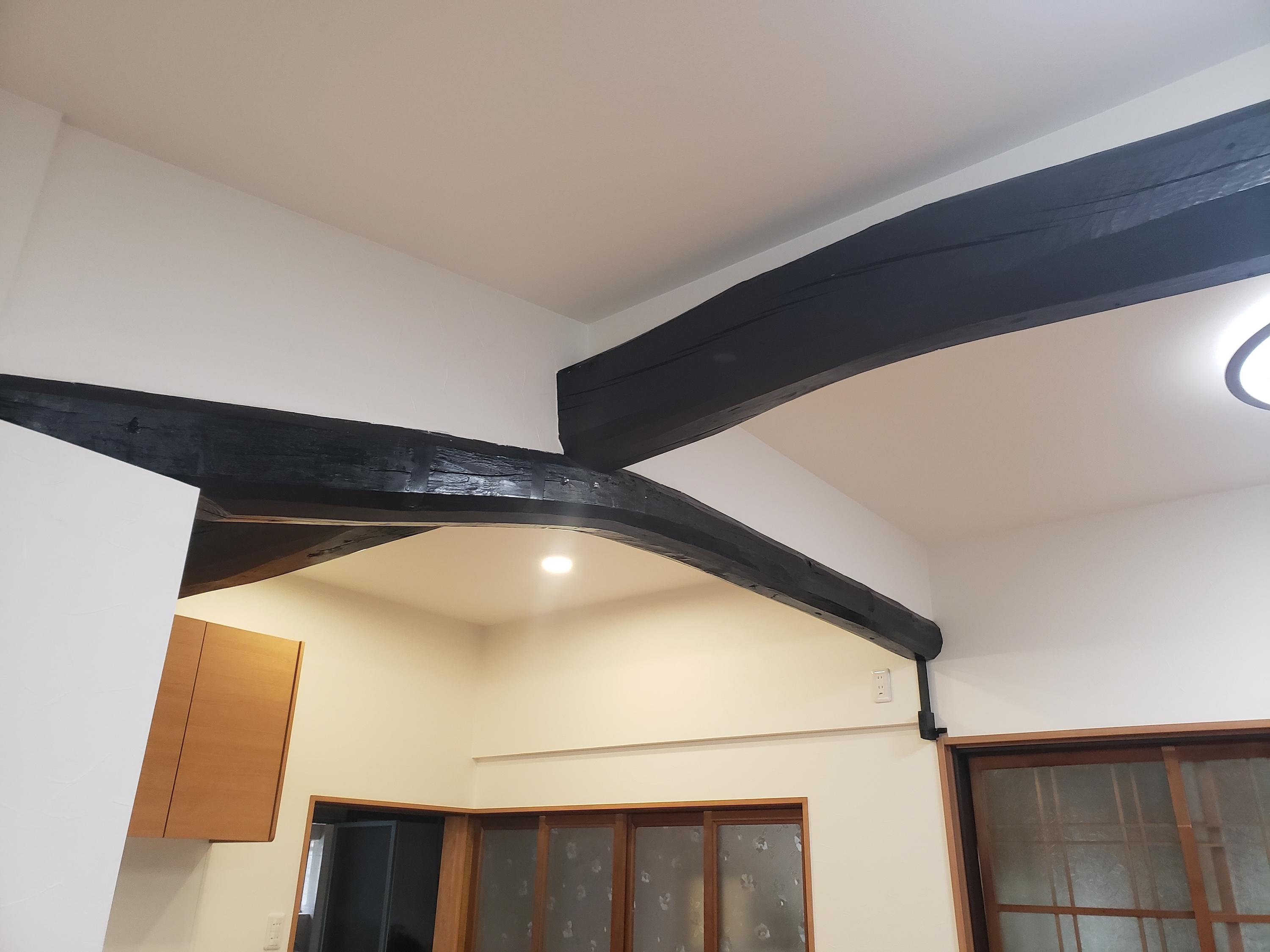 既存の梁を現し、綺麗に塗装することで天井が高くなりました。天井クロスと壁クロスを白で統一しお部屋全体が明るくなりました。和室横の奥の間は、フローリングにやり替え寝室に。古くなった建具も創作建具に取り替えました。