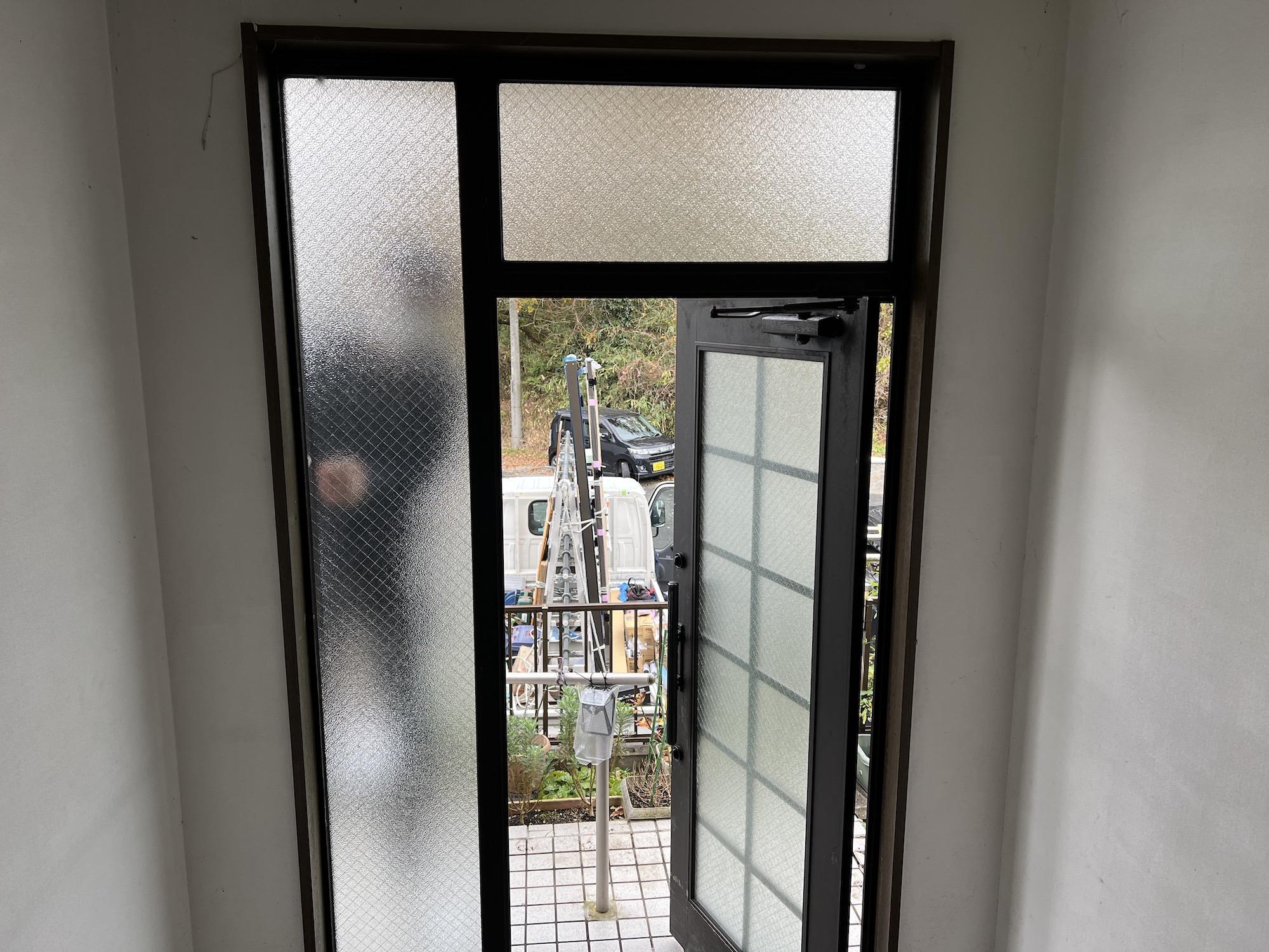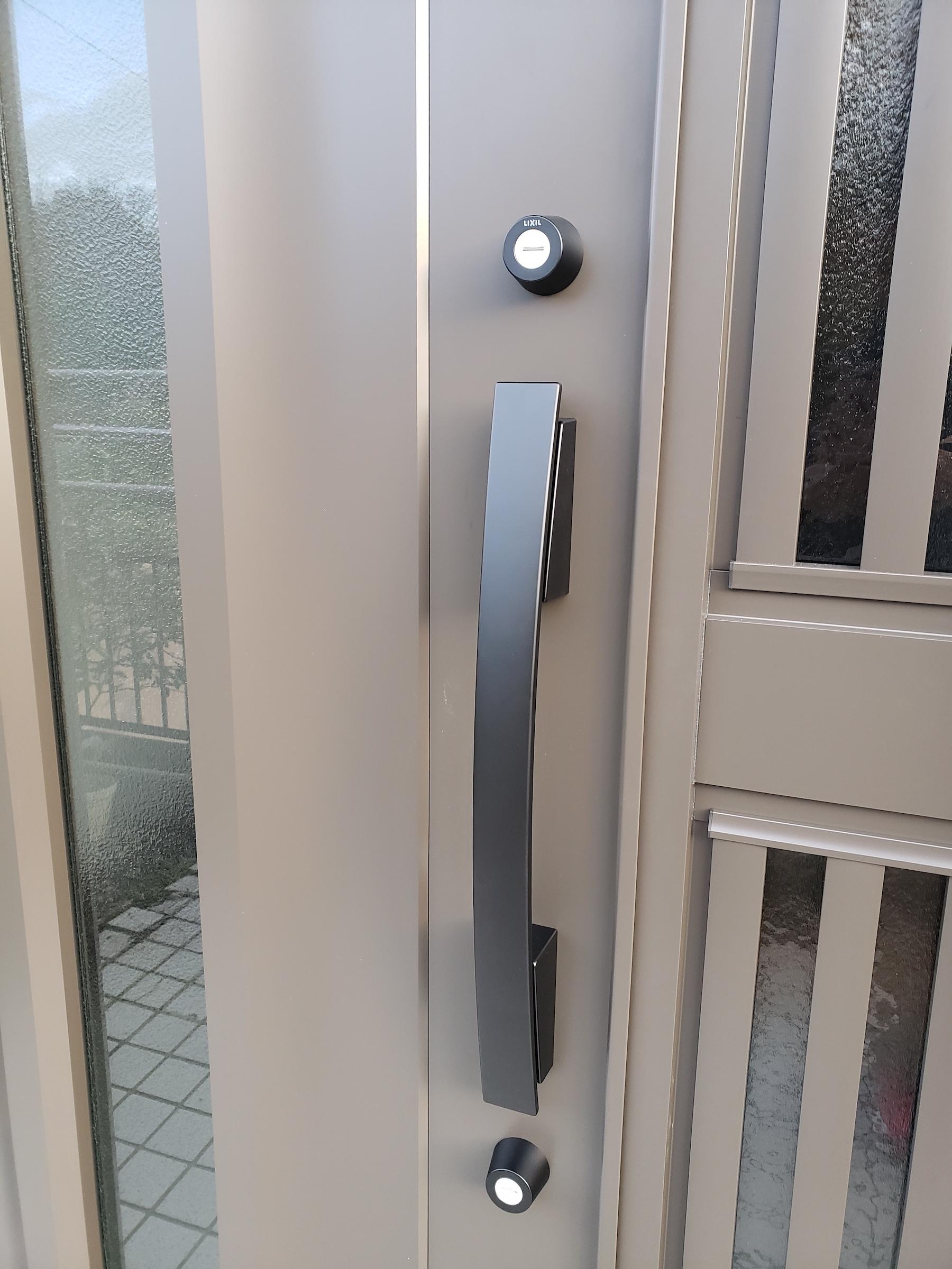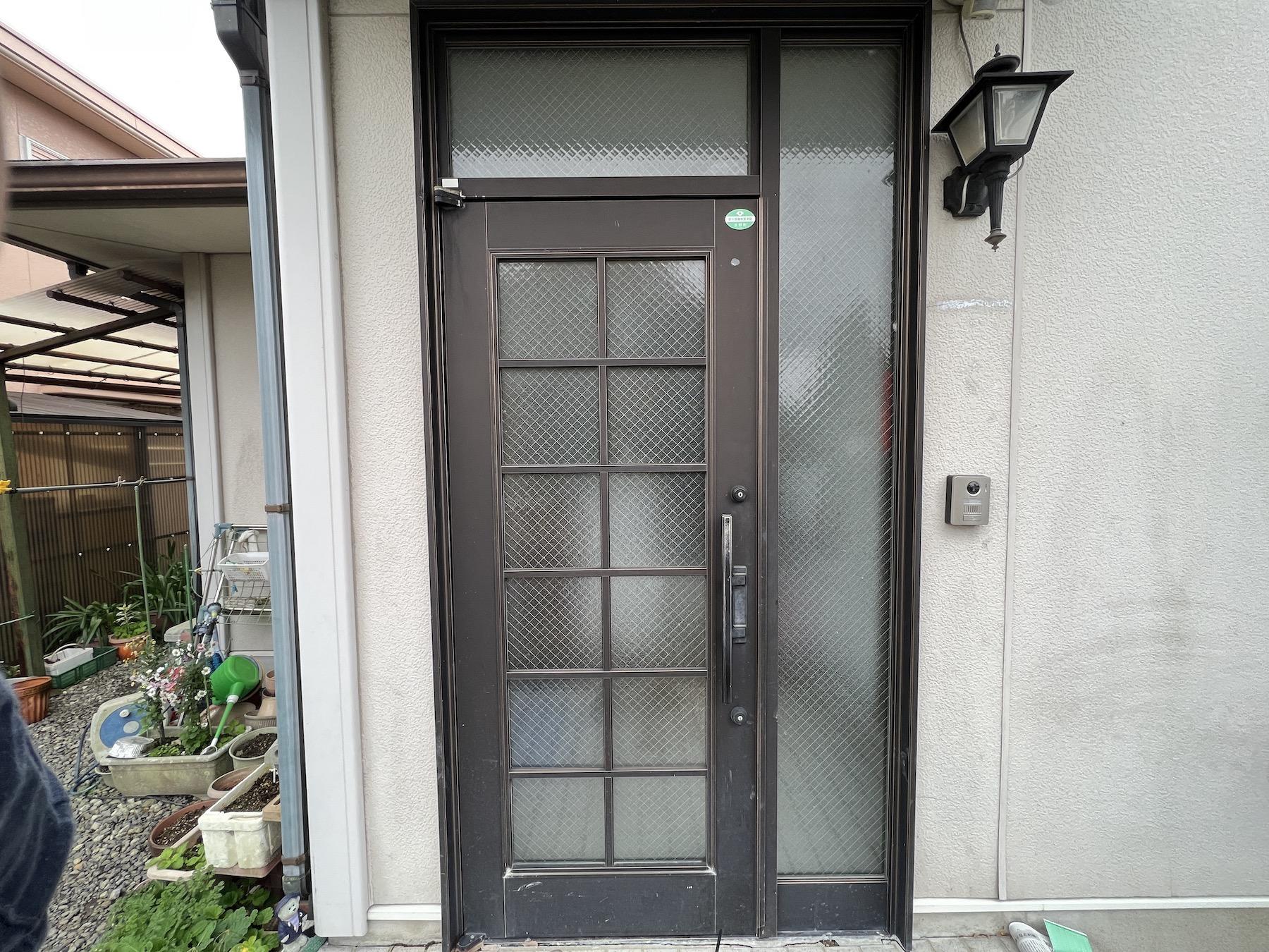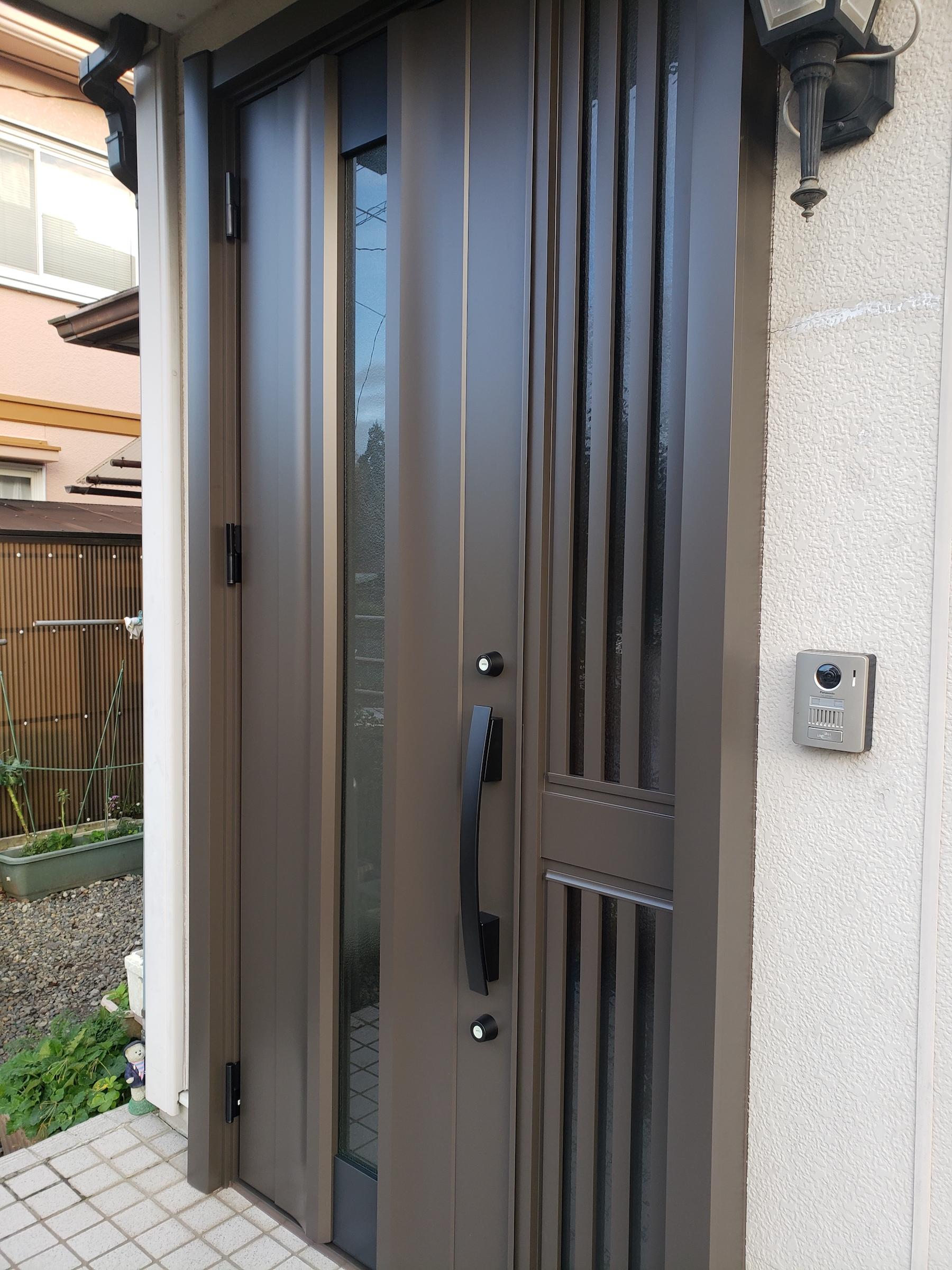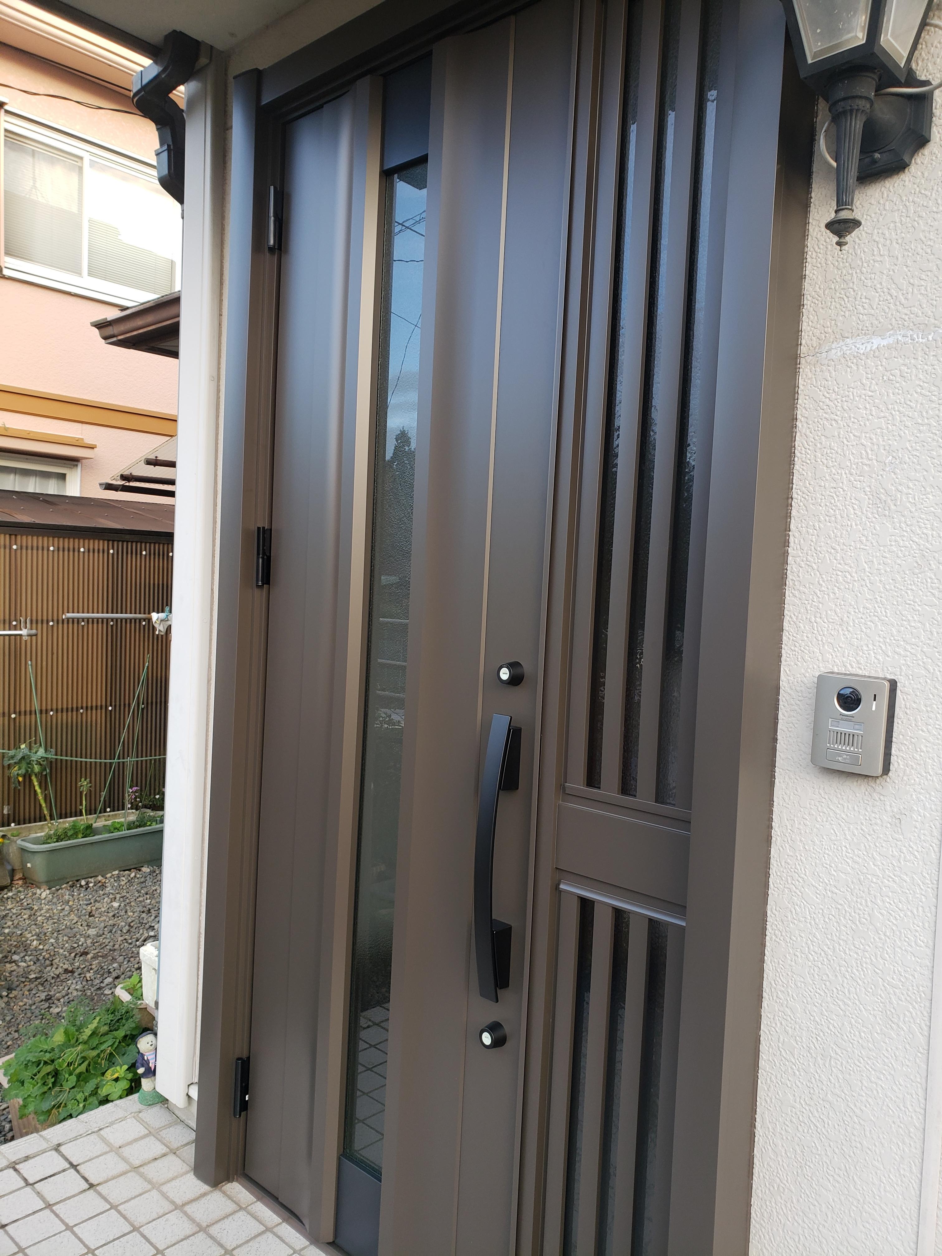 玄関ドアの取り替え工事を行ないました。1日の工事で取替えることができます。黒のドアノブがシックでかっこいい印象になりました。既存の玄関照明ともマッチしていて統一感のある玄関になりました。防犯性もアップします。