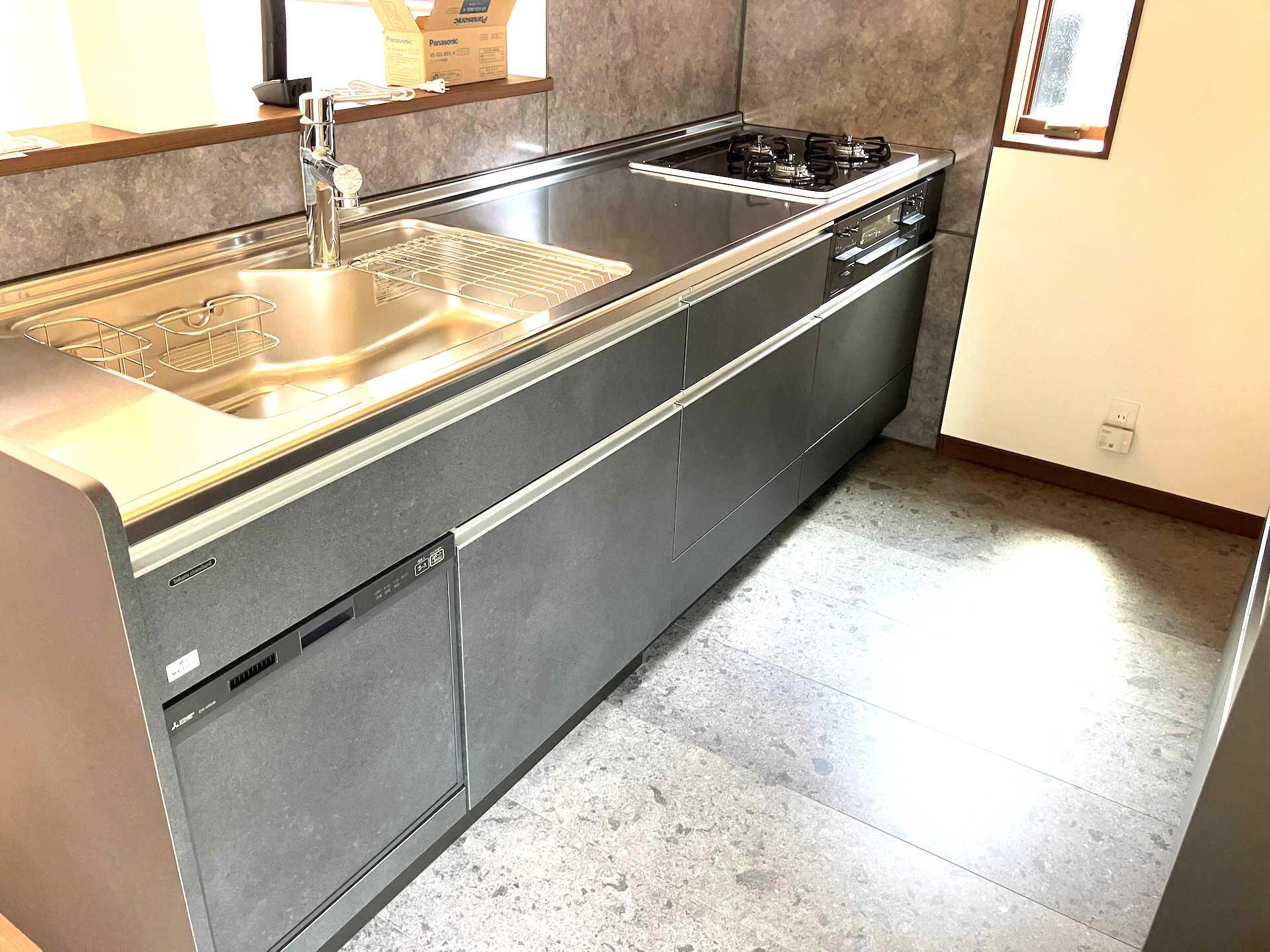 キッチンの水回りのフロアにはLIXILラシッサ耐水を採用。ストーングレーのフローリングがかっこいいです。