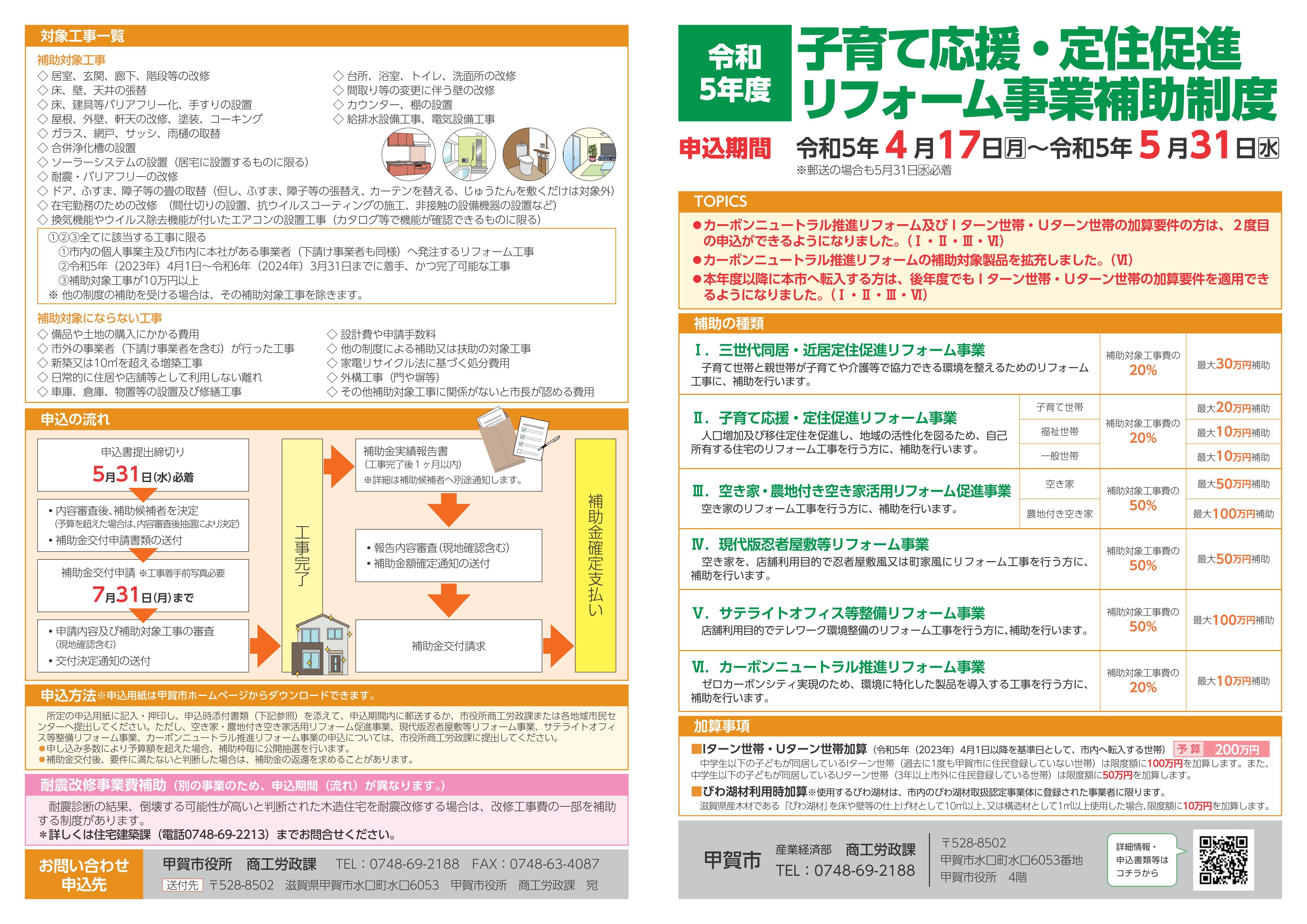 令和5年度甲賀市リフォーム補助金案内チラシ (1.8 MB) 一覧へ戻る