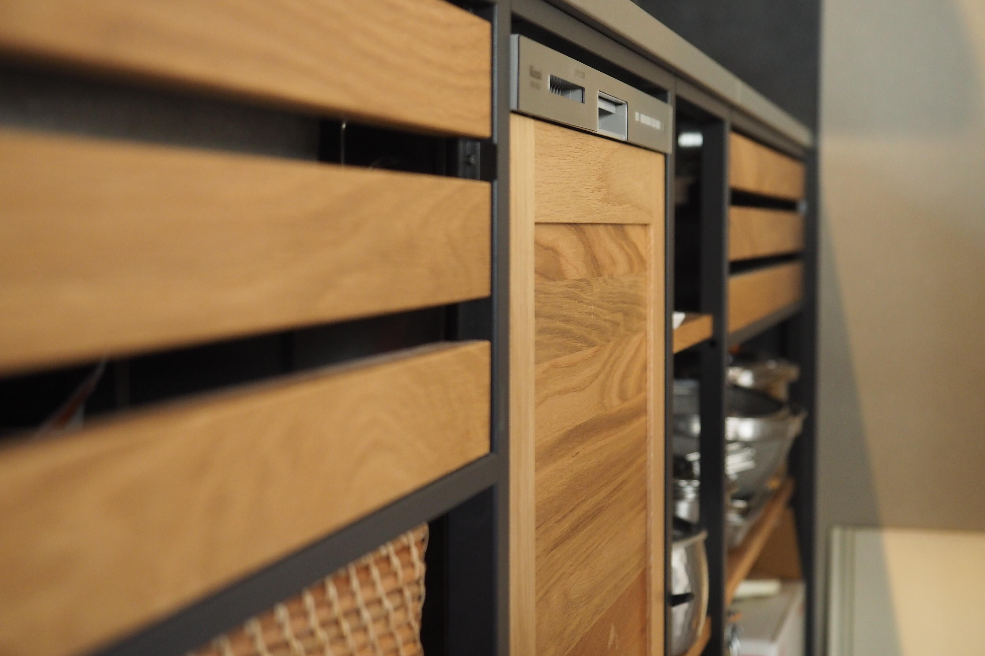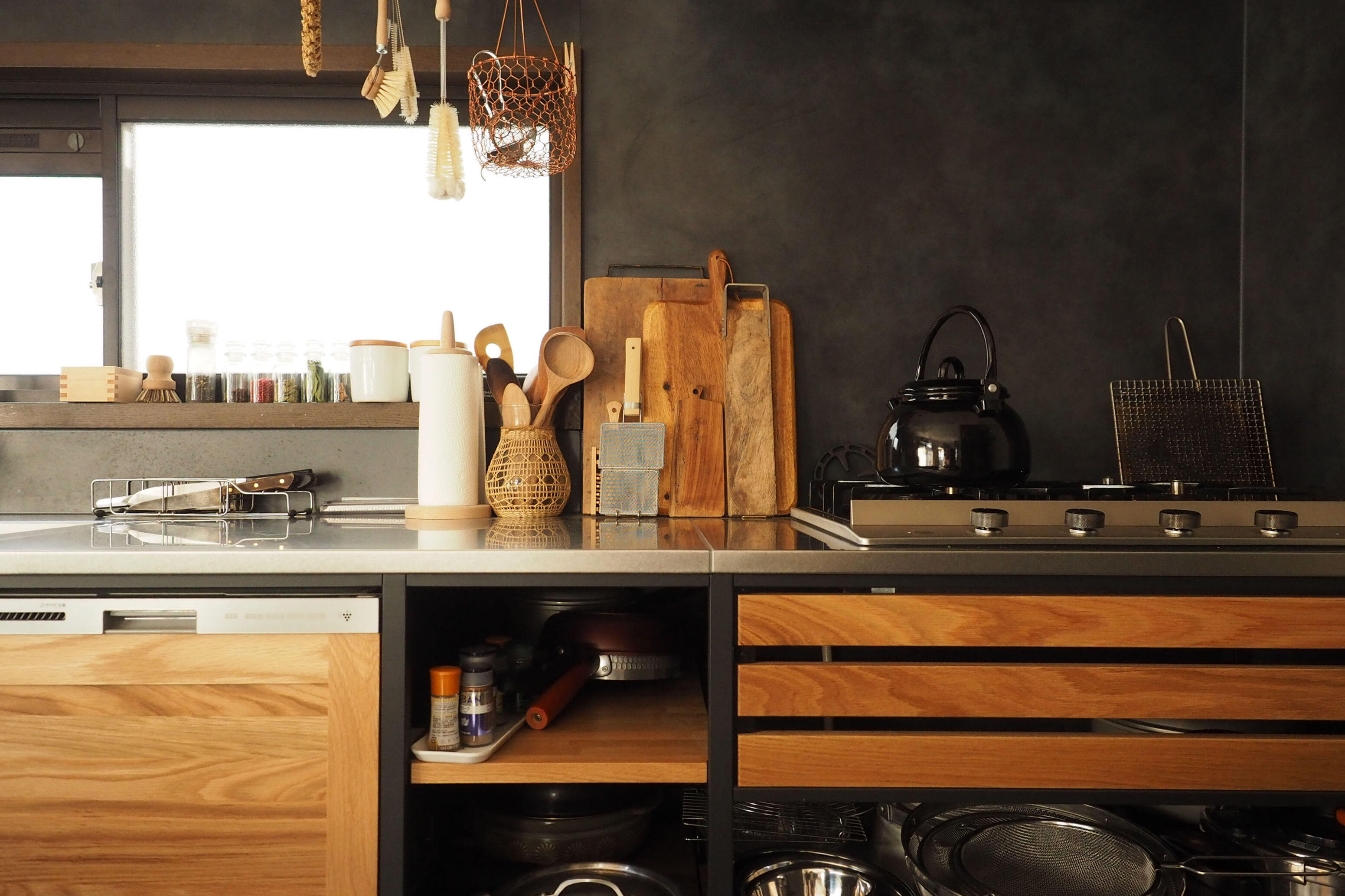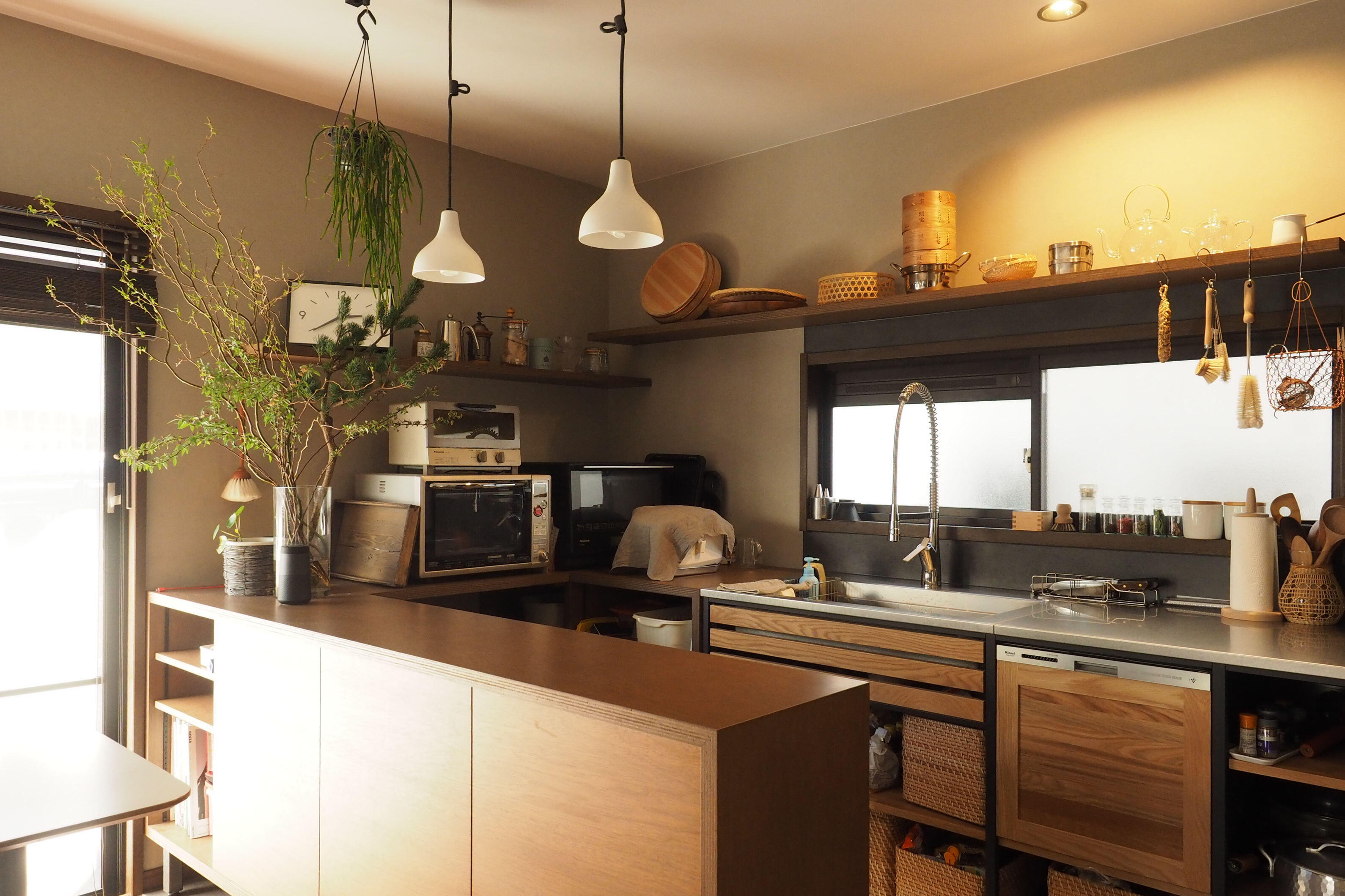 それだけで主役になるWOODONEのフレームキッチンが、名脇役として存在。全面で主張するラワンの風合いと、目透かしの凹凸による陰影を生かしたシンプルで線と平面からなるワークキャビネット。上部には同じラワン材を使用したシンプルな棚が、キッチンの目線を分割し、ギャラリースペースのような存在に。このキッチン空間に似合うのはWOODONEのフレームキッチン。 リノベーションで変更しなかった窓も、丁寧なつくりの料理道具が整頓されることで、丁度いいエモさとなっている。ラワンの色合いと、竹や木、藁などの調理器具の色合いが溶け合い、暗いキッチンパネルがまるで京都のおくどさんのように写真に映える。 完工時、キッチンやラワンのキャビネットの美しさをフレームに収めきることが出来なかった。それぞれのプロダクトとしての完成度は高いが、構造的にシンプルでどう写真として表現していいかわからなくなってしまった。完工の直後というものは、なにもない状態として撮影できる最後のタイミングだが、ある考えからそれ以上シャッターをきることをしなかった。 引渡からしばらくして、このタイミングだと言うときが来て撮影をお願いした。完工直後のシャッターのキレの悪さとは打って違って、シャッターを切る指が止まることはなかった。調理器具、食器、調味料入れ、植物・・・それらをこのキッチンがいかに引き立てることか。このキッチンはリビングの主役にして、すべてのものを主役に昇華させる存在だったのだと改めて認識した。 おろしたての服を着ると背筋が伸びるように、住まいの空間が変わると、ライフスタイルもこうしたい!という夢に近づくような気がする。 リフォームやリノベーションには機能性のアップは命題であるが、どのような住み方がしたいか?という夢を叶えるのも大きな目的の一つだと思う。 静かな写真。昼にはゆったりとした時間が流れ、それでも、友達や家族が集まるとにぎやかな楽しいひと時が流れる。しっとりとした設備やインテリアの風合いに、家族の明るさがよく映える空間。