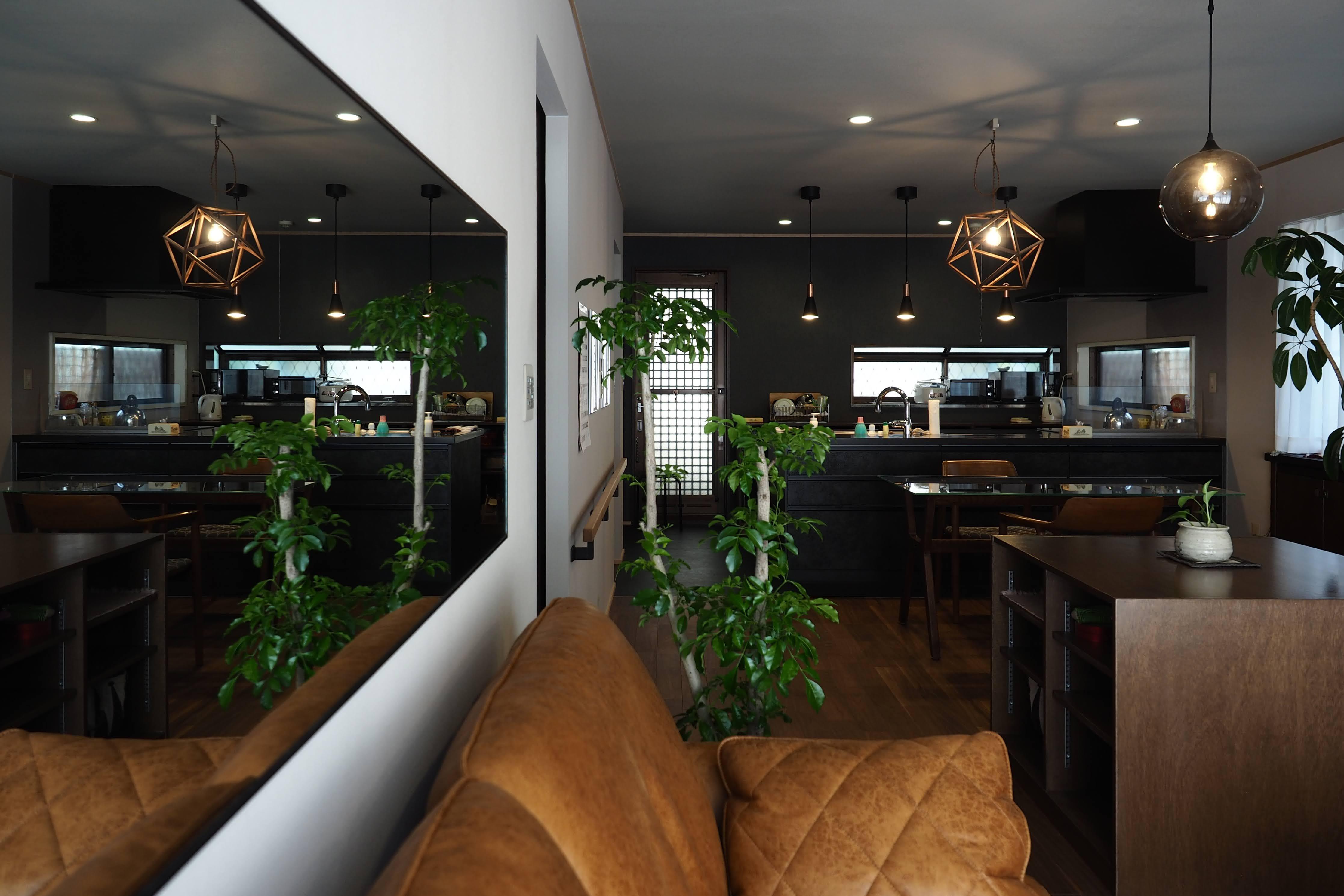 また、もとからあったものや、木材やブラケット金物を組み合わせてつくったオリジナルの手すり。壁への配置はどれくらいの高さにするか、棚上にはアイテムは何個まで、、、と、レイアウトも含めて施工をいたしました。 自分も、そしてお友達も心地よく過ごせる空間、そして今後ソファがベッドに置き換わったときに、この1フロアで満足して毎日を過ごせる空間として提案、施工をいたしました。クリナップのシステムキッチンラクエラに関しても、メーカー納品そのままでは、せっかく天板も面材も黒調のラスティックなのに、ケコミが横一文字で真っ白だったり、棚の間から骨組みの白がチラ見えしていたりしており、黒の床材を加工してケコミを黒くしたり、引き出しから見切れる下地に黒のテープを貼ったりと、妥協せず仕上げました。 「すべてあなたに任せるわ」 という言葉を頂き、本当に私の提案を受け入れて頂きましたが、少しでも仕様に変更がある場合は逐一ご相談させていただきました。様々なプランや商品、レイアウトなどをご提案いたしましたが、最終的にご決断され、このように素晴らしいリフォームができたのも、お施主様のセンスありきのものです。写真に写っているもので、一部社屋や私物から持ち出して撮影しているものもあり、植物をこのくらい置きたい!とご提案がまだまだあります。定期的にご訪問し、お困り事や、住まい方のご相談もしてまいります。今後ともどうぞよろしくお願いいたします。