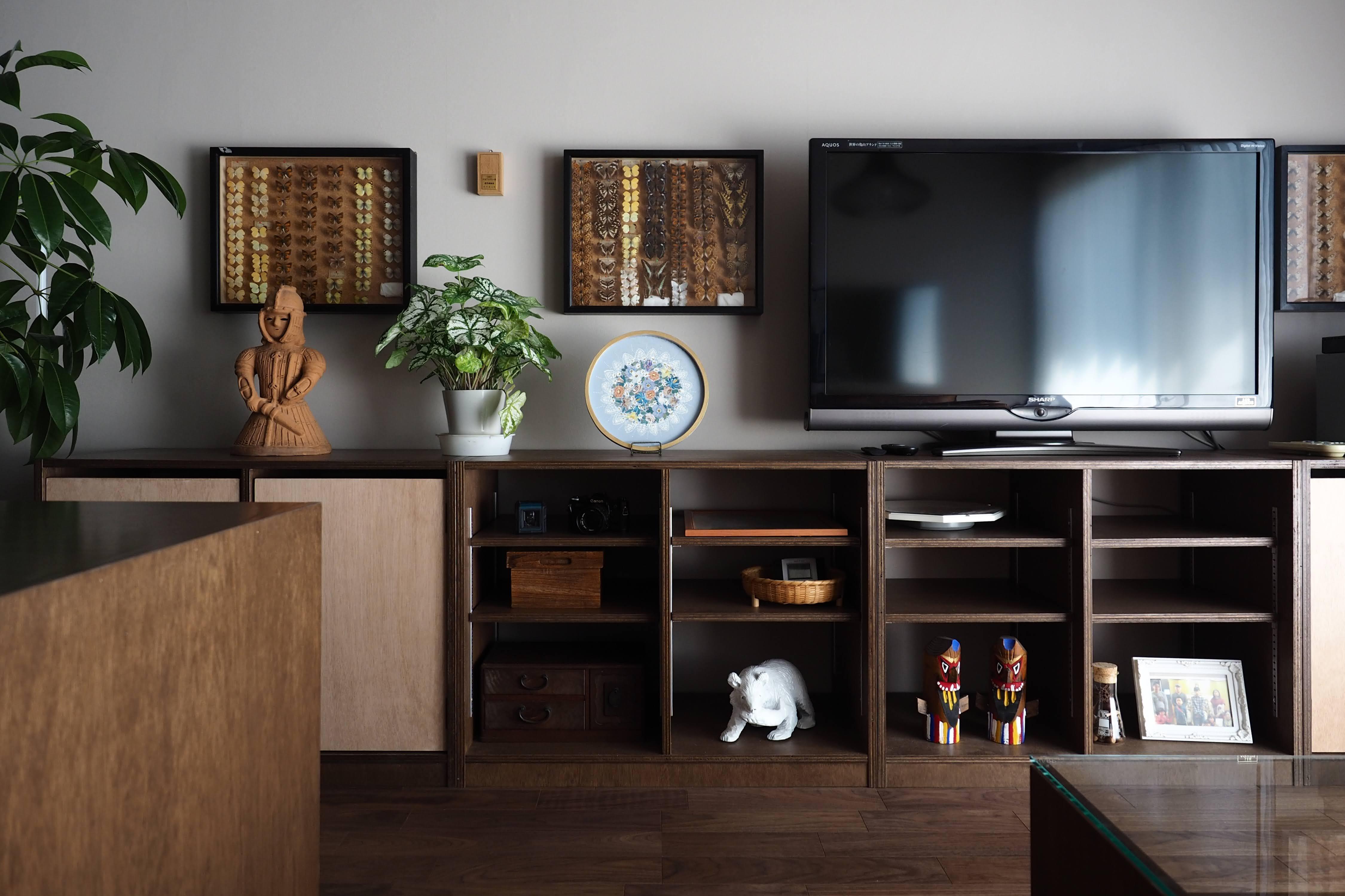 今後の生活を見越して、リビングで生活が完結できるようにしたい。一番長くいる場所だからこそ、使い勝手はもちろん、昔からの「家」に対して抱いていた夢を叶えたい。とのご相談から今回、キッチンの入換、部屋に凹凸をつくっていた既存収納やキッチン壁の立ち上がりなどを解体し、キッチンやダイニングテーブルのレベルに合わせた収納棚の造作をすることで、20帖近いLDKの統一感と、ものが床や棚上に溢れない収納量の確保、そして造作棚であえて動線以外の床を覆うことで、壁や手すり、テーブルや造作棚など、部屋全体で伝い歩きが出来るような空間を設計。