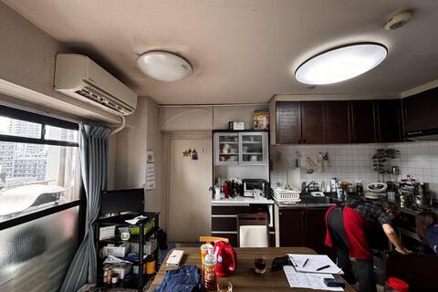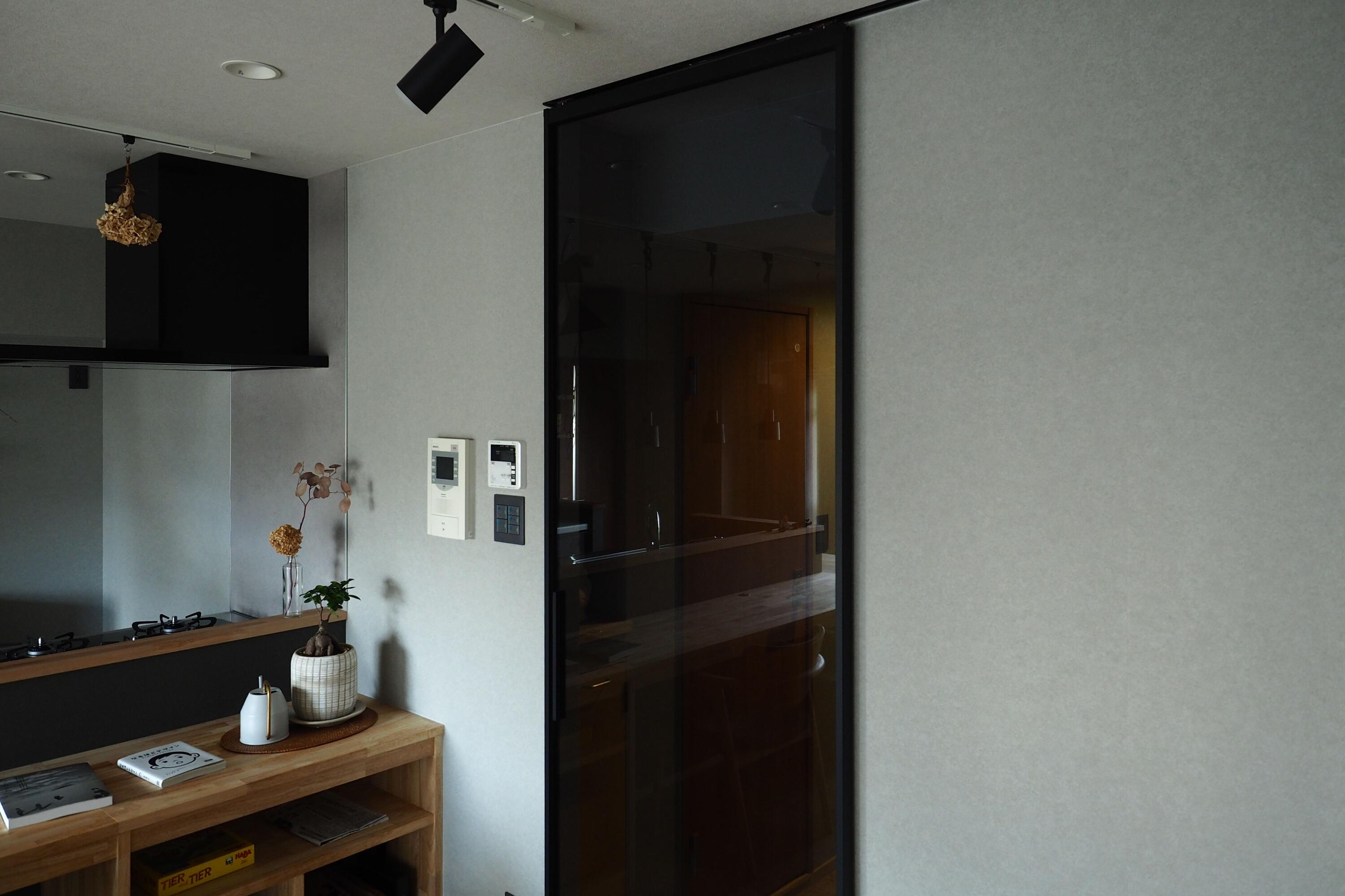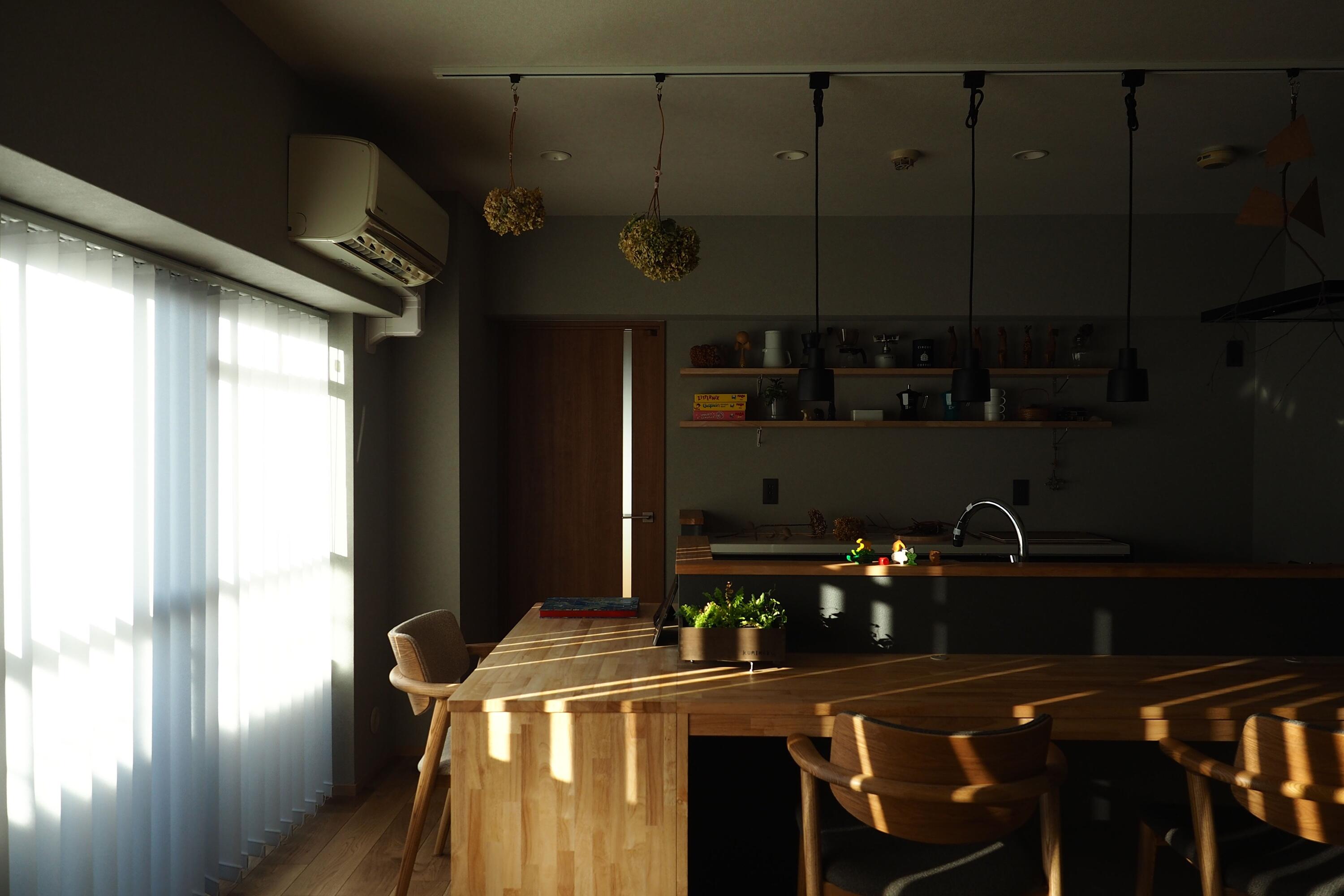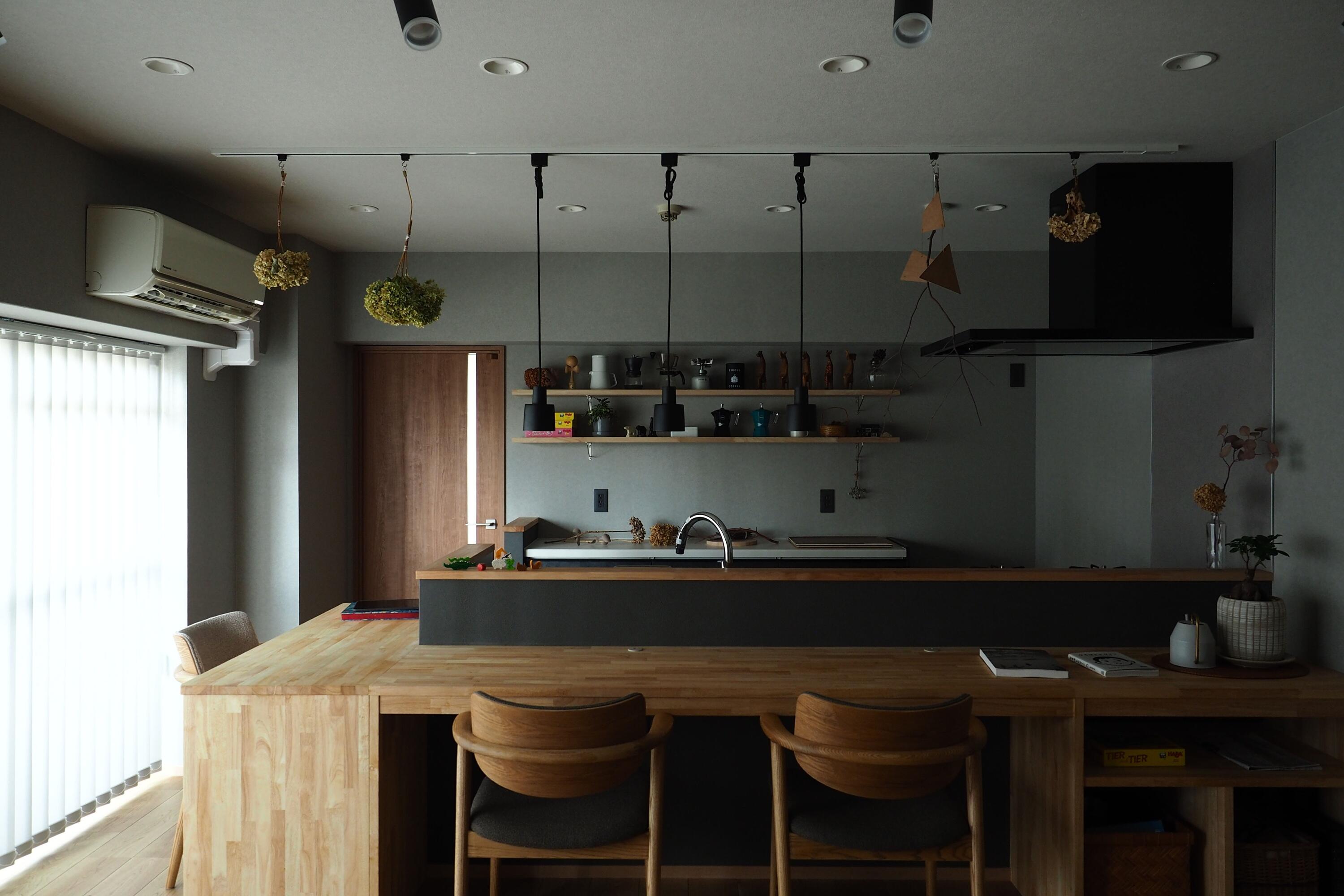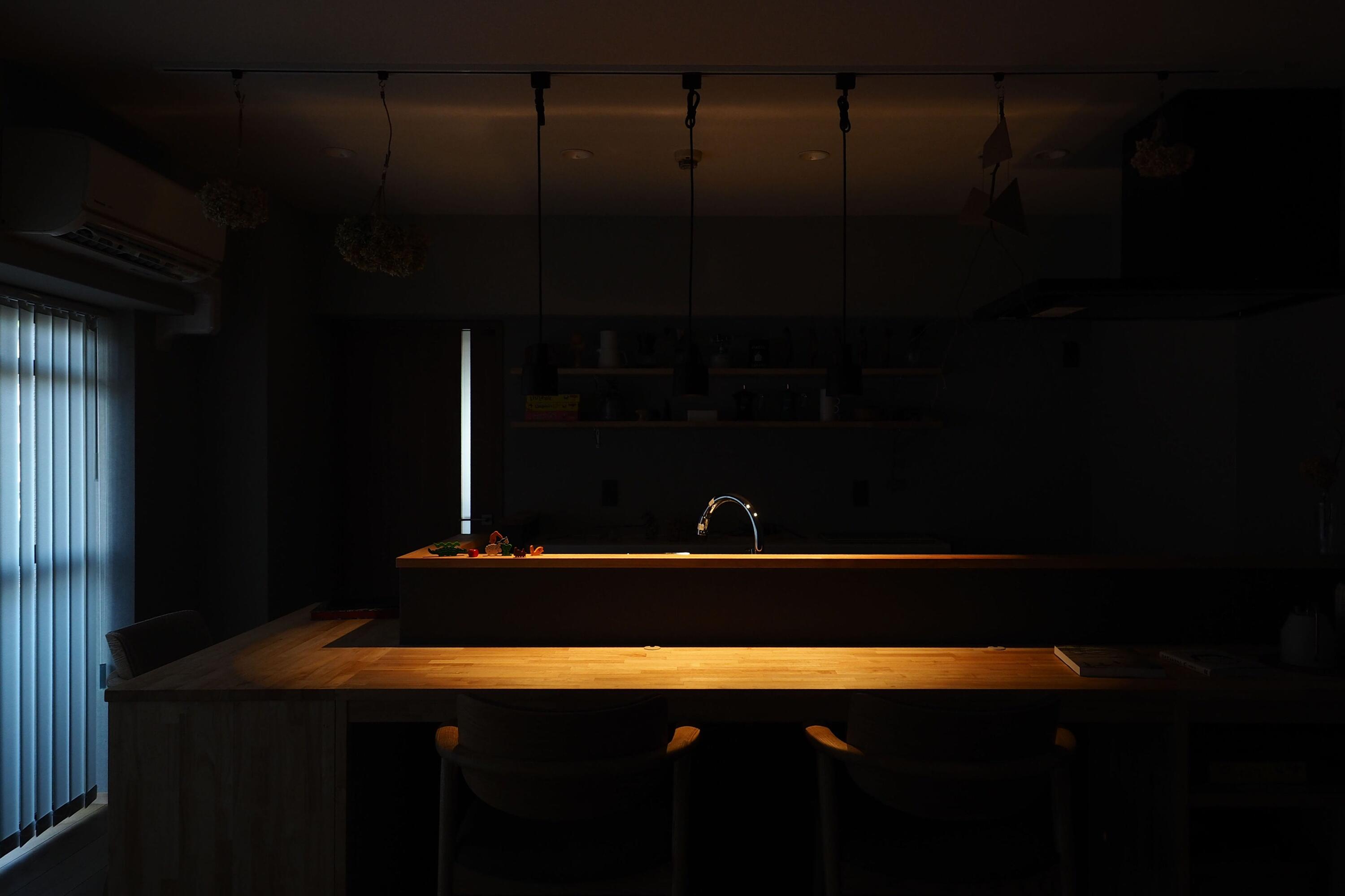当初、マンションのキッチン改修をメインに、各種水回りの入換、ダイニングキッチン+隣接する和室や廊下のクロス張替程度のリフォームを考えられていましたが、廊下だけが高く各部屋に段差がある、LDK入口入ってすぐに壁が立上り圧迫感がある、など、バリアフリーや空間の圧迫感を解消するために、床壁天井、すべてをめくってのスケルトンリフォームをご提案させていただきました。 くつろげるキッチンダイニング 改装計画を会話していく中で、LDKの半分を占めるキッチン+カウンターテーブルを中心にプランをしていきました。これからの暮らし方は基本的に単身での暮らしとなり、ダイニングテーブルやリビングソファ+テーブルなど大きなセットは置かず、来客があっても広いキッチンカウンターで十分過ごせるようなキッチンを主体とした部屋作りをプランさせて頂きました。 乾式二重床工法による自由な床選び。梁や柱をふまえた収納造作の収まりの計画。床色、キッチンの扉色から壁紙の品番、キッチンパネルから収納造作の色合い。そしてそれにアクセントとなる機器類の色の統一。照明計画に家具やカーテンの提案。部屋作りに関わる全てをお施主様と話し合い、トータルでご提案させていただくことで、統一感ある部屋作りをさせて頂きました。 リフォームの際し仮住まいに移られるための断捨離。それらを納める収納の容積の確認など、これまでの暮らし方、新しい暮らし方、どう生き生きと暮らされるか?未来の姿を想像してプランさせて頂きました。時間帯や照明のスイッチングによって表情を変える空間をぜひ自由に楽しんで暮らしていただきたいです。