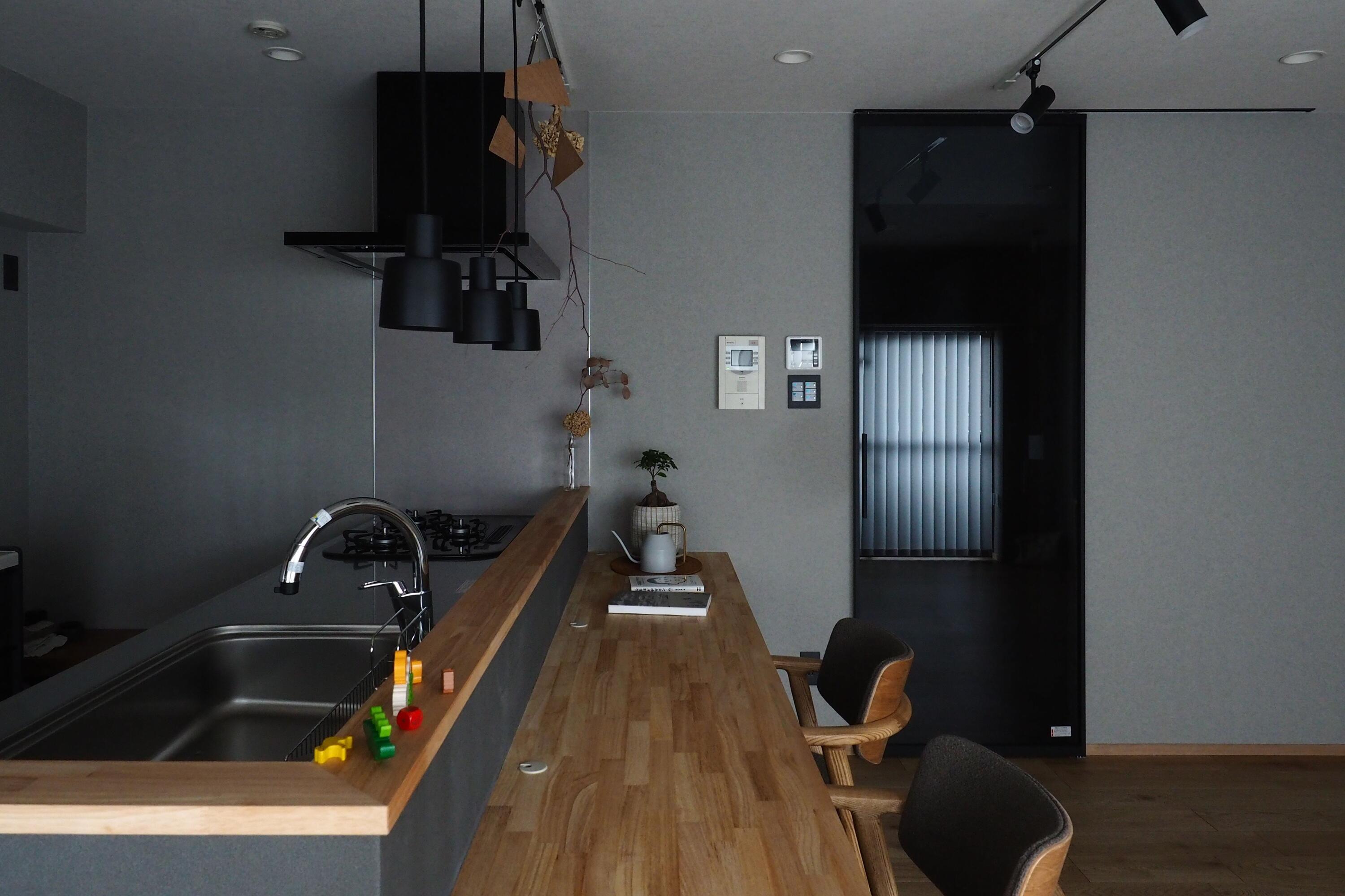仕事もひと段落つき、人生の折り返しにさしかかった時、これまで二の次だった「家」のことに目が行くようになった。寝るために、疲れをいやすために、食事をとるために・・・雨風がしのげて片付いていれば、というこれまでの価値観から一転、家族の声が届きだし、38年間、建築当初からリフォームもしたことのなかった我が家を最高の家にしたいとのことで、ご相談をいただきました。格好いい住まい、モダン、理想、色のお好みやライフスタイルを伺い、新しい暮らし方や、専用に設計した造作家具、これまであまり興味のなかった家具や照明の選定など、住設機器にとどまらず全てのライフスタイルをご提案いたしました。