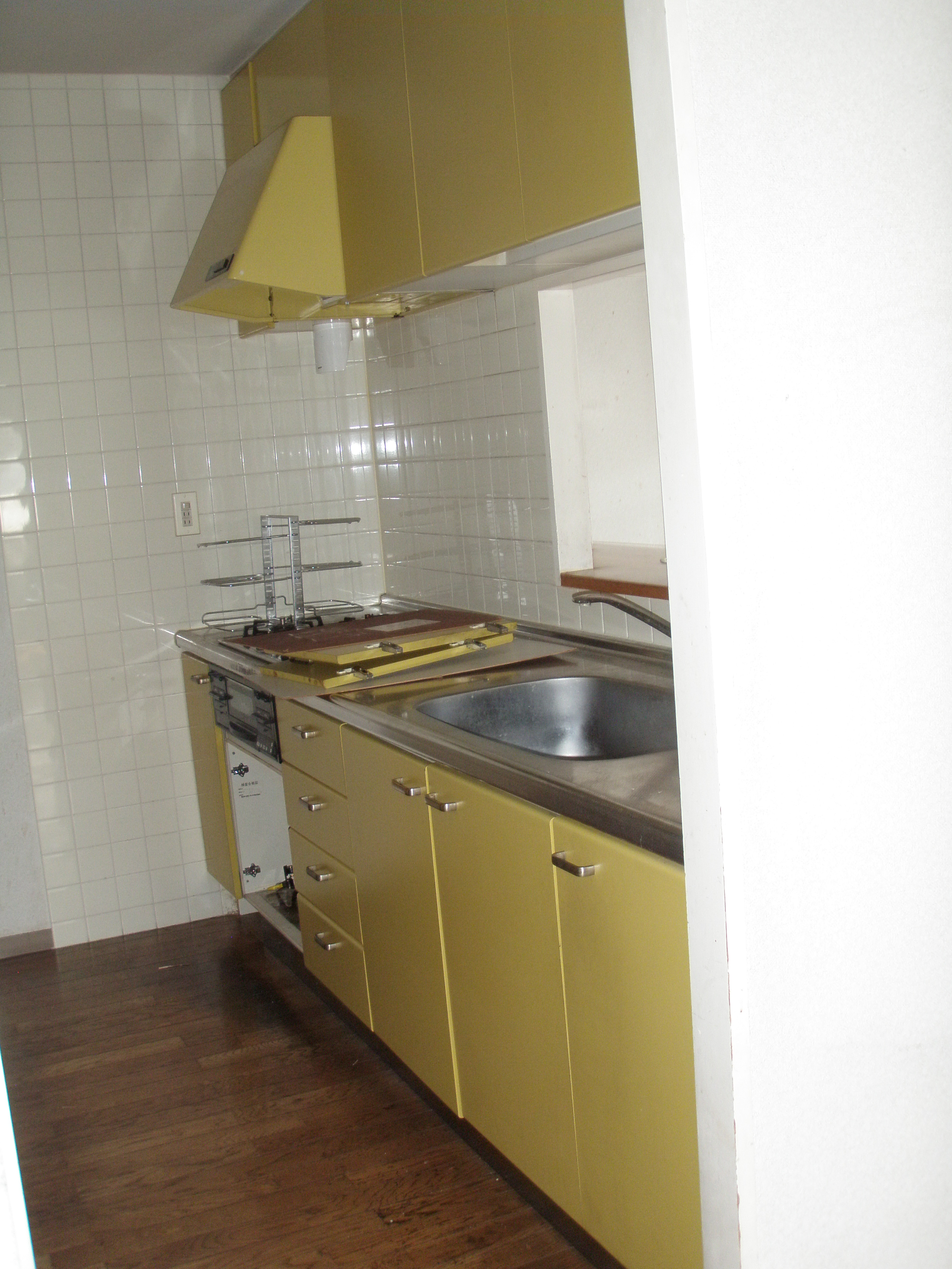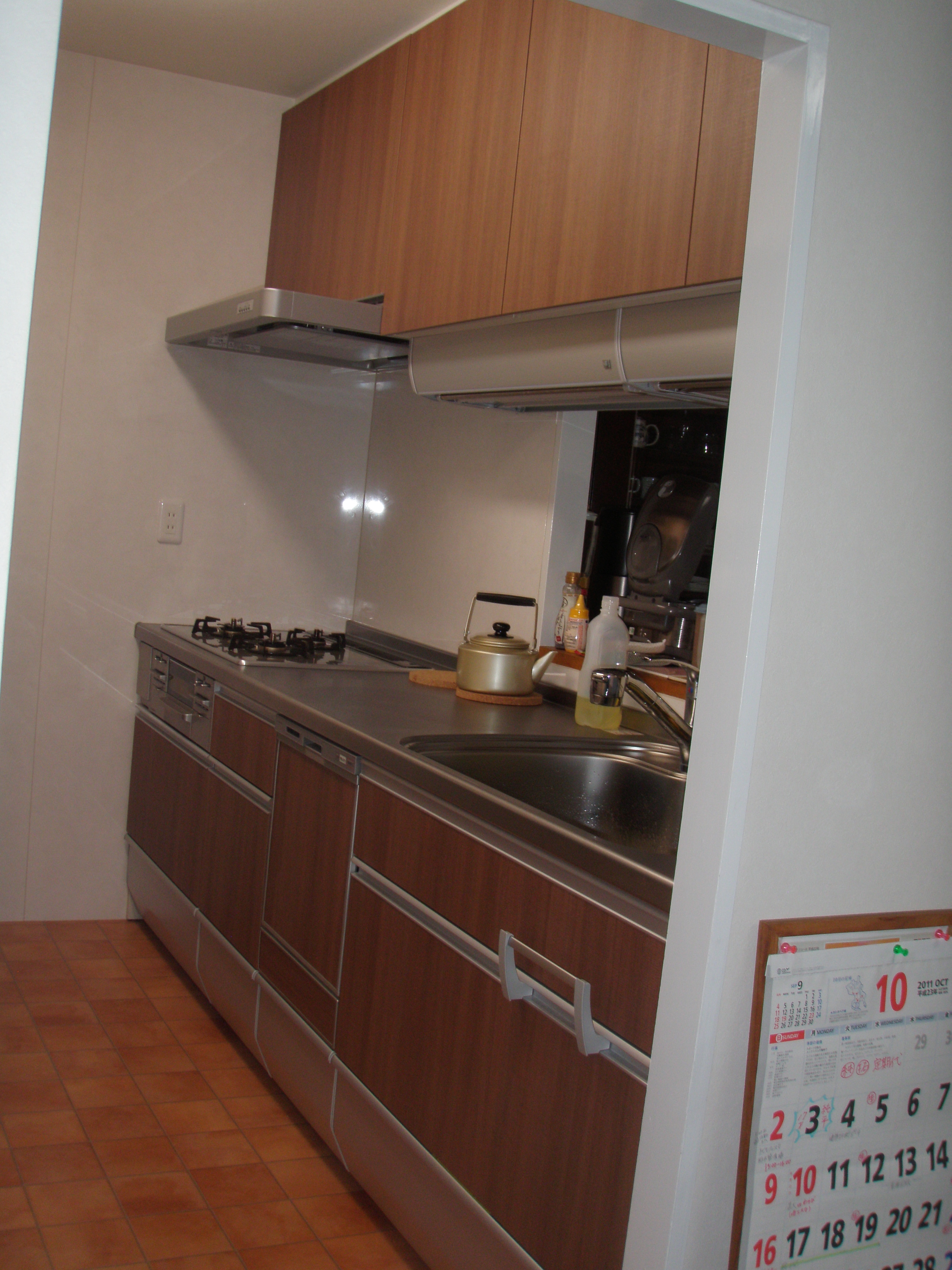 公団のキッチン交換をしました。クリナップのクリンレディ(L=2700)を設置しました。 排水の関係で約5cm程床が上がってしまいましたが、収めることができました。 木目柄の面材を選んだので落ち着いた感じのキッチンになりました。 タイル面もキッチンパネルを張ったので掃除がしやすく収納がたっぷりできるので大変喜んでいただけました。
