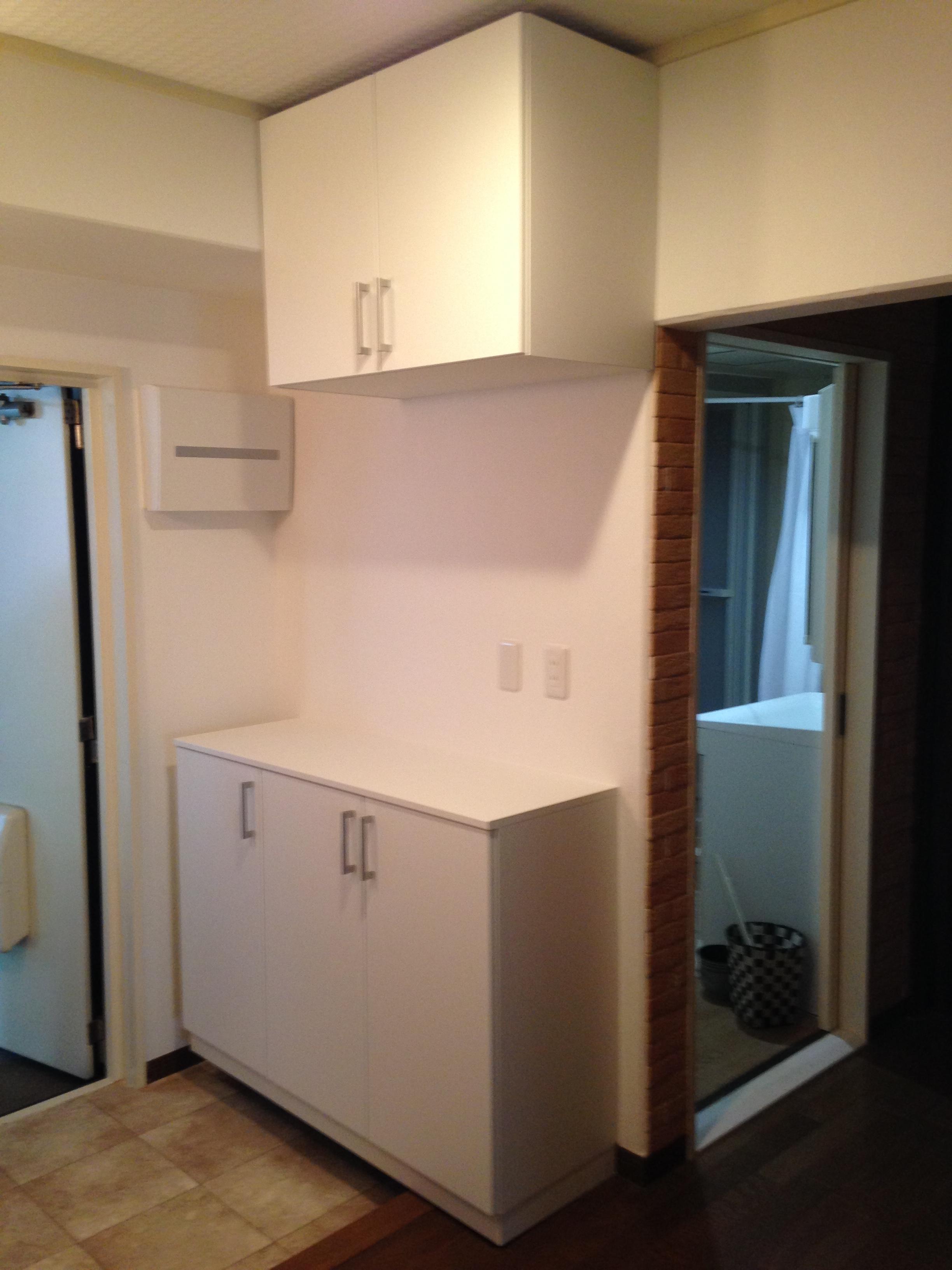 古い下駄箱がありましたが、収納を増やしたいのと下駄箱の上に物を置きたいとの事で、下駄箱を交換しました。 一緒に玄関・廊下のクロス.CFの張替え、電気の分電盤交換もしました。