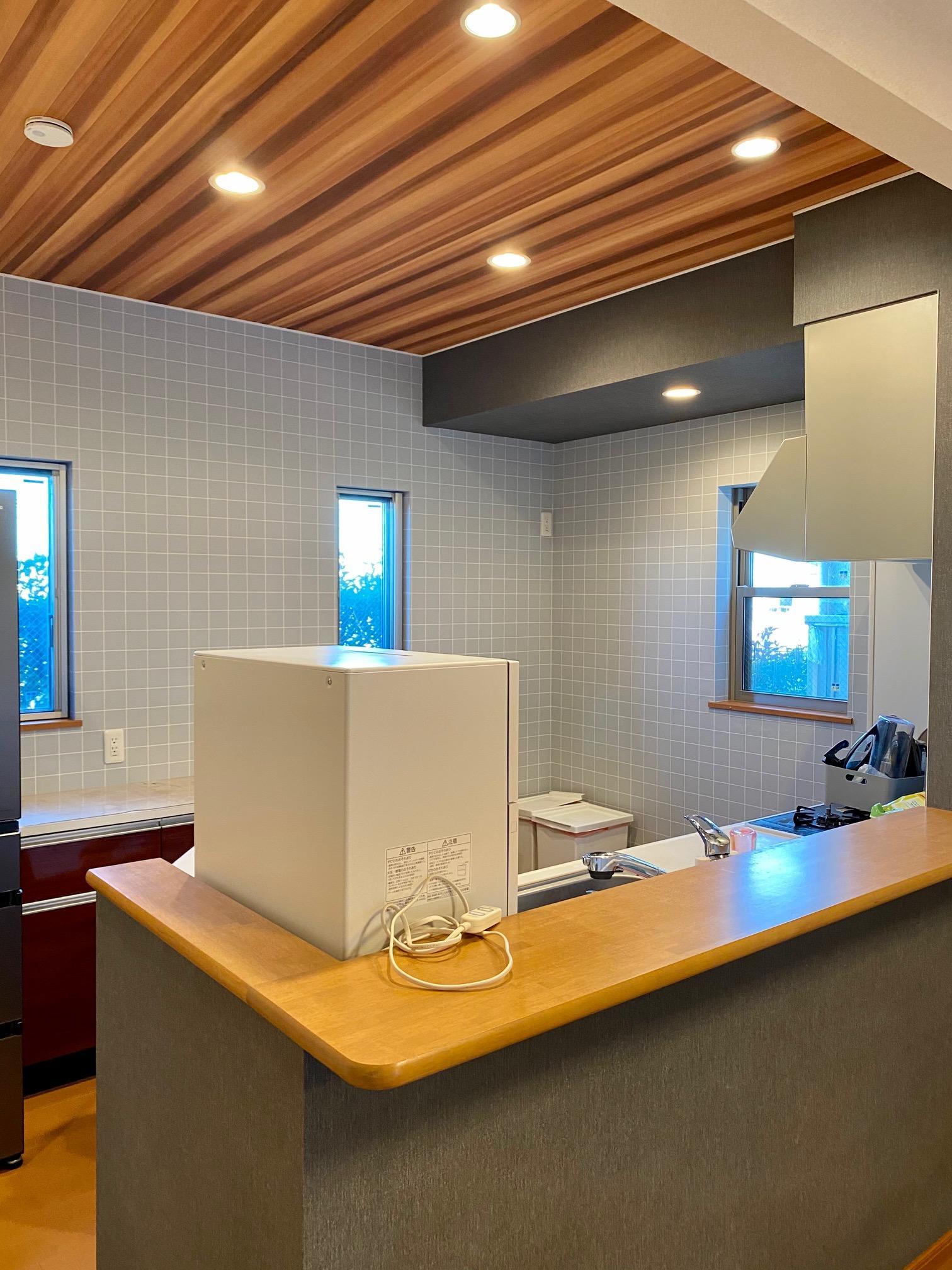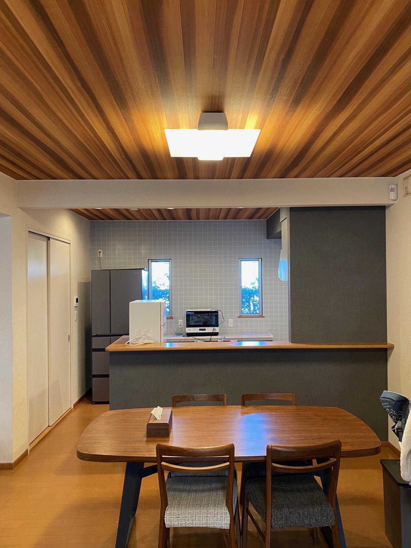リビングの照明をダウンライトへ交換し、天井のクロスは木目のはっきりしたデザインをセレクト。