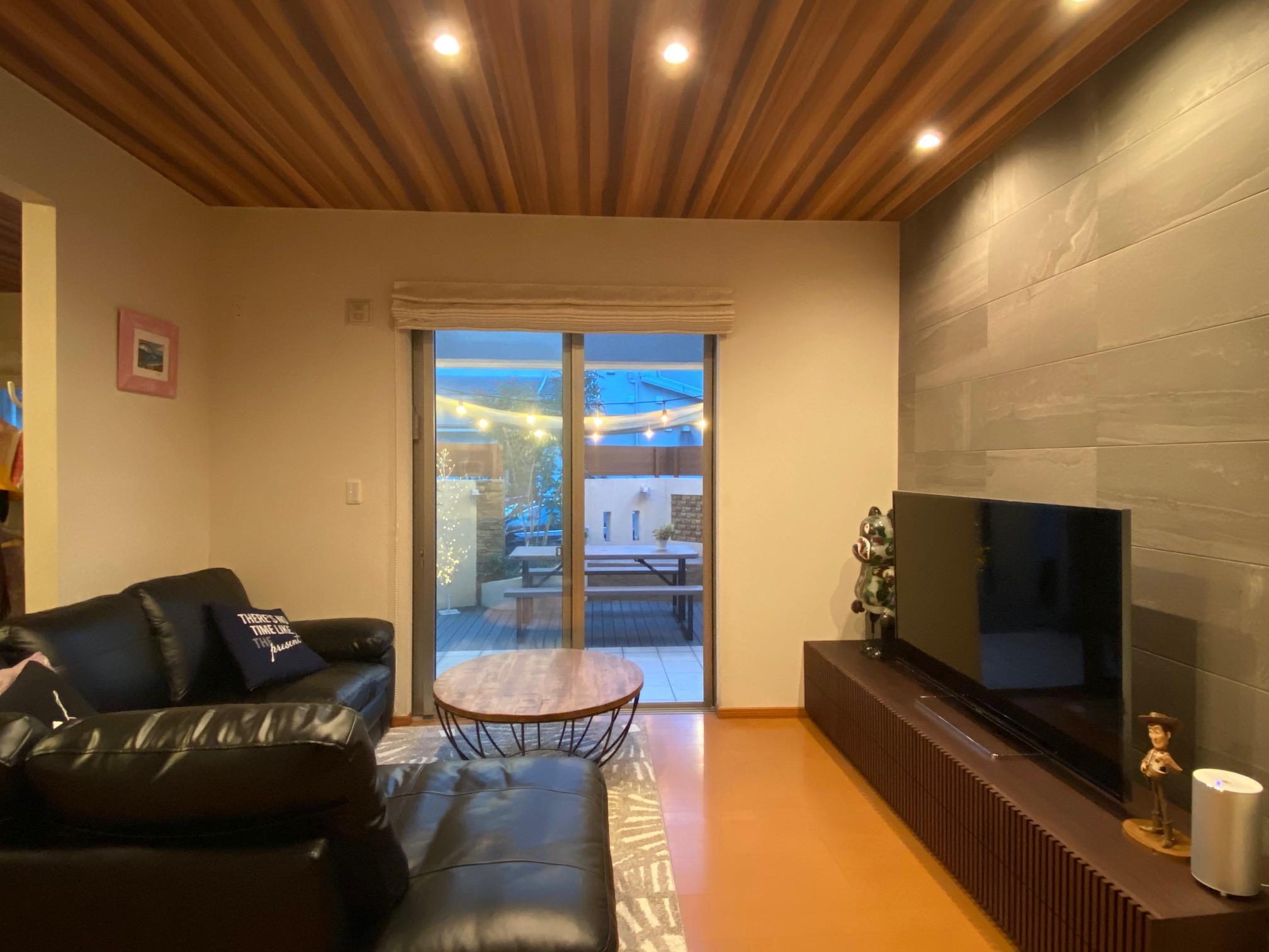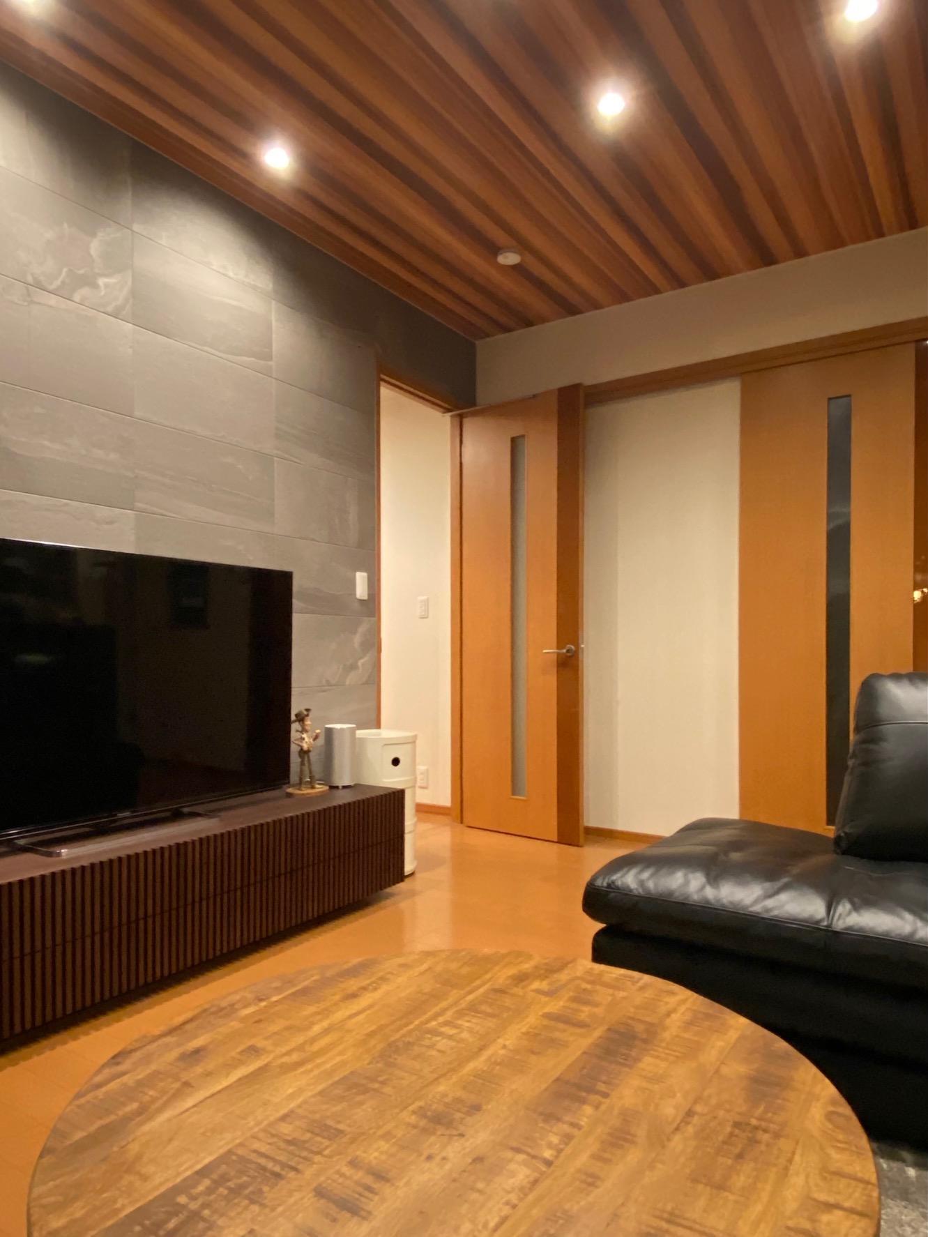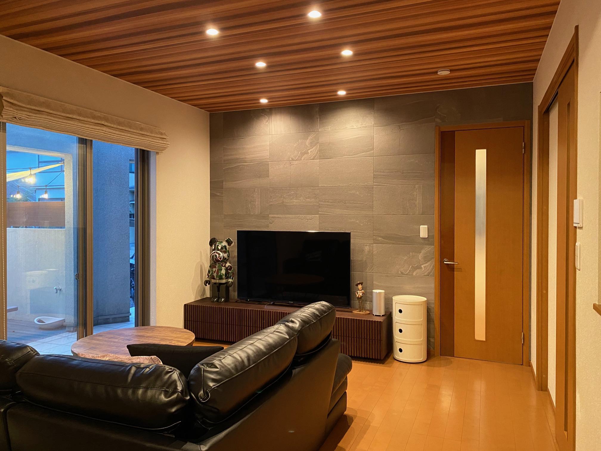 テレビの後ろの壁にはエコカラットプラスのストーングレース。壁の近くにダウンライトを2基追加して、壁面を照らして雰囲気を出しました。
