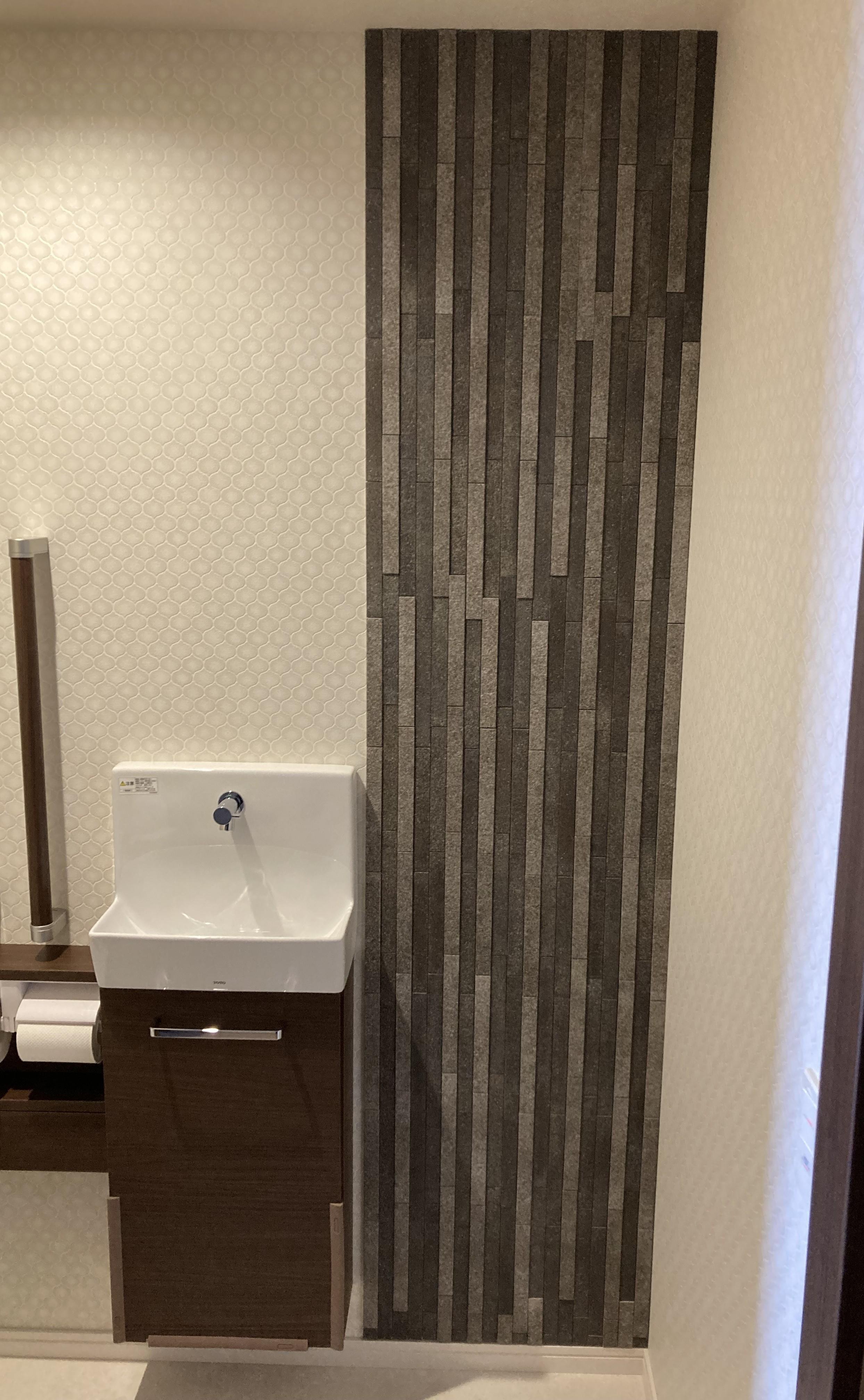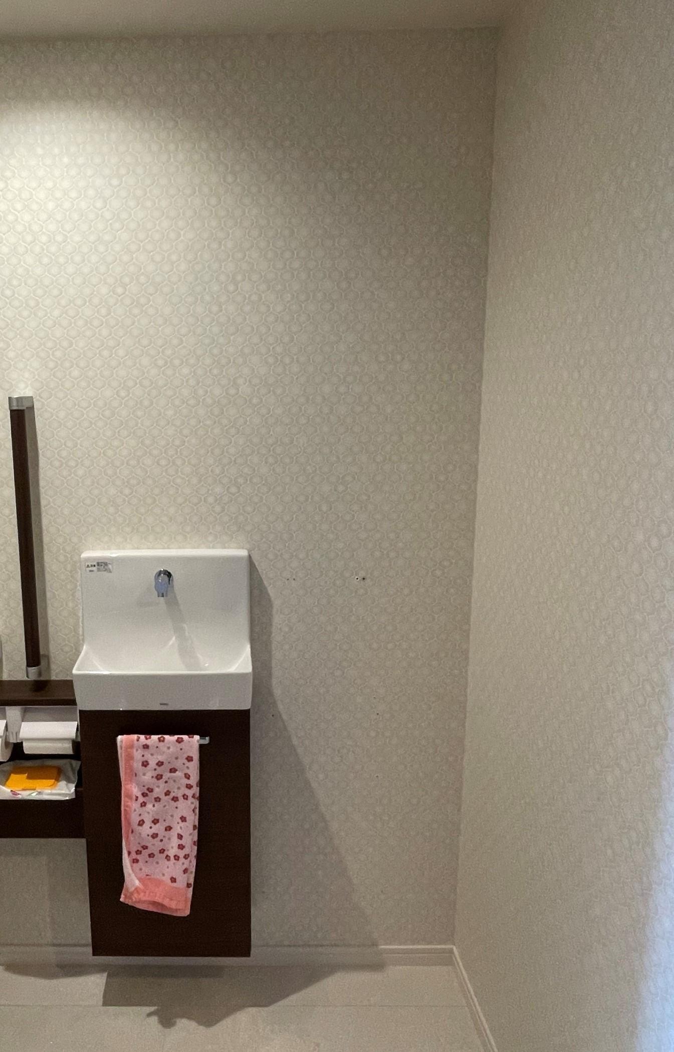 手洗い器を移設した際に、クロスにビス穴が出てしまったので、それを隠したいというのと元々エコカラットを付けてみたかったとのことでご依頼いただきました。
