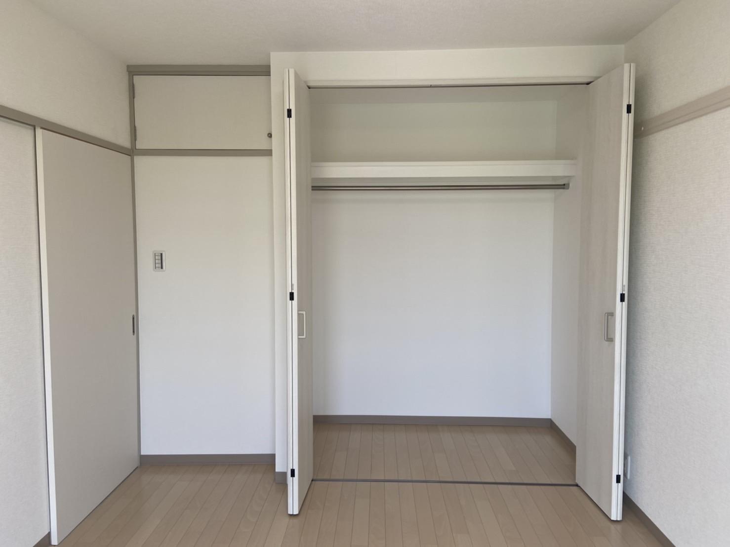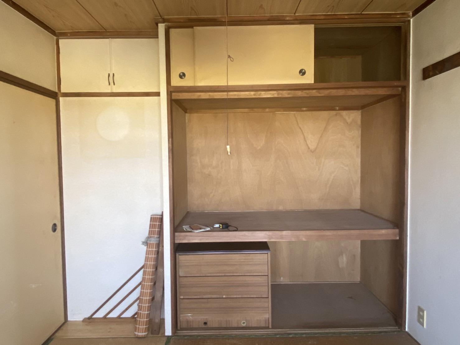 中の収納は枕棚とポール1本で、押入れだったこともあり下には奥行きのある収納ケースも置くことができます。