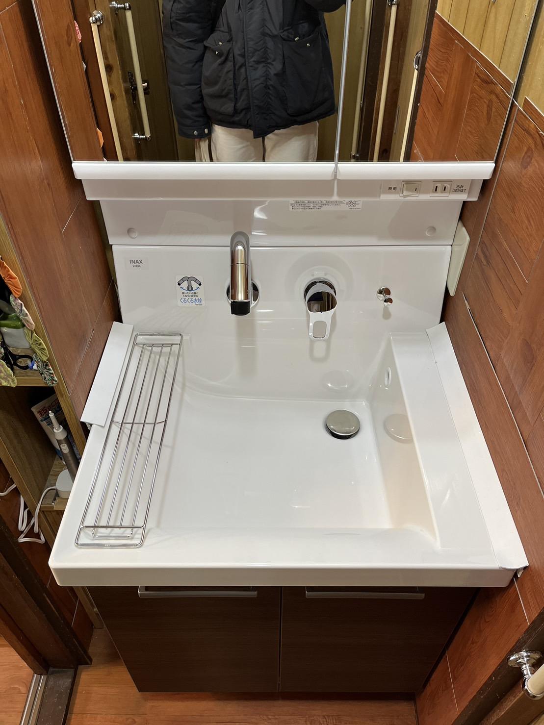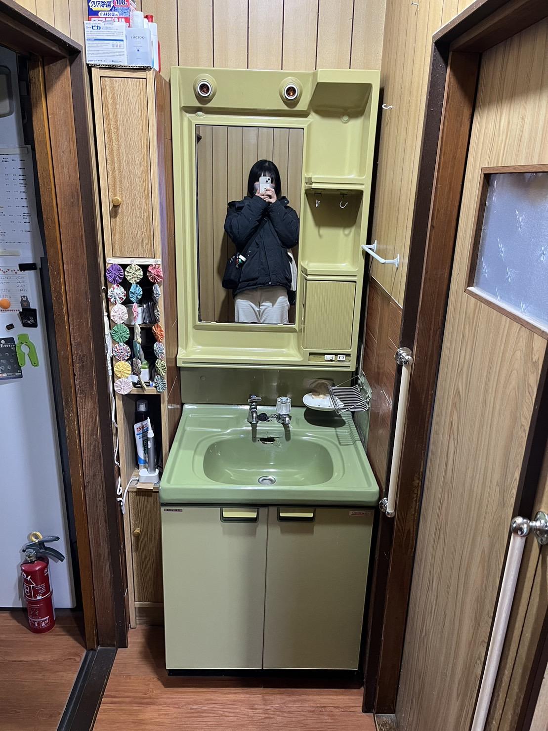 元々はグリーンで統一されたレトロでかわいい洗面化粧台でしたが、