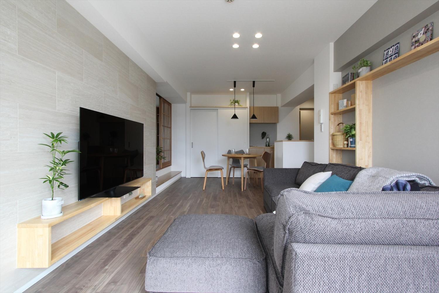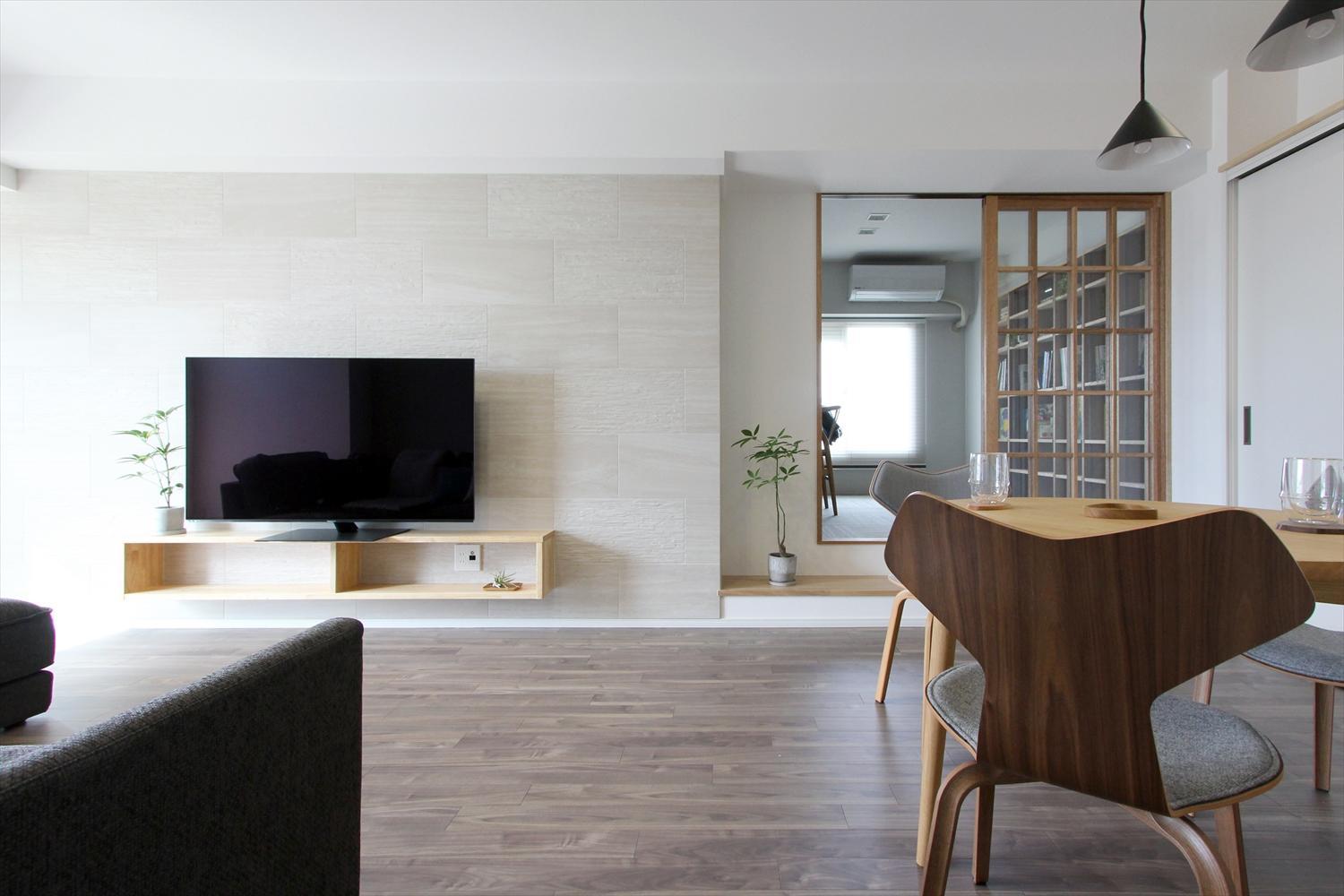 今回のリノベーションはくすんだブルーやグレーをアクセントカラーに用いたシンプルな北欧テイストとグレージュのコンビネーション。奥様こだわりの素材感のある優しいベージュカラーの石目タイルを貼ったアクセント壁。造作のテレビボードも備え、家族が集うLDKの中心となりました。ご主人がサイズと質感にとことんこだわったダークグレーのソファ。4人家族全員をゆったりと包み込む、理想的なくつろぎ空間になりました。さらに後日、ヘッドレストも追加されました。今頃きっと、極上の座り心地を家族みんなで味わっていることでしょう。リビングから二段上がった位置にあるガラス格子の先の書斎エリア。そんな広がりや奥行きも含めて、ゆとりを感じるLDK空間となっています。オーナーご夫婦が一番こだわったのは、グレージュ(グレー+ベージュ)のフローリング(LIXILラシッサDラテオ/ウォルナット)。今年も引き続き人気のカラーは、空間全体をほどよいグレージュカラーでまとめることで、透明感のある空間に。さらに高機能で防音L45をクリアしています。