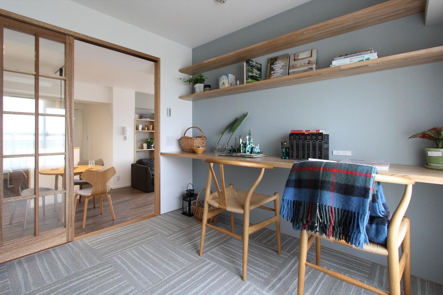 もともと畳だったスペースは、小上がりの書斎に。全体のトーンに合わせた優しいグレーのタイルカーペットにすることで、ちょっとモダンに。白をベースに、アクセントカラーのくすんだブルー&グレーの壁に、ガラス格子やタモの木目が印象的なブックシェルフなど、『北欧テイスト×和モダン』な書斎空間になりました。なお、今回のリノベーションではすべてのサッシに内窓(LIXILインプラス)を追加し、断熱性能が飛躍的に向上しました。デザイン性だけでなく、住み心地にも配慮したご提案をしています。